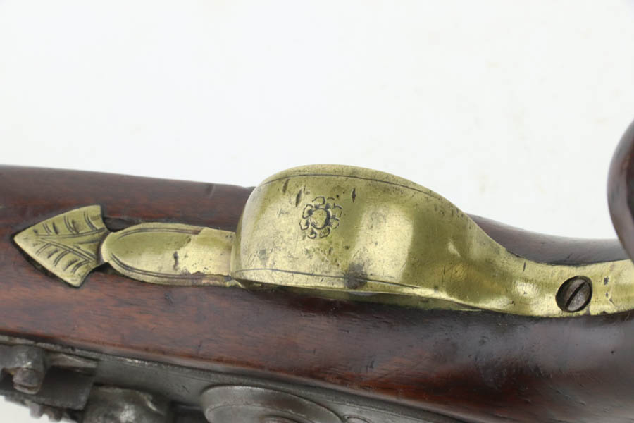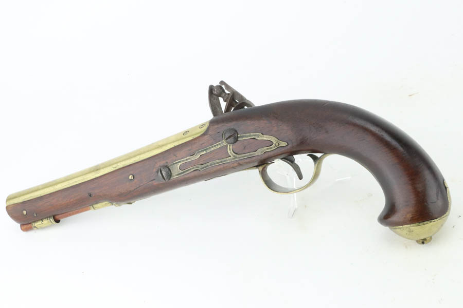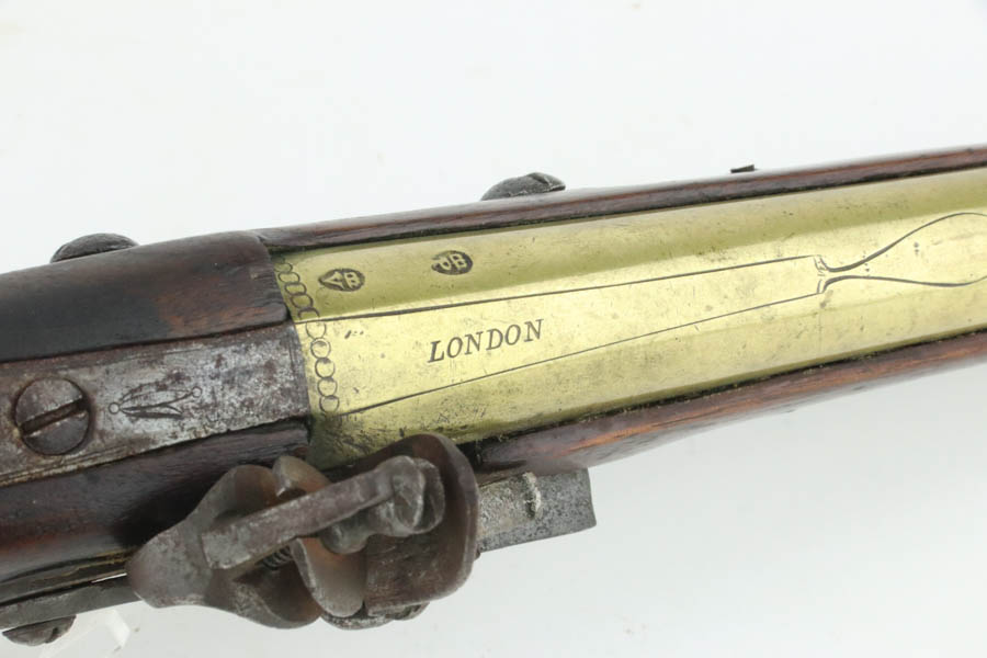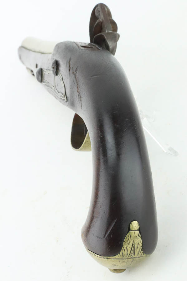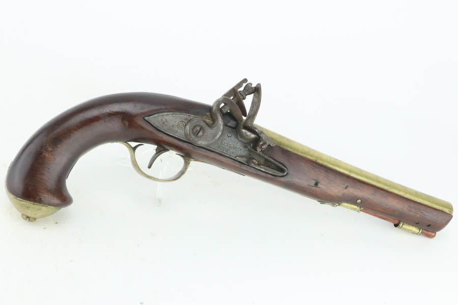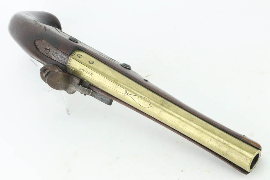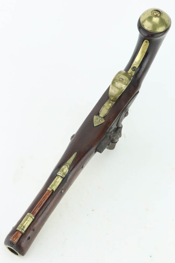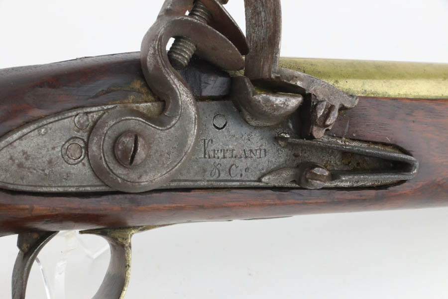 8/9/24 – This is a Ketland & Co British Flintlock pistol. Specifically produced in England for the North American Fur Trade, these Trade pistols were intended for the use of the Trappers and the Native American population as well. The right side of the lock reads KETLAND & Co., with LONDON stamped on the top of the barrel. British “Crown P” and “Crown V” proofs on the barrel as well. Thomas Ketland was a highly successful Birmingham gun maker. He started working about 1740, and founded his own business around 1760, which then expanded into the export market around 1790. His business continued following his death in 1816, eventually ceasing operations in 1821. This one is in nice condition overall with honest “attic patina” on the metal parts. The flint is missing. The bore is nice overall but shows obvious signs of age. Very nice wood furniture for its age. Fully functional. No FFL required.