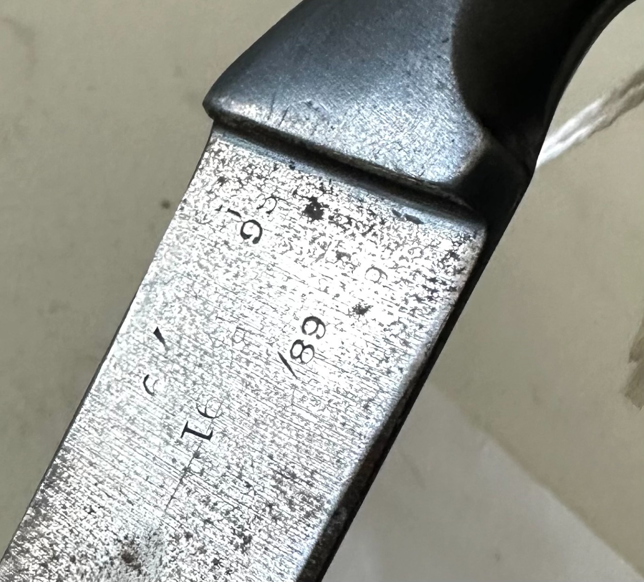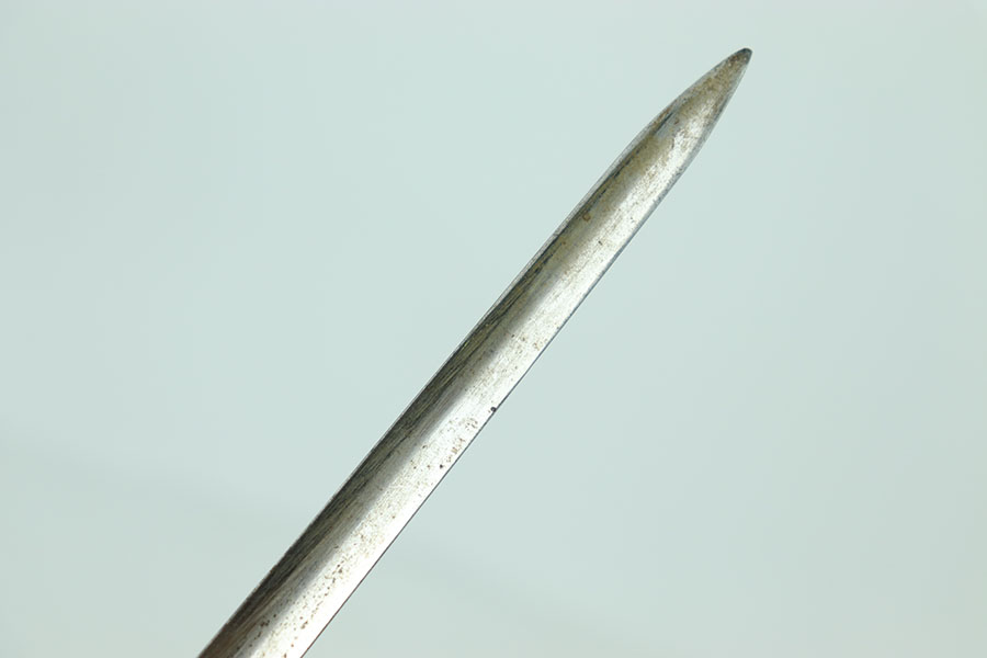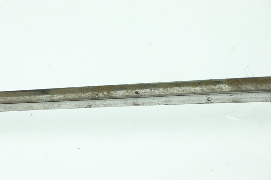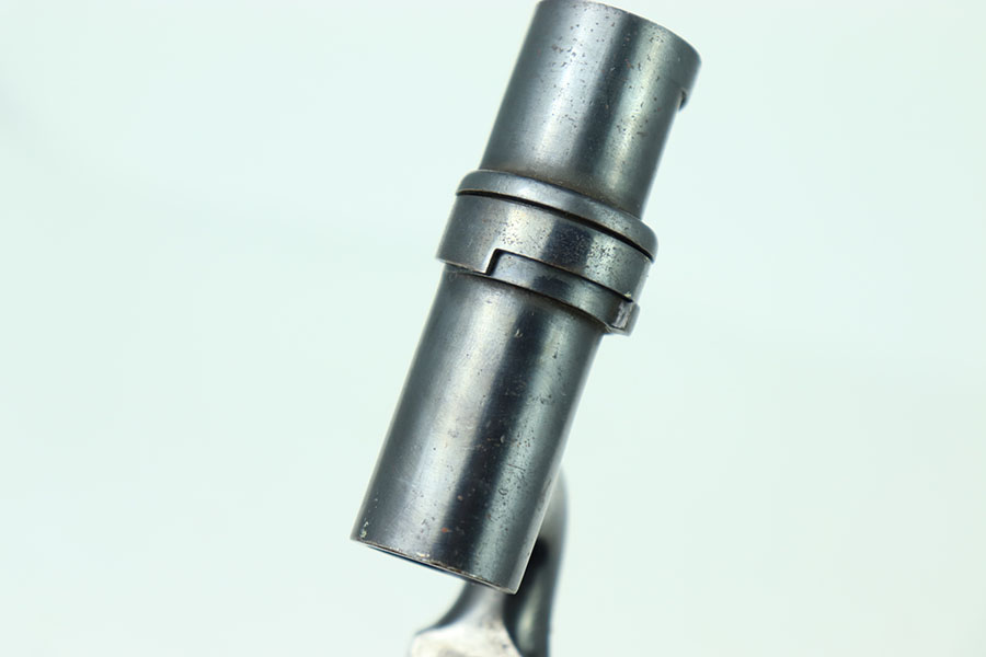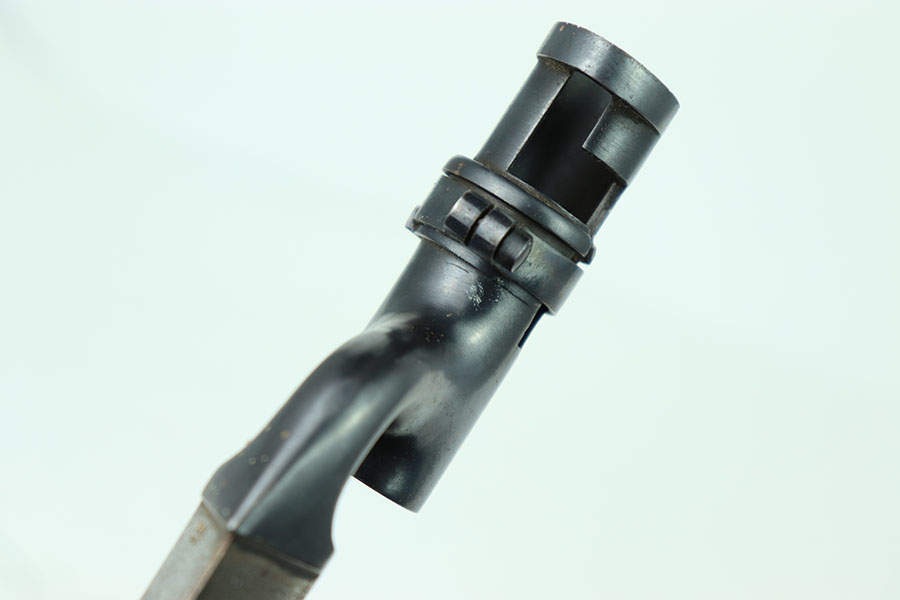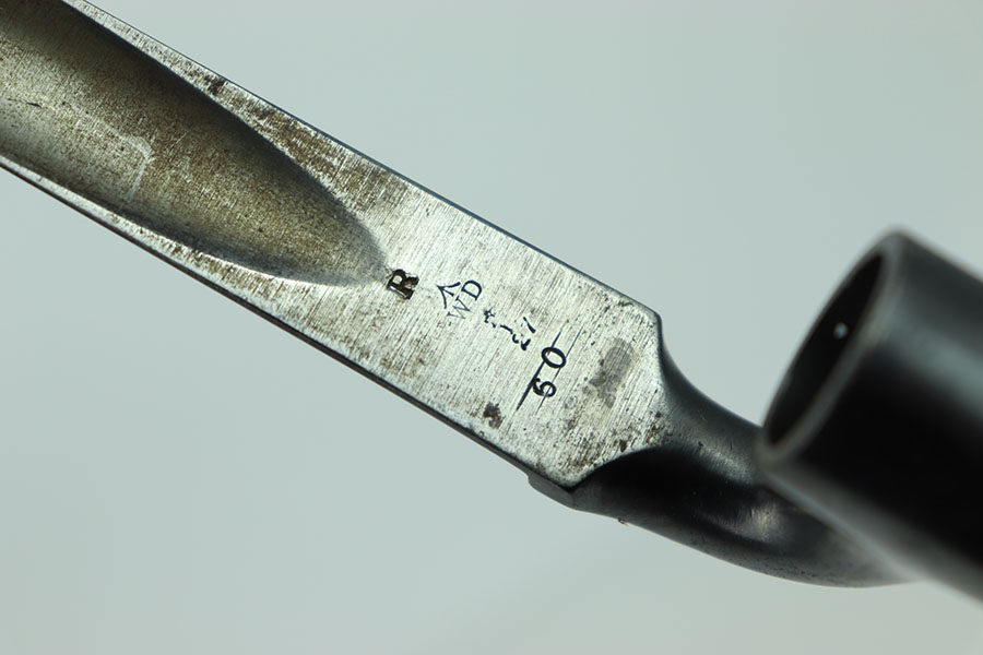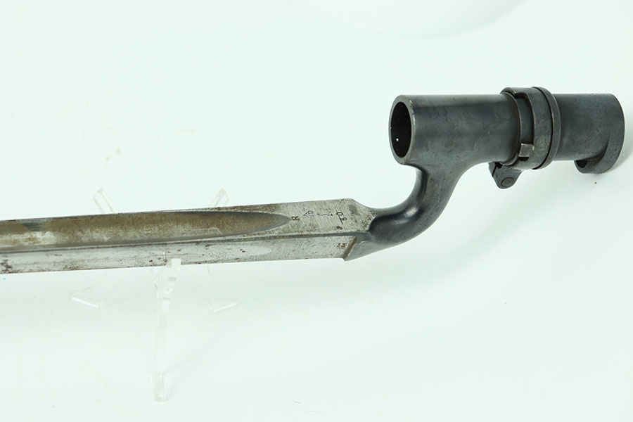 5/16/24 – This is a great example of an original British Martini-Henry 1876 Spike Bayonet. This bayonet has nice smooth edges with no dings or divot. There is some consistent oxidation throughout the faces of the spike. The beginning of the spike is marked on all three sides. The blued surface that mounts to the rifle is in excellent shape with very little wear, the locking mechanism spins smoothly.