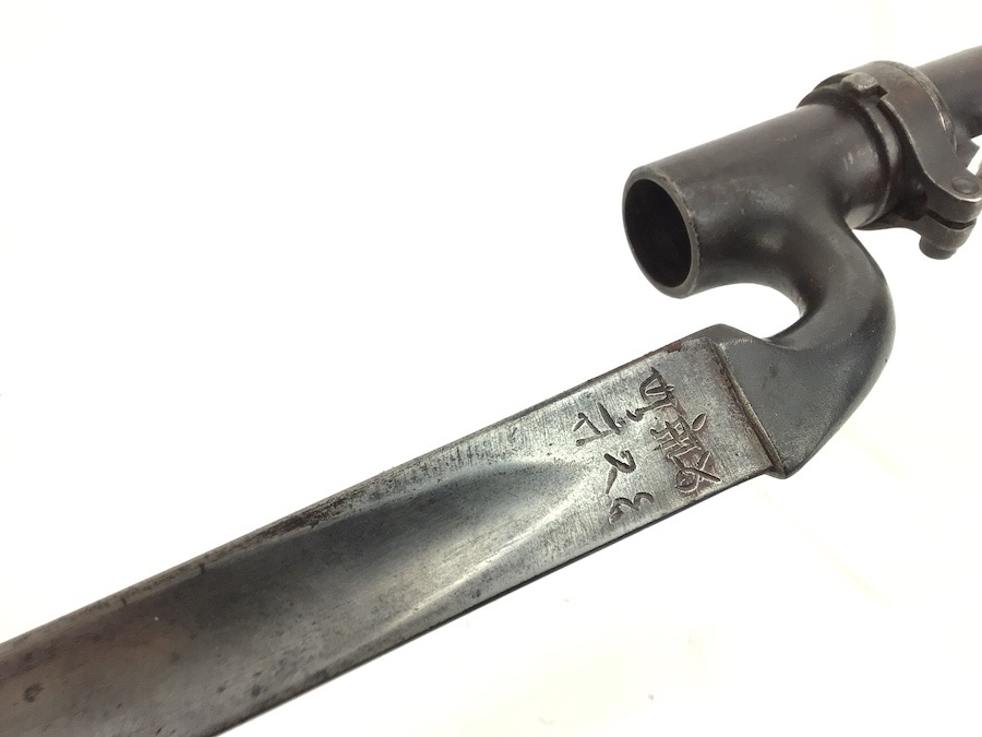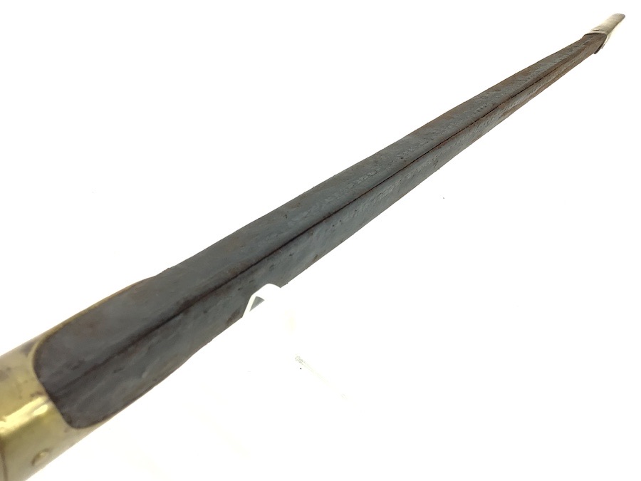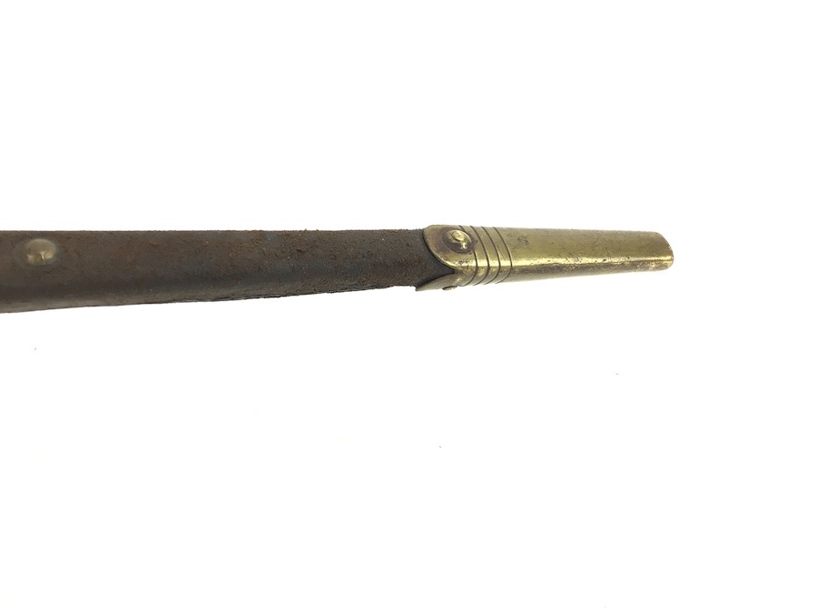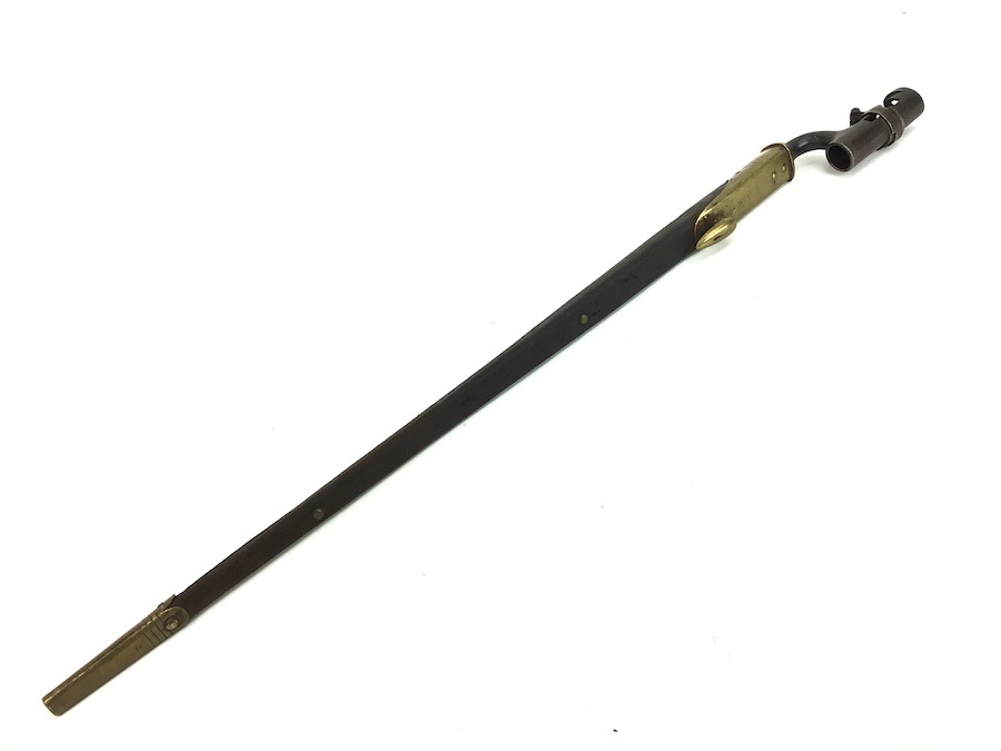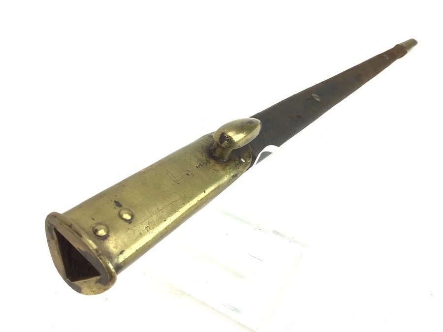 5/30/24 – Original and great condition. British Martini-Henry 1876 Spike Bayonet with leather scabbard. This 21″ bayonet has nice smooth edges with no dings or chips. There is some surface patina throughout the faces of the spike, but no corrosion. There are British and Nepalese Markings on all three sides near the hilt. Fully functional socket. The original leather scabbard has brass accents that are fully intact. There is some minor wear near the tip. The back spine of the scabbard shows some missing stitching, but it still stays closed and holds it shape well.