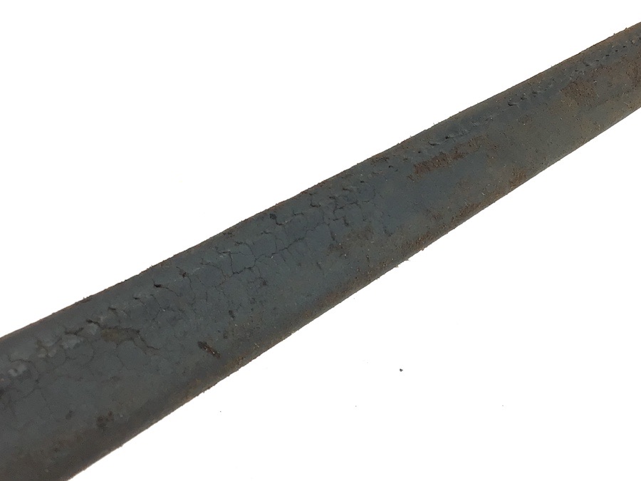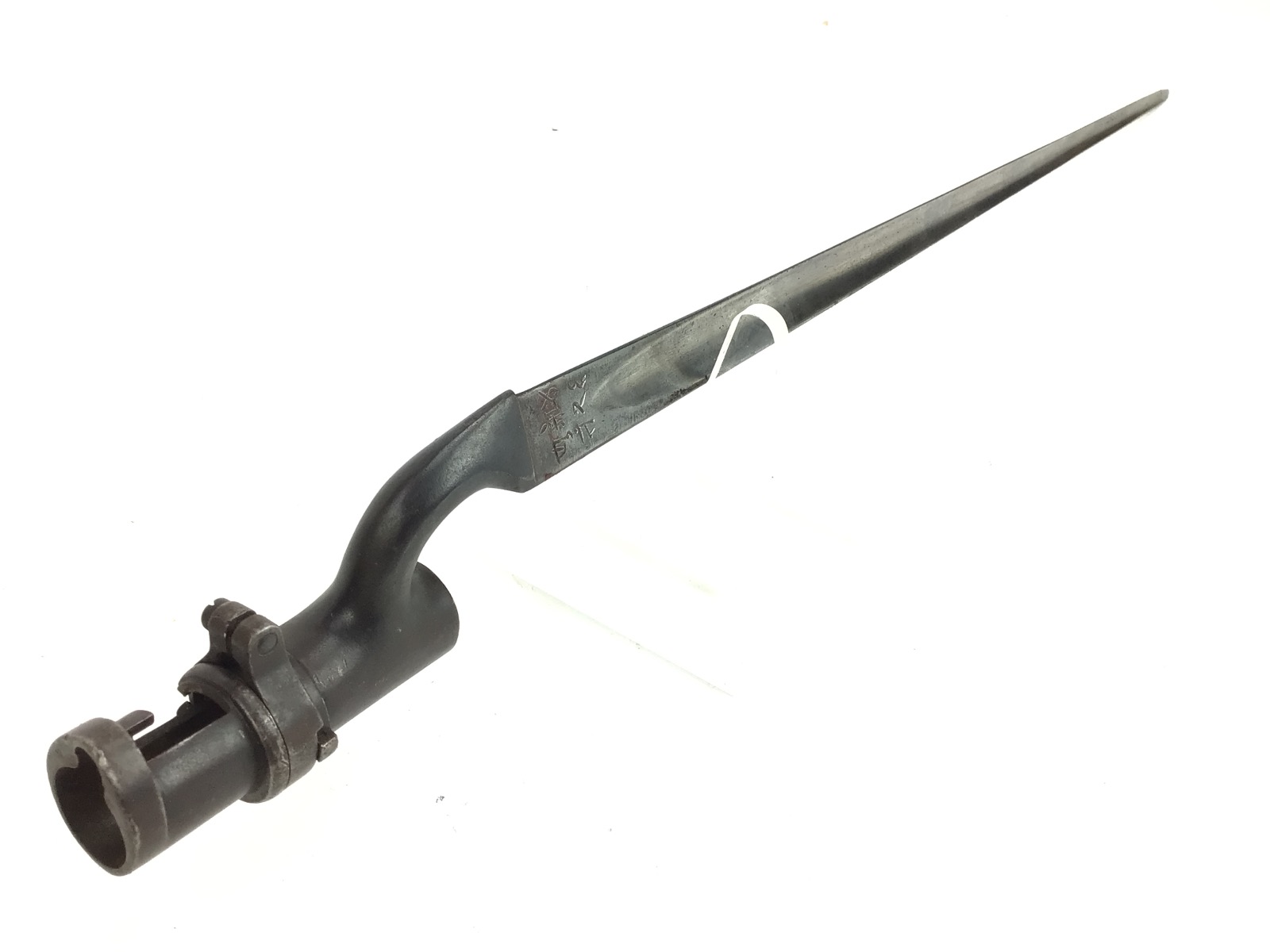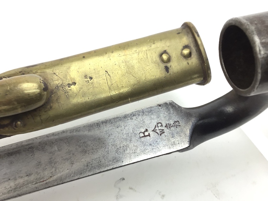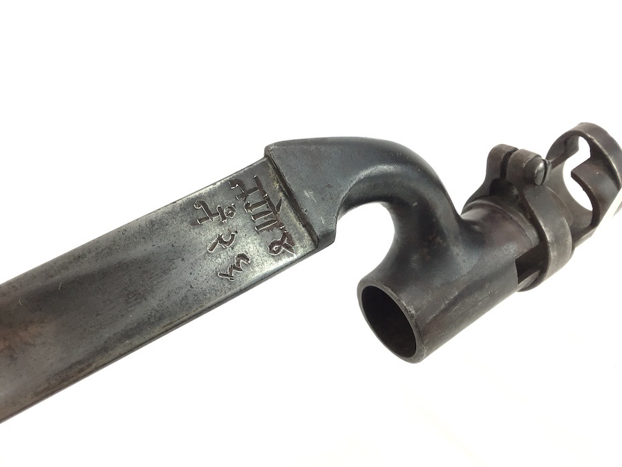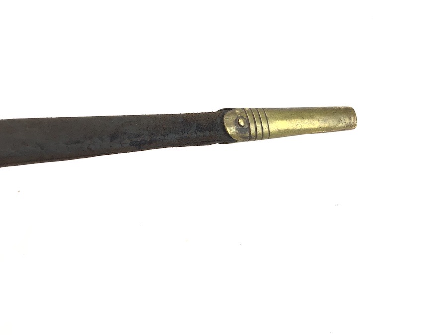 5/30/24 – Original and great condition. British Martini-Henry 1876 Spike Bayonet with leather scabbard. This 21″ bayonet has nice smooth edges with no dings or chips. There is some surface patina throughout the faces of the spike, but no corrosion. There are British and Nepalese Markings on all three sides near the hilt. Fully functional socket. The original leather scabbard has brass accents that are fully intact. There is some minor wear near the tip. The back spine of the scabbard shows some missing stitching, but it still stays closed and holds it shape well.
