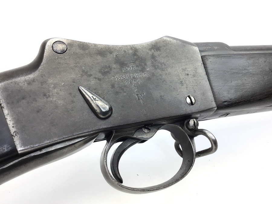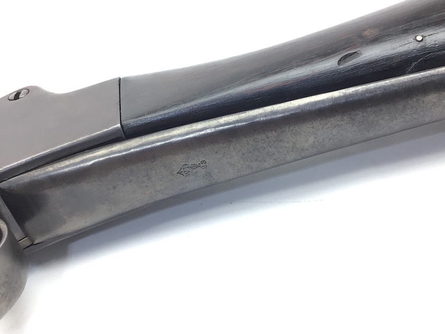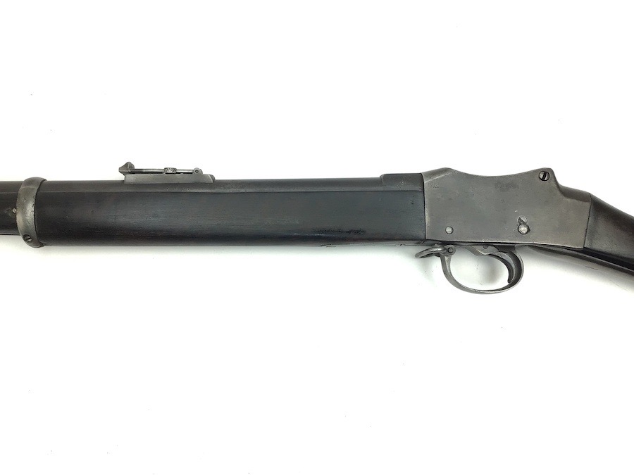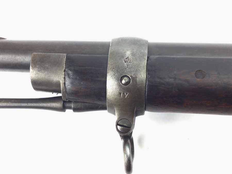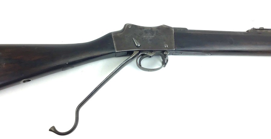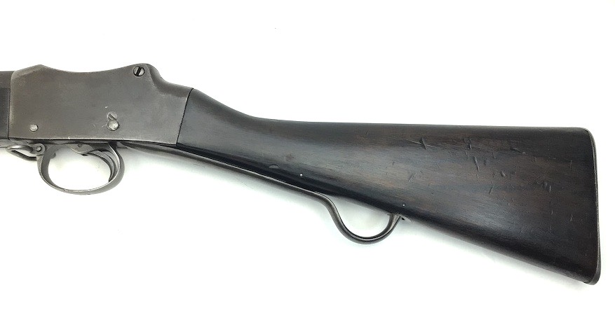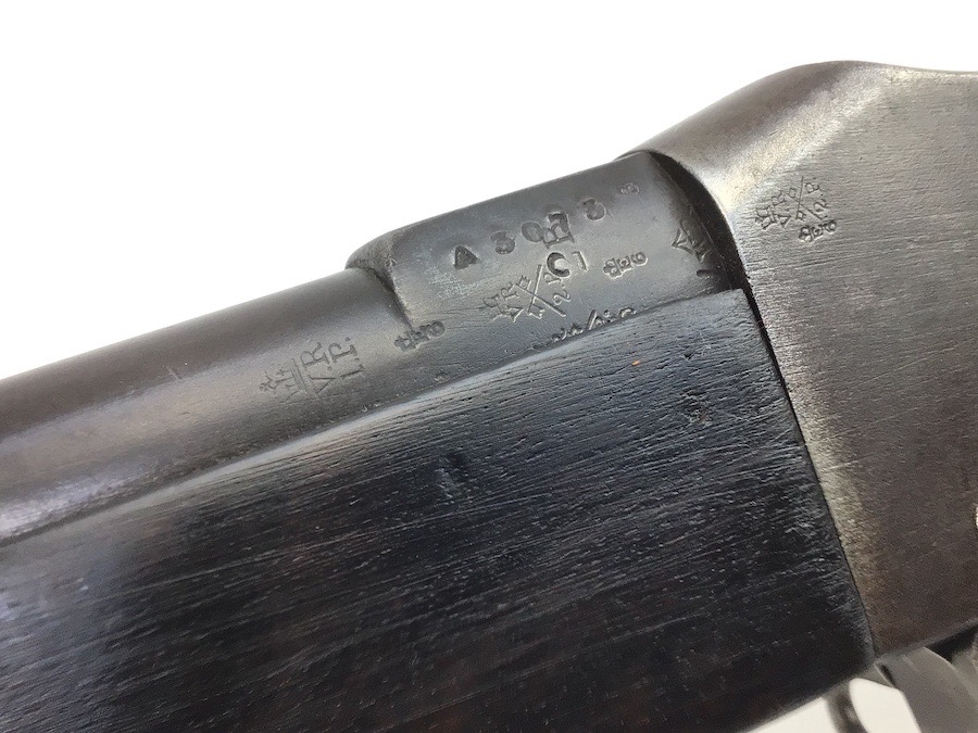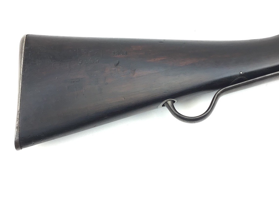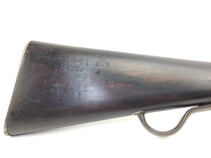 7/20/23 – This is an Enfield Martini-Henry Mk IV rifle issued to the British military in 1886. This rifle was part of a discovery of antique firearms in the royal palace of Nepal. This Pattern ‘C’ is the long handle variation which greatly enhanced the ejection of the spent cartridges. Approximately 100,000 Pattern C Mk IV Martini-Henrys’ were produced. Enfield maker stamped on the left side along with the date of 1886. Proof stamped throughout. Original finish has a beautiful patina that has aged well, with only minor pitting in a few small areas. Stock show’s honest use wear with typical dings and dents. There is a minor crack on the bottom in front of the trigger guard assembly. Bore rates a solid 8 of 10 with no pitting. Action is smooth and tight and is fully functional. This rifle comes complete with a Mark III Sword bayonet with a steel fitted leather scabbard. No FFL required.