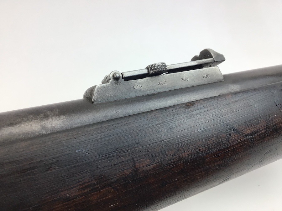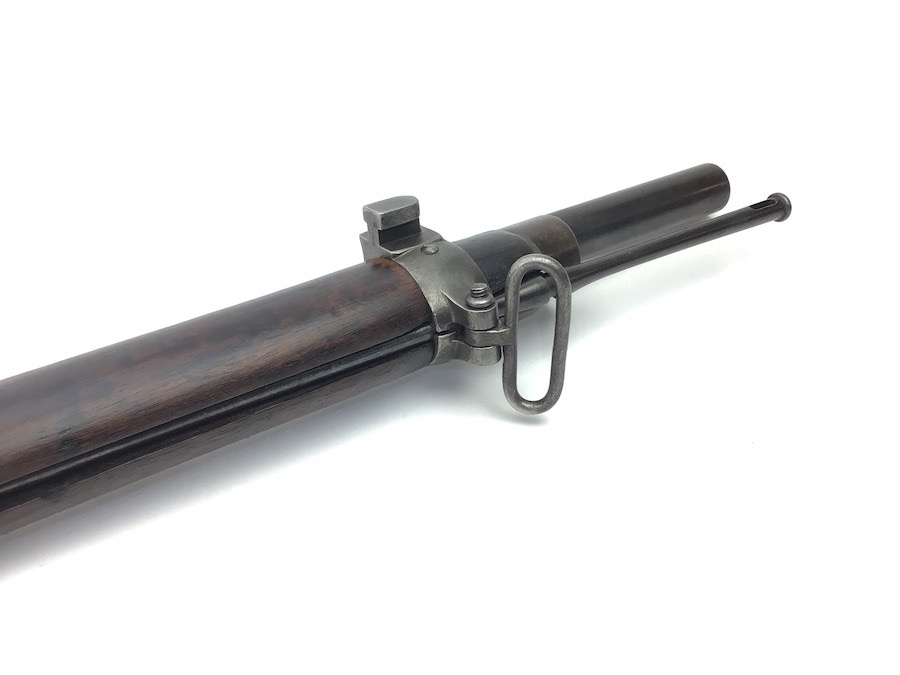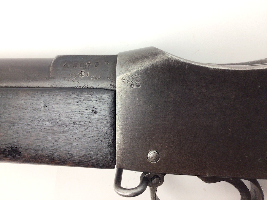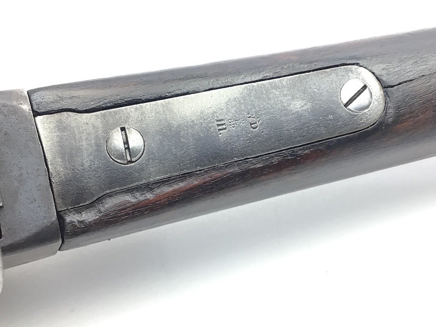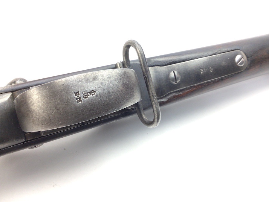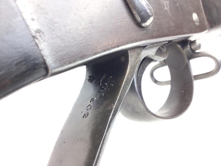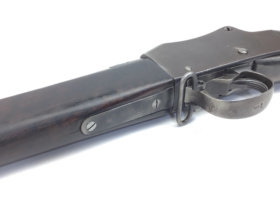 7/20/23 – This is an Enfield Martini-Henry Mk IV rifle issued to the British military in 1886. This rifle was part of a discovery of antique firearms in the royal palace of Nepal. This Pattern ‘C’ is the long handle variation which greatly enhanced the ejection of the spent cartridges. Approximately 100,000 Pattern C Mk IV Martini-Henrys’ were produced. Enfield maker stamped on the left side along with the date of 1886. Proof stamped throughout. Original finish has a beautiful patina that has aged well, with only minor pitting in a few small areas. Stock show’s honest use wear with typical dings and dents. There is a minor crack on the bottom in front of the trigger guard assembly. Bore rates a solid 8 of 10 with no pitting. Action is smooth and tight and is fully functional. This rifle comes complete with a Mark III Sword bayonet with a steel fitted leather scabbard. No FFL required.