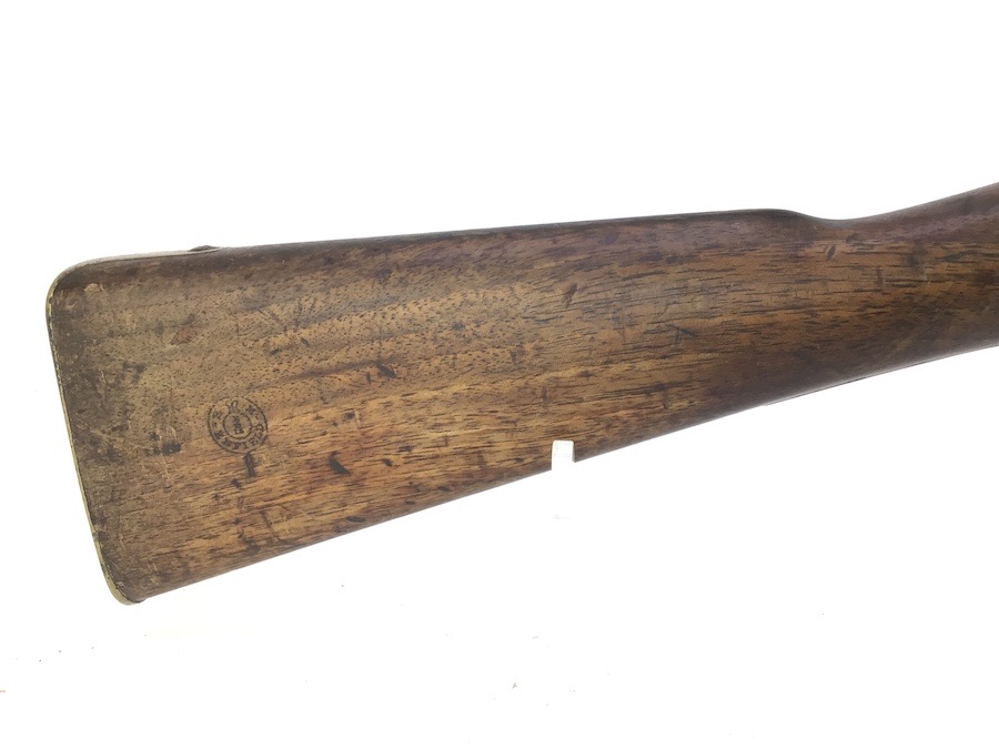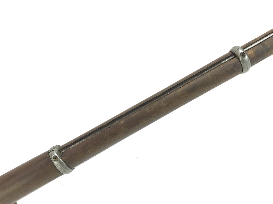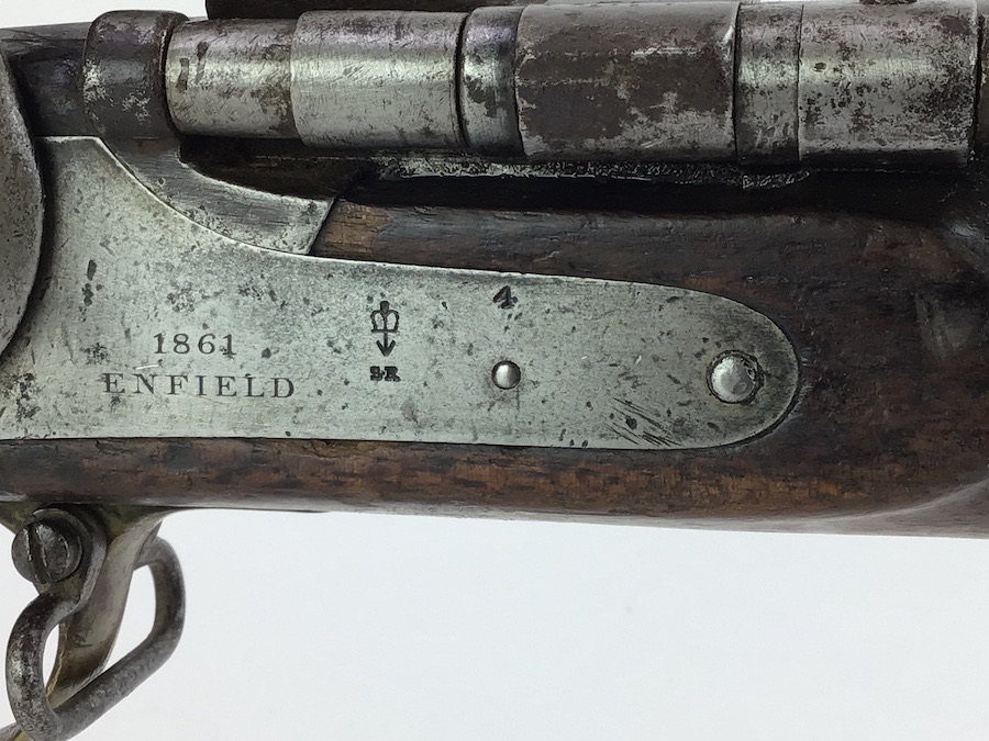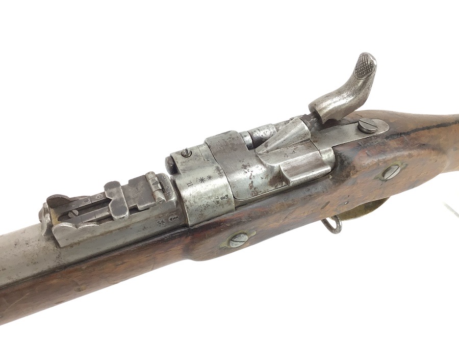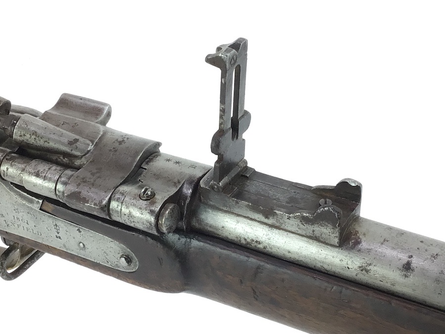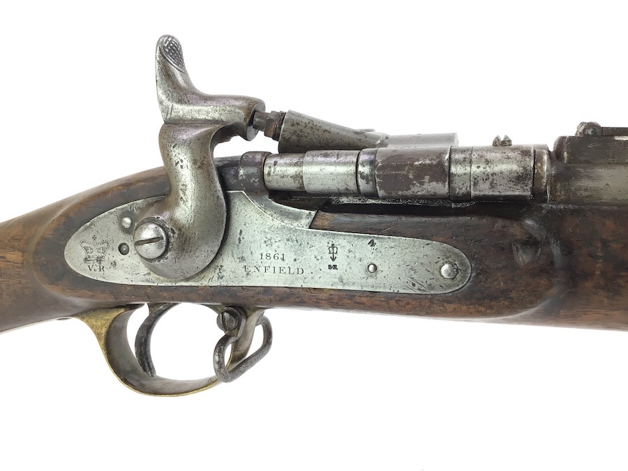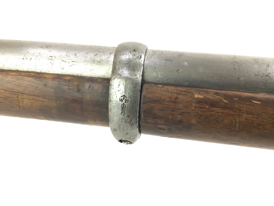 10/22/24 – Original and good condition. This rifle is 100% all British, manufactured 1861. Dated, Three-Band Snider-Enfield rifle, with a great looking patina. This rifle started life in 1861 as a .577 caliber three band ENFIELD Percussion Rifle model of P-1853. The lock plate is stamped “CROWN” over V.R. and ENFIELD / 1861, indicating manufacture at the Royal Small Arms factory at Enfield Lock. This was a military issue, as indicated by the Royal Cypher monogram. It also has the correct CROWN / BROAD ARROW “lock viewer’s” mark and additional proofs as well on the lock plate. The barrel has British markings and proof marks throughout. Enfield cartouche stamped on the right side of the buttstock. Overall there is a fair amount of rust pitting that has been cleaned. There is the correct II * * stamped on top of the breech ring, indicating it is the MkII** version of the breech. Three groove rifling looks good in the bore and rates about a 6 of 10. Fully functional and includes original cleaning rod. No FFL required.