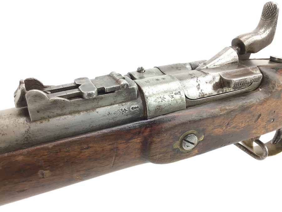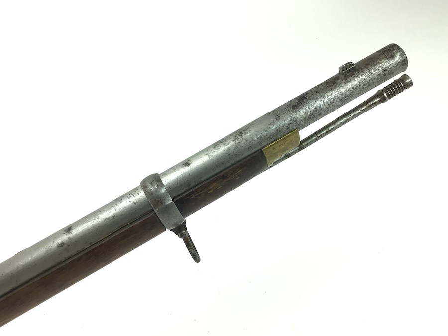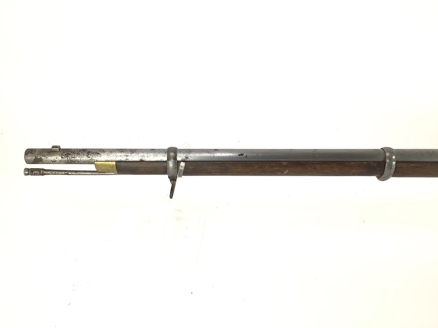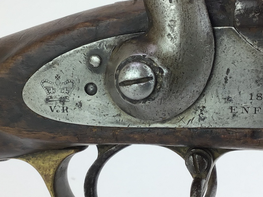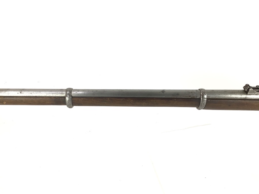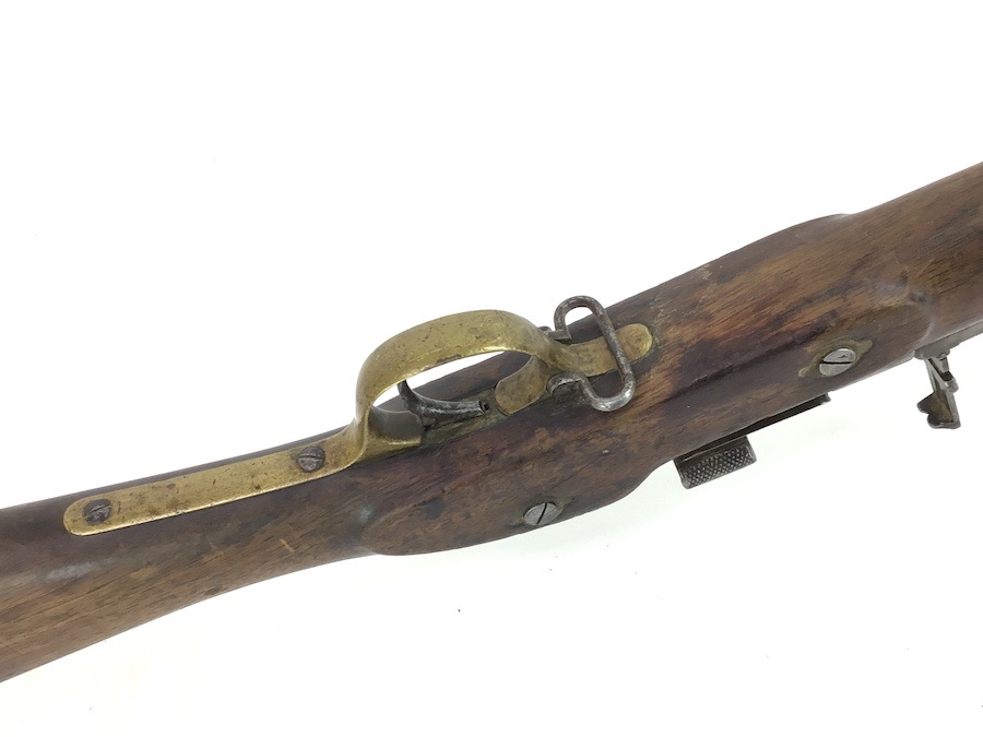 10/22/24 – Original and good condition. This rifle is 100% all British, manufactured 1861. Dated, Three-Band Snider-Enfield rifle, with a great looking patina. This rifle started life in 1861 as a .577 caliber three band ENFIELD Percussion Rifle model of P-1853. The lock plate is stamped “CROWN” over V.R. and ENFIELD / 1861, indicating manufacture at the Royal Small Arms factory at Enfield Lock. This was a military issue, as indicated by the Royal Cypher monogram. It also has the correct CROWN / BROAD ARROW “lock viewer’s” mark and additional proofs as well on the lock plate. The barrel has British markings and proof marks throughout. Enfield cartouche stamped on the right side of the buttstock. Overall there is a fair amount of rust pitting that has been cleaned. There is the correct II * * stamped on top of the breech ring, indicating it is the MkII** version of the breech. Three groove rifling looks good in the bore and rates about a 6 of 10. Fully functional and includes original cleaning rod. No FFL required.