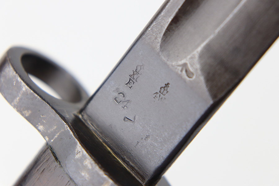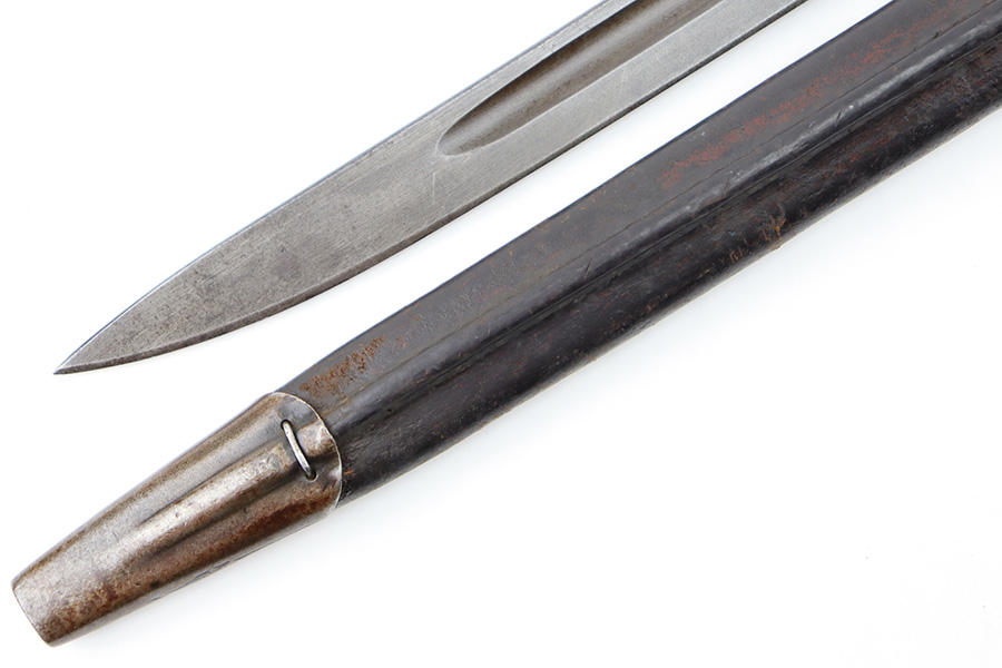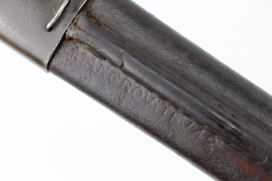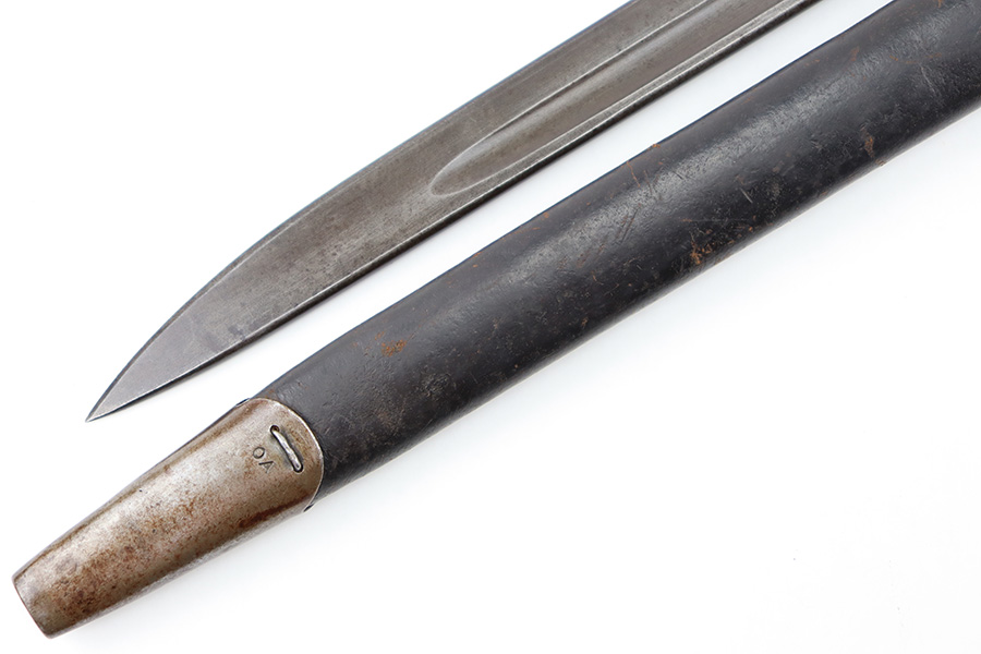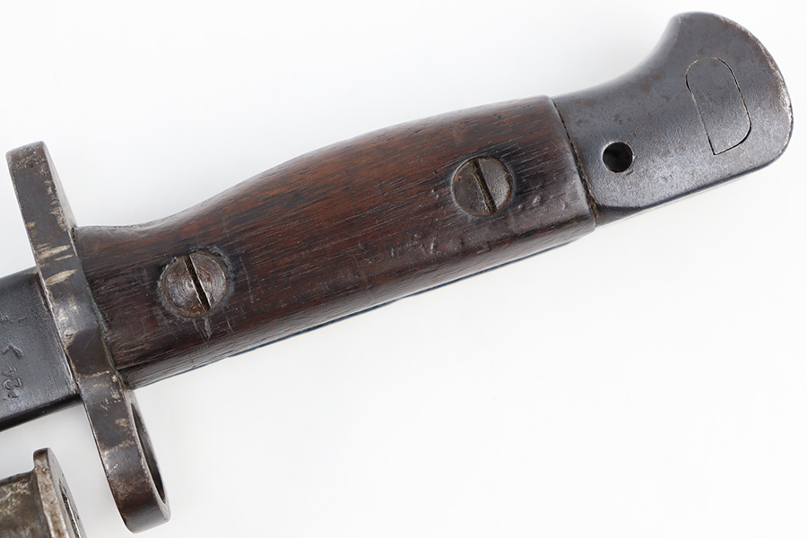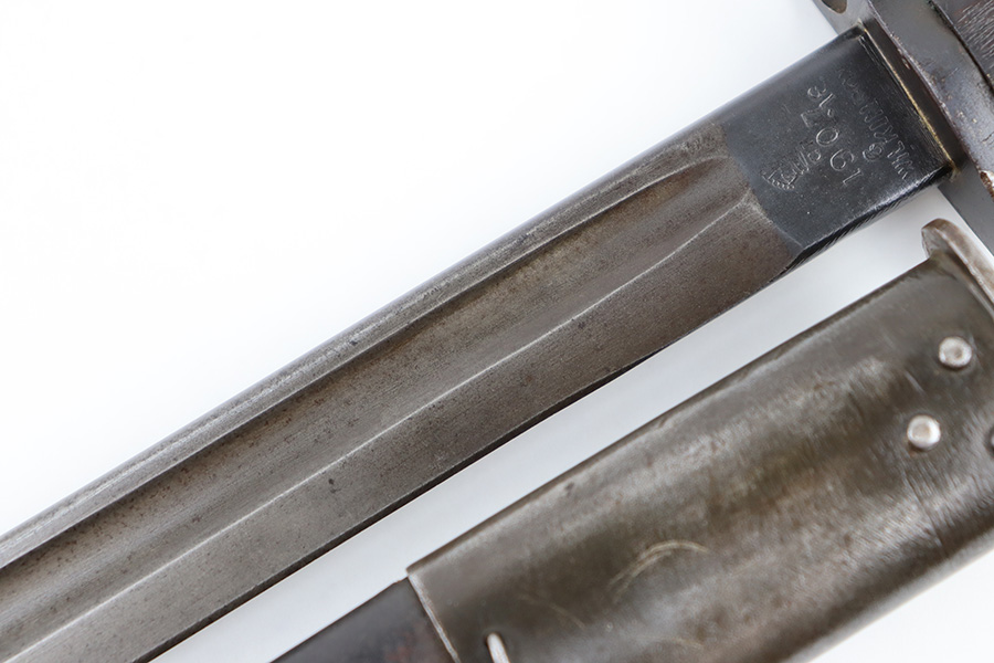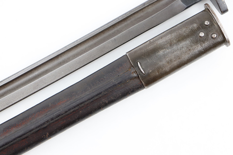 8/28/23 – This is an original WW1 era production P1907 Enfield bayonet. The bayonet comes with a 1942 dated WW2 issued scabbard. The bayonet blade is in near-excellent condition with no major issues and a mild patina throughout. No signs of excessive use or sharpening. Proof stamped and maker stamped on the base of the blade as shown. Some mild finish loss on the cross guard and pommel, and the original wood grips are excellent. The scabbard is maker stamped and dated on one side, as well as proof stamped at the mouth. Some mild surface wear throughout but no major issues.