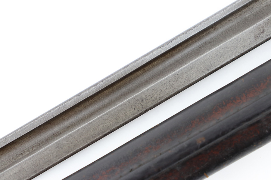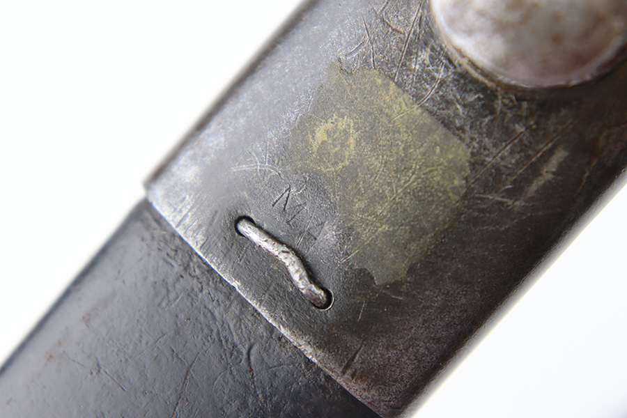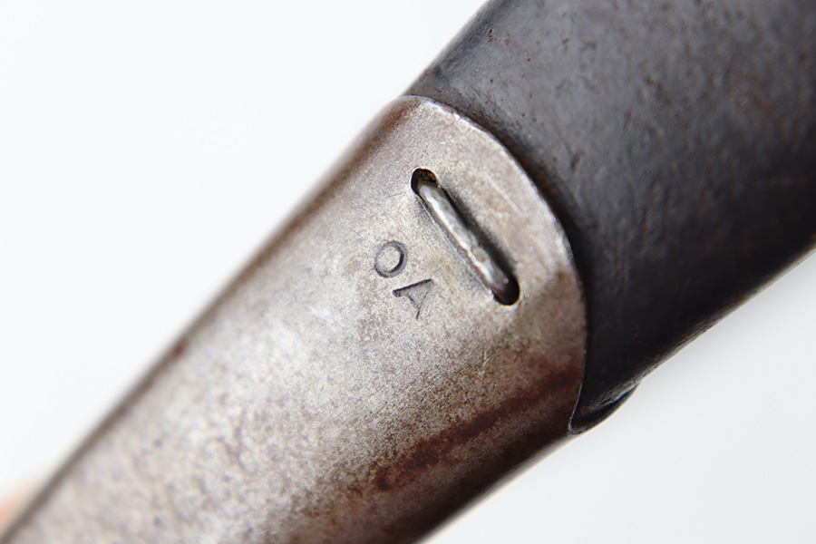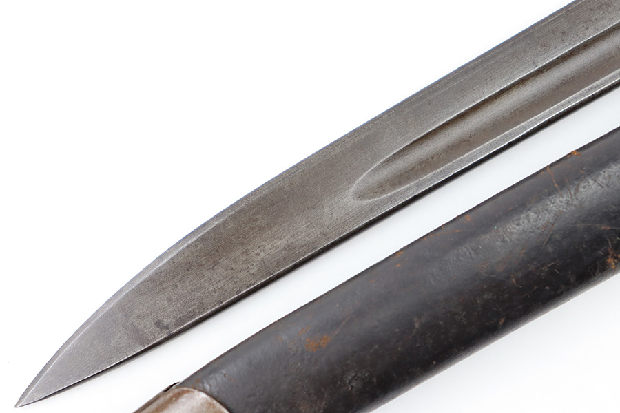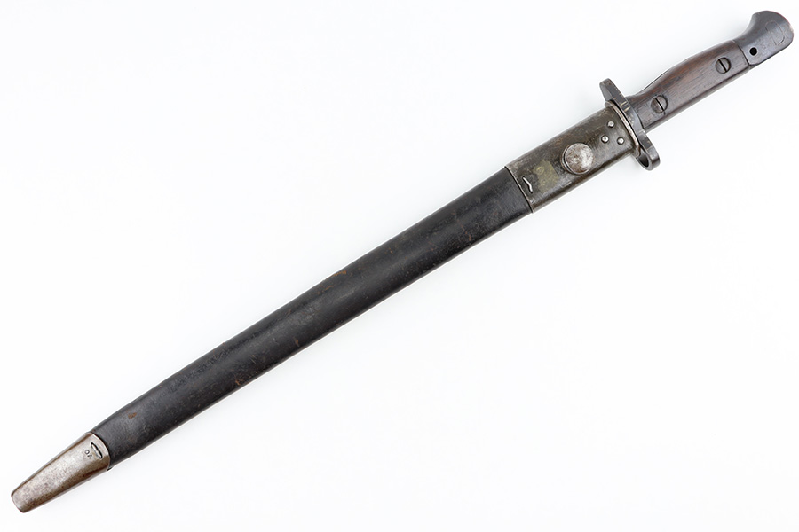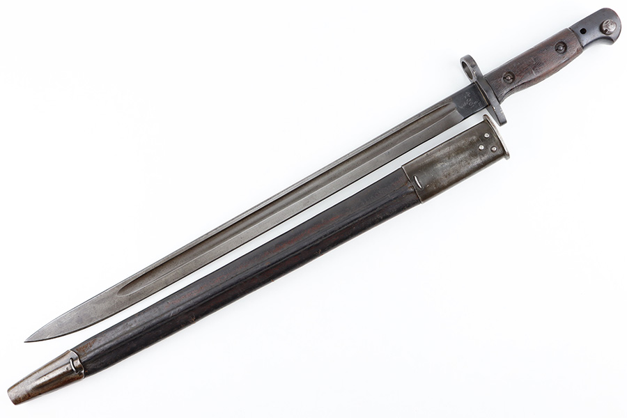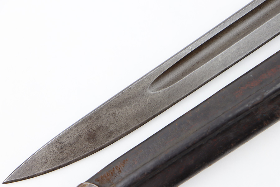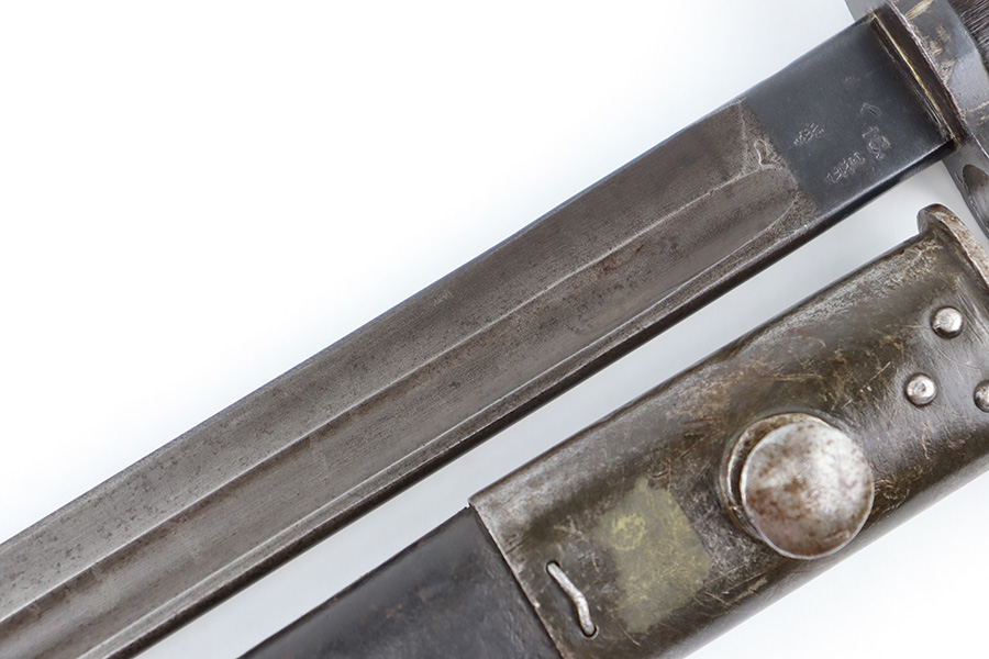 8/28/23 – This is an original WW1 era production P1907 Enfield bayonet. The bayonet comes with a 1942 dated WW2 issued scabbard. The bayonet blade is in near-excellent condition with no major issues and a mild patina throughout. No signs of excessive use or sharpening. Proof stamped and maker stamped on the base of the blade as shown. Some mild finish loss on the cross guard and pommel, and the original wood grips are excellent. The scabbard is maker stamped and dated on one side, as well as proof stamped at the mouth. Some mild surface wear throughout but no major issues.