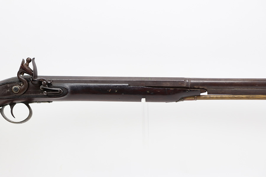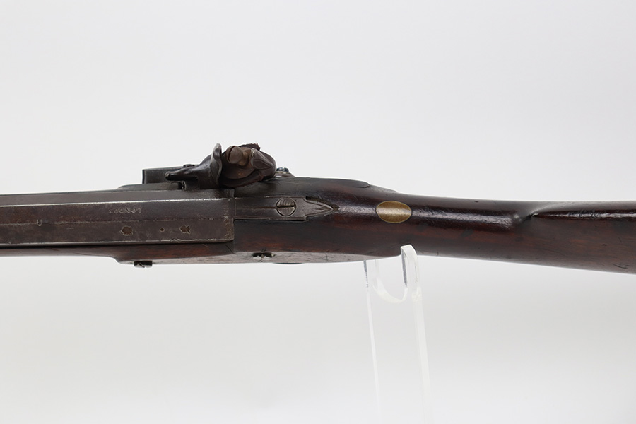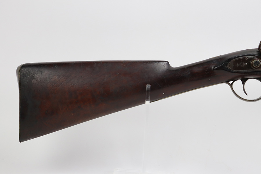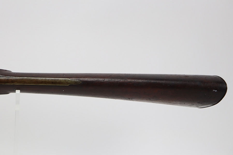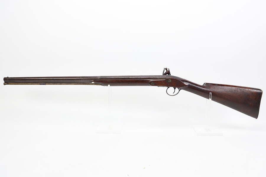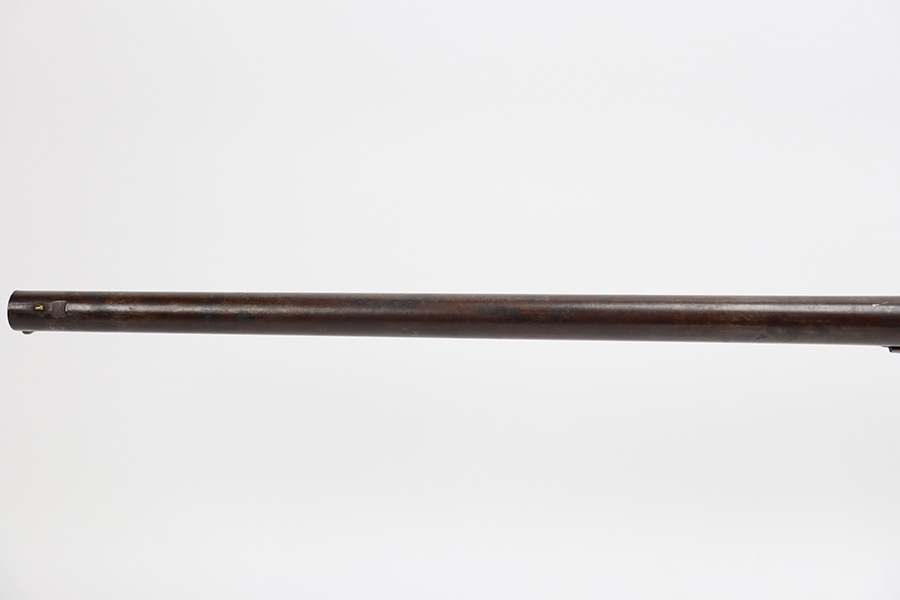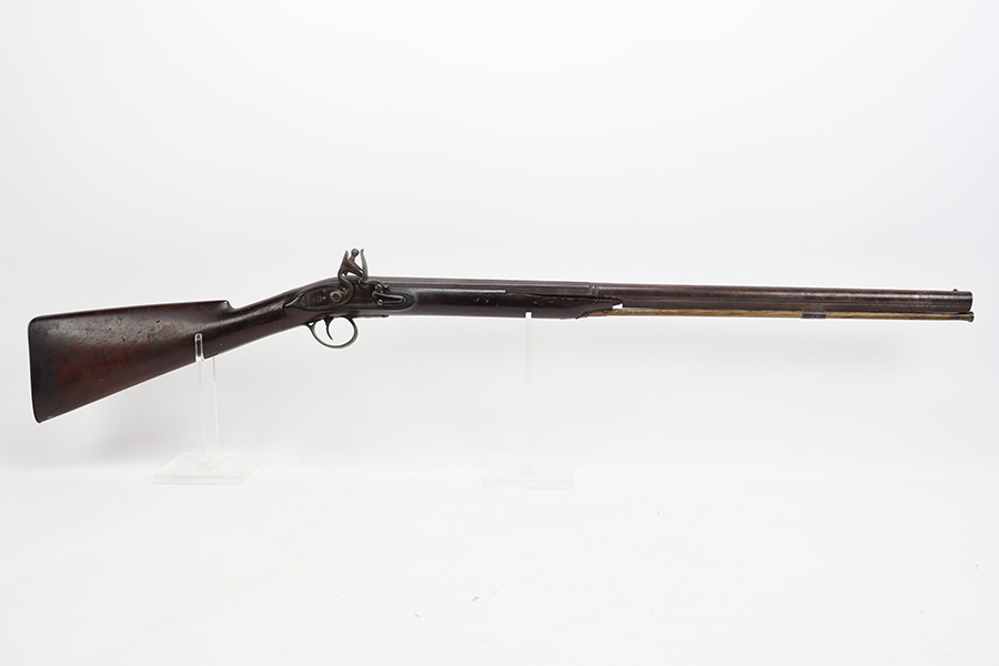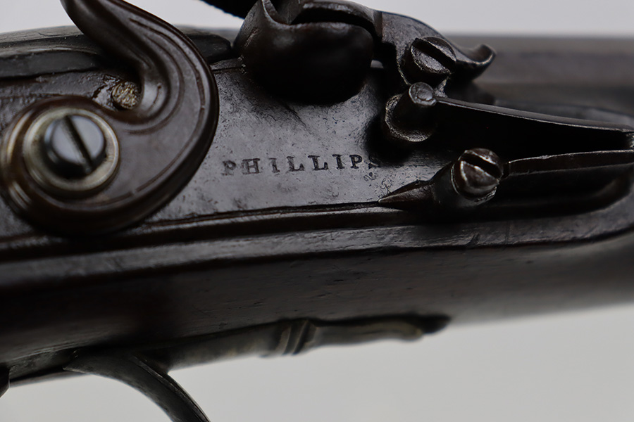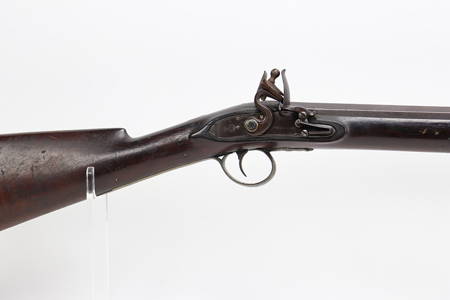 7/25/23 – This is a Phillips Flintlock Naval Shotgun manufactured in the early 1800’s and issued to the British Navy. It has a 27.5″ barrel, round with an octagonal section over the breach marked with the proper Birmingham proofs and “London”. Receiver is maker marked “Phillips”. The metal shows its age and has an even patina throughout, with no signs of rust or pitting. The stock is cracked on the right side, and is missing some pieces. The wood is otherwise in good shape. The shotgun is smoothbore, dark and dirty as expected from black powder. Comes with original ramrod. Antique, so no licensing required.