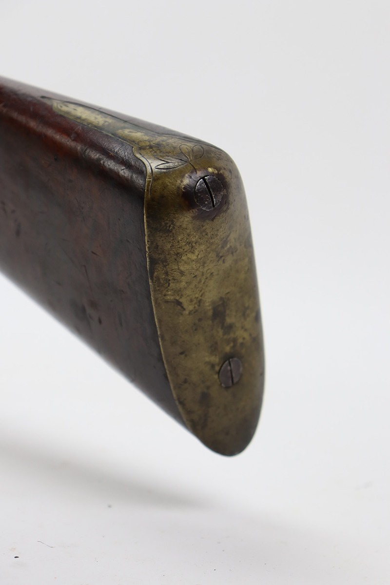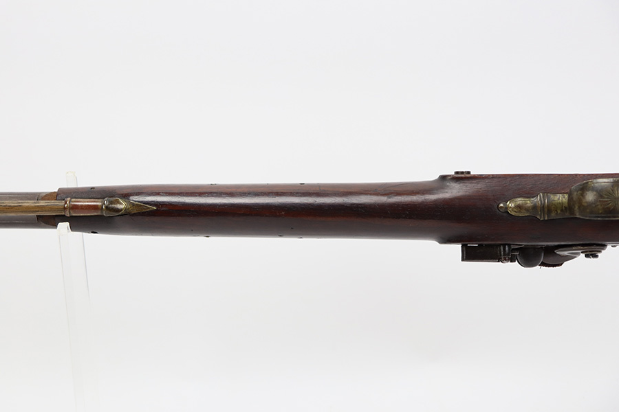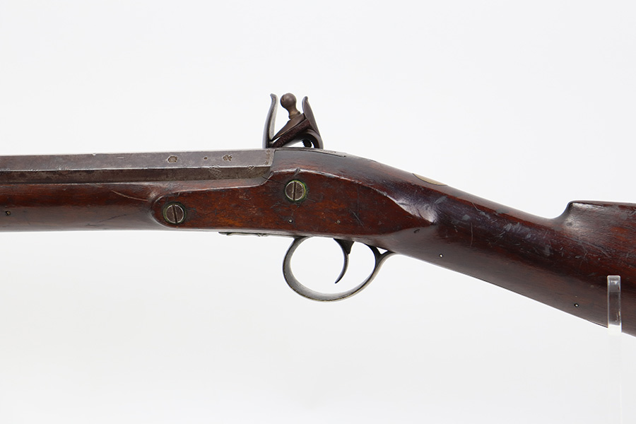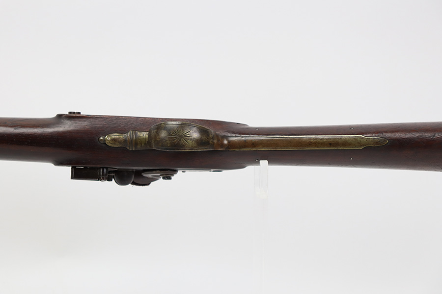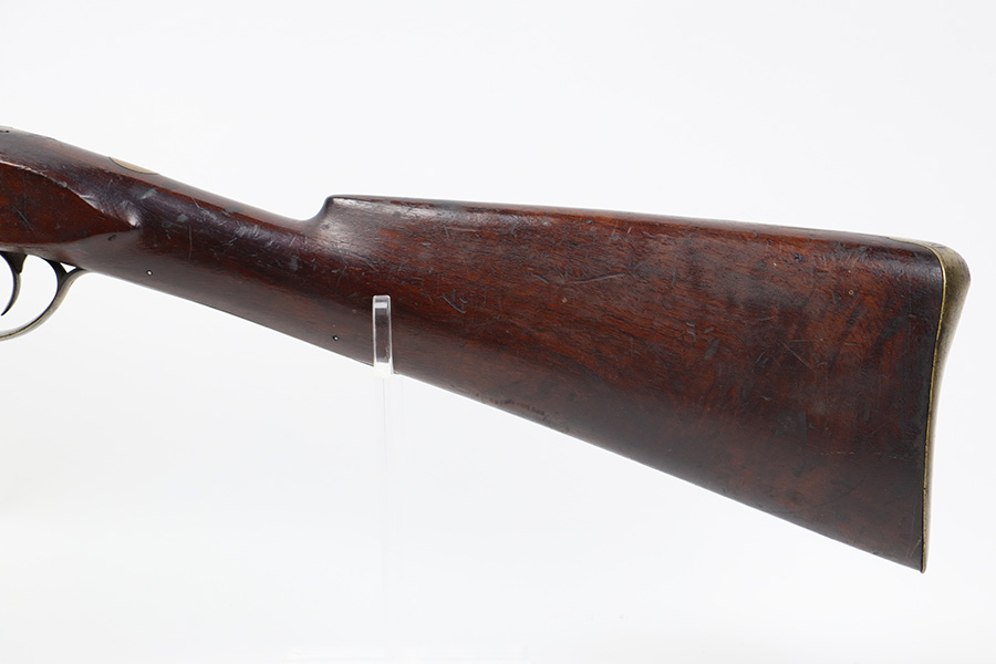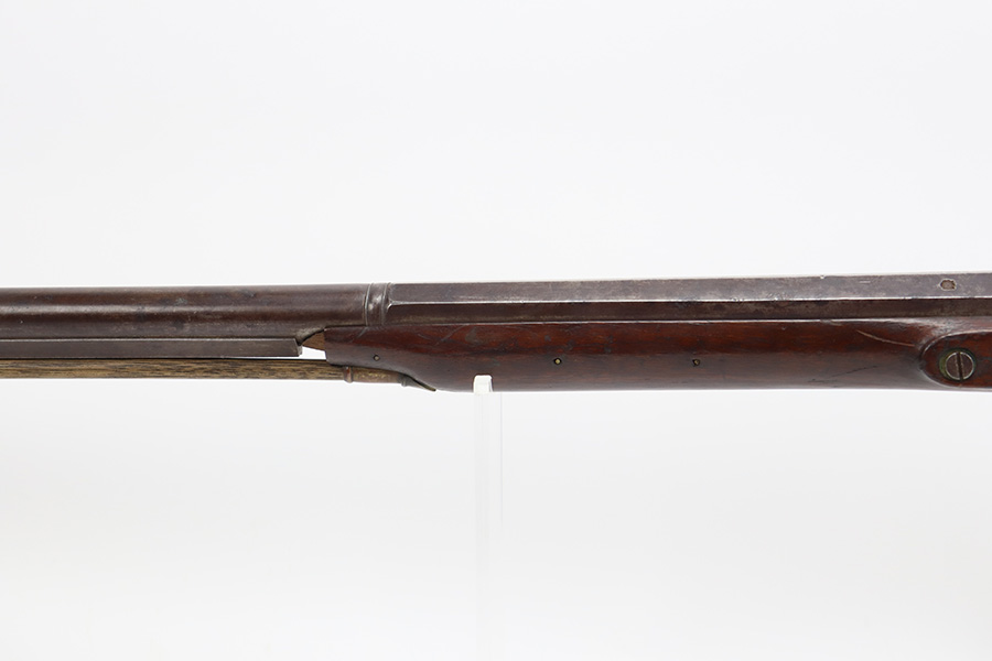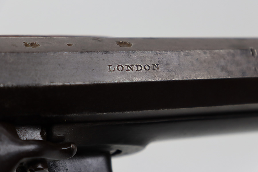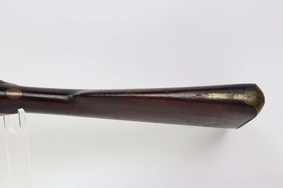 7/25/23 – This is a Phillips Flintlock Naval Shotgun manufactured in the early 1800’s and issued to the British Navy. It has a 27.5″ barrel, round with an octagonal section over the breach marked with the proper Birmingham proofs and “London”. Receiver is maker marked “Phillips”. The metal shows its age and has an even patina throughout, with no signs of rust or pitting. The stock is cracked on the right side, and is missing some pieces. The wood is otherwise in good shape. The shotgun is smoothbore, dark and dirty as expected from black powder. Comes with original ramrod. Antique, so no licensing required.