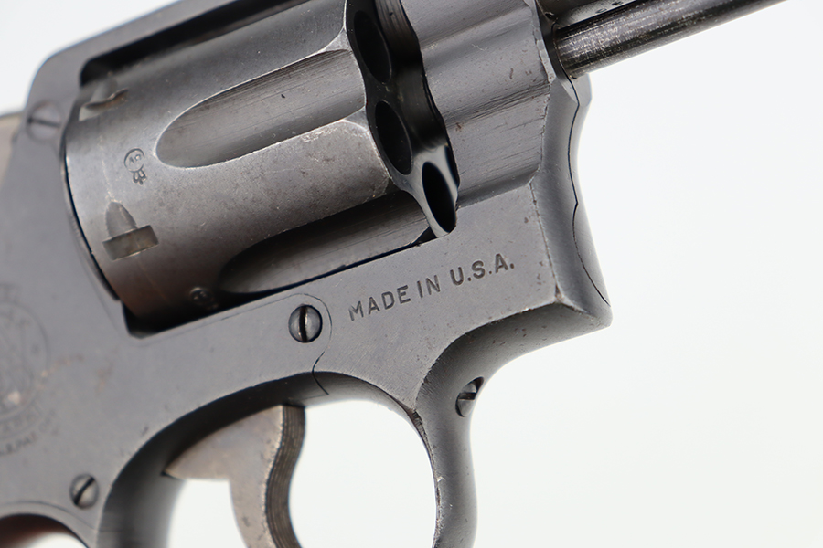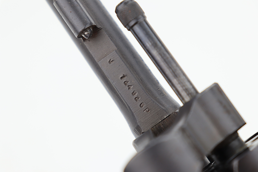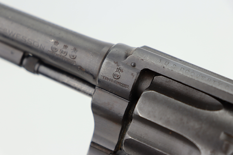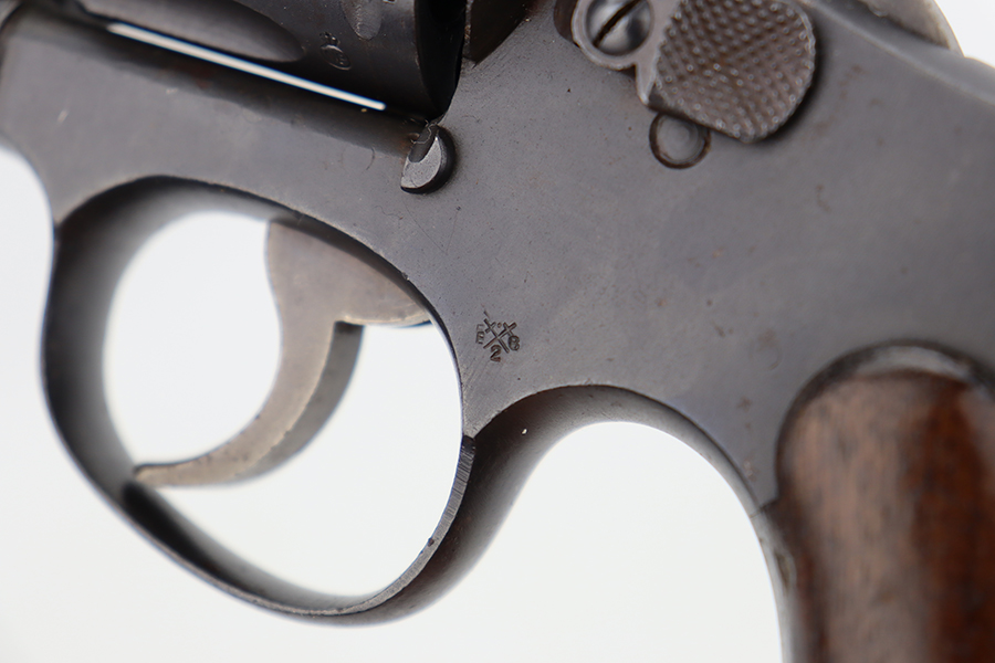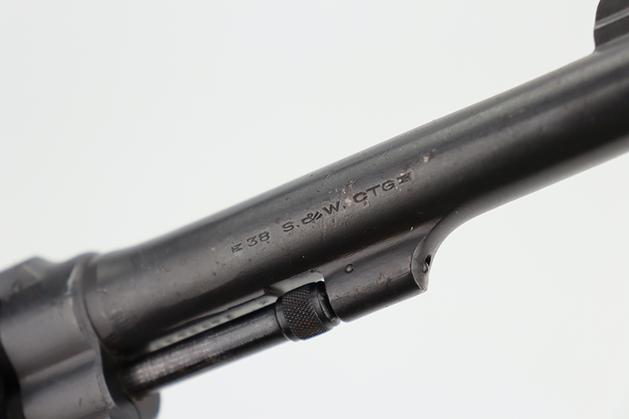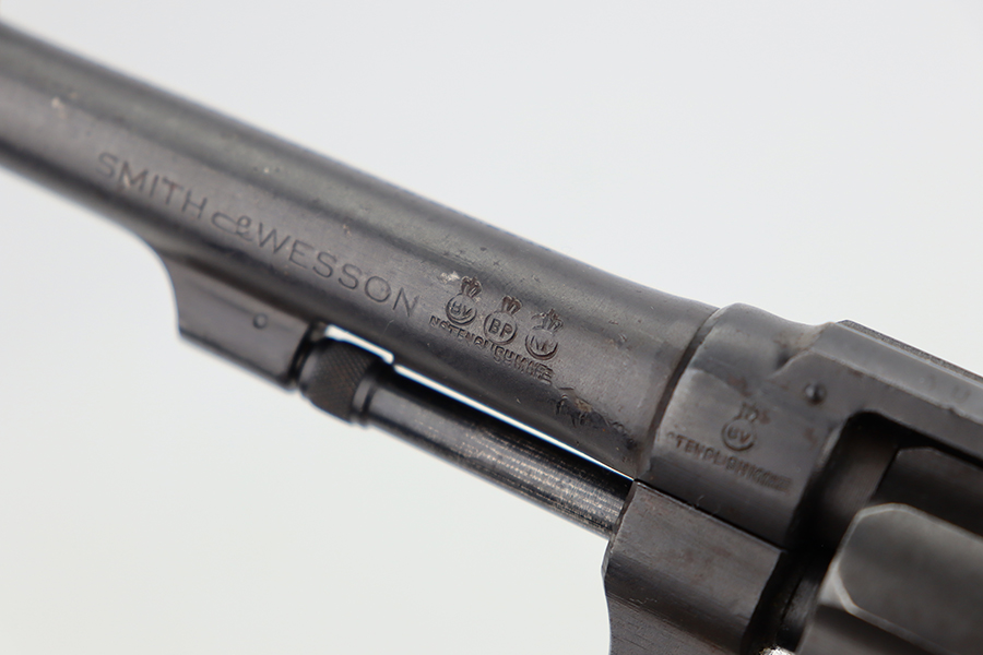 06/04/2024 – For sale is a British proofed S&W Victory revolver chambered in .38 S&W. The revolver is in overall 97% condition with some wear on the barrel and the overall finish is dulled. The left side of the barrel and in front of the cylinder is stamped with British proof marks. Above the trigger guard is stamped with the Birmingham Proof House. The bore is very bright and excellent. There are some scratches from use on the wood grip but there are no cracks.