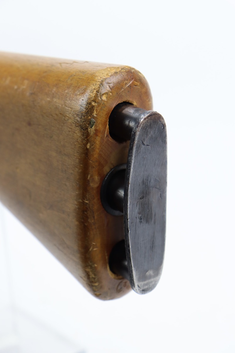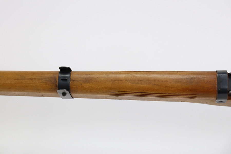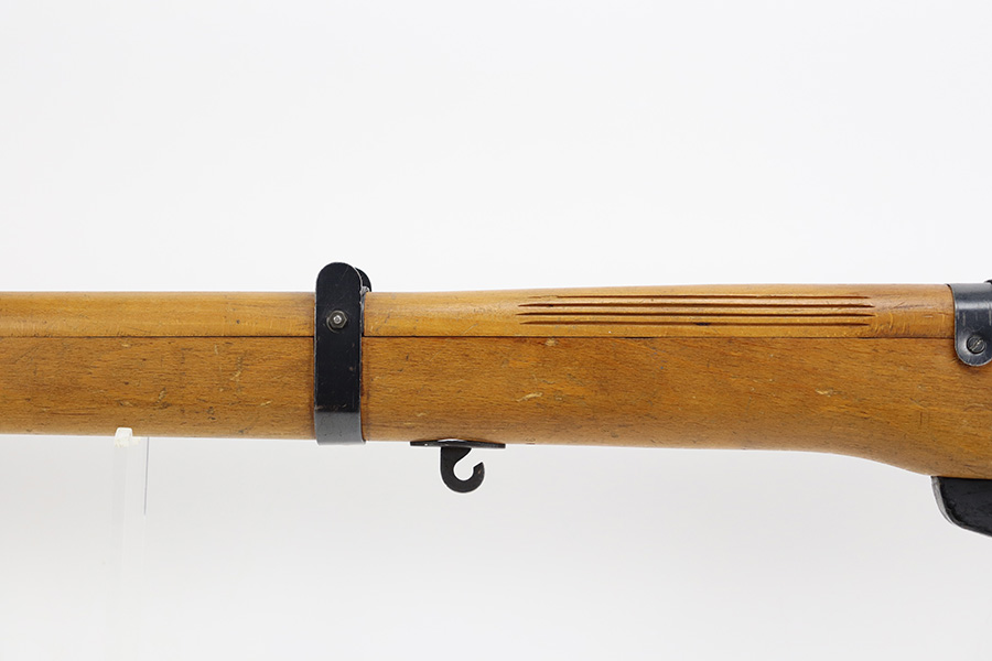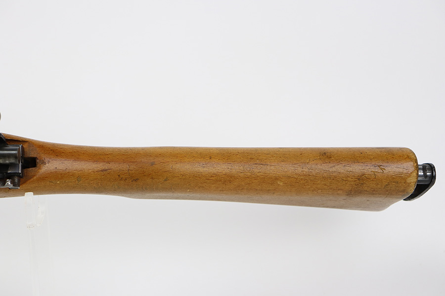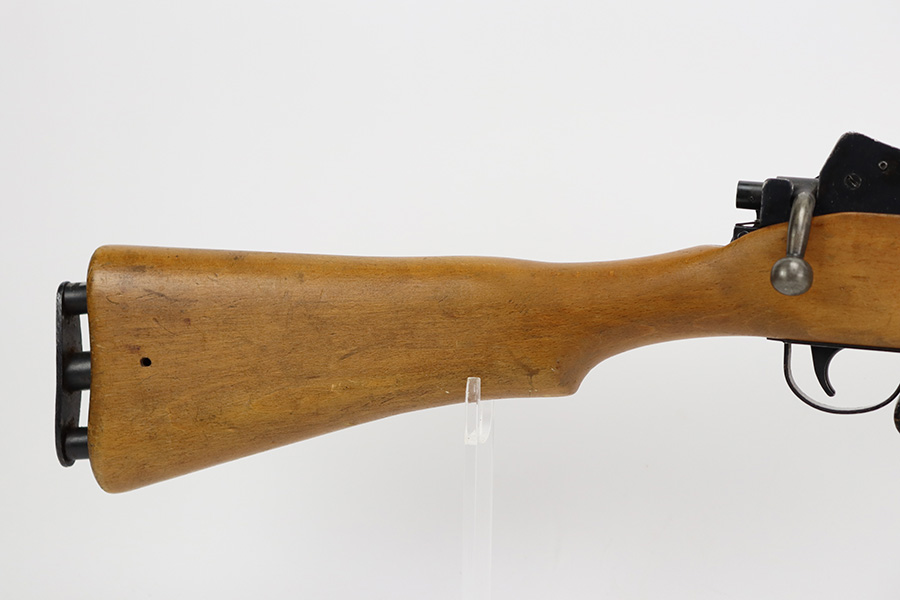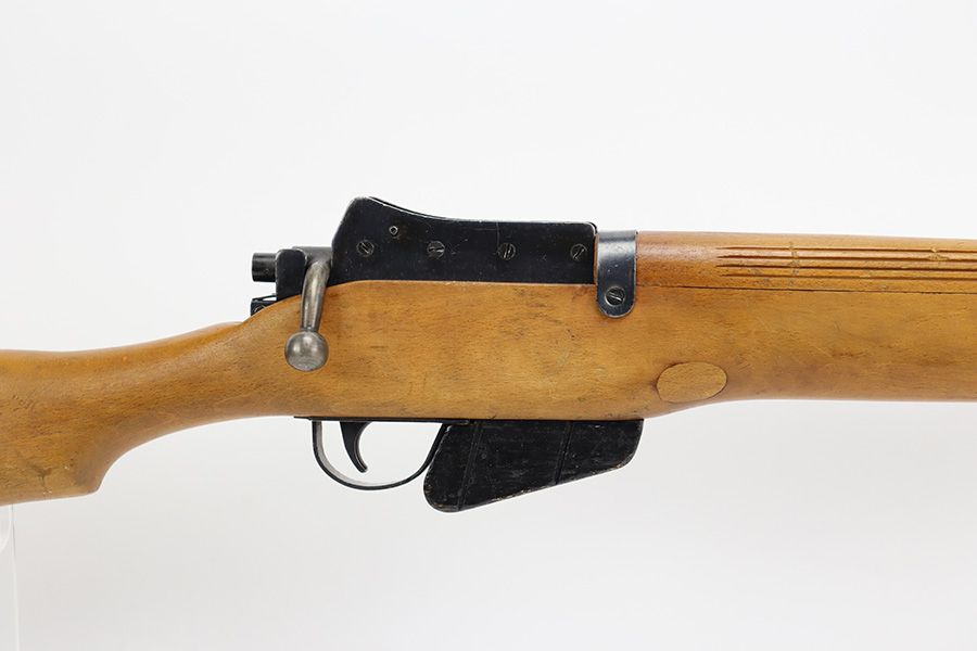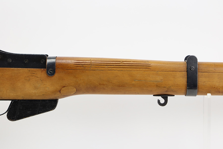 12/5/23 – Up for sale is an uncommon Swift Model B MkIII training rifle used by the British Commonwealth. The rifle was a cheap way to practice fundamentals and marksmanship at a fraction of the cost of a real rifle. These rifles were set up with a paper target an inch away and the rifleman would “shoot” the rifle and the rifle would stab the paper with a protruding needle. The original rifles were set up to mimic Pattern 14 rifles but the MkIII were set up to act like a No4 Mk1 Lee Enfield. The action is sound and works properly. The metal retains good bluing and the stock is also free of any damages. There is a stock repair on the right side in front of the magazine.