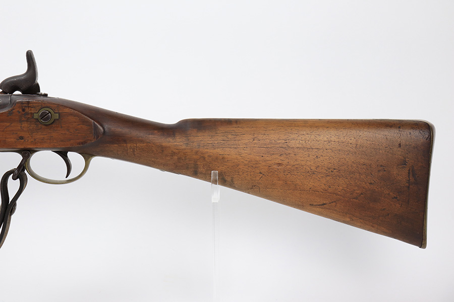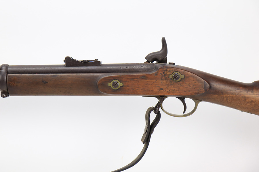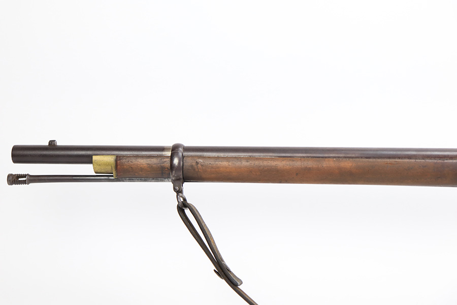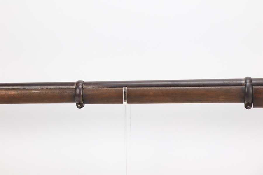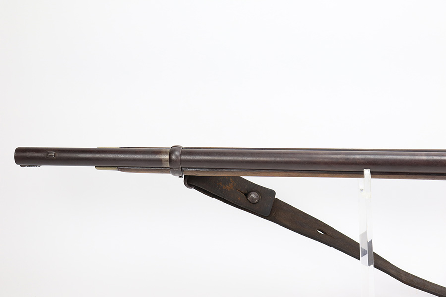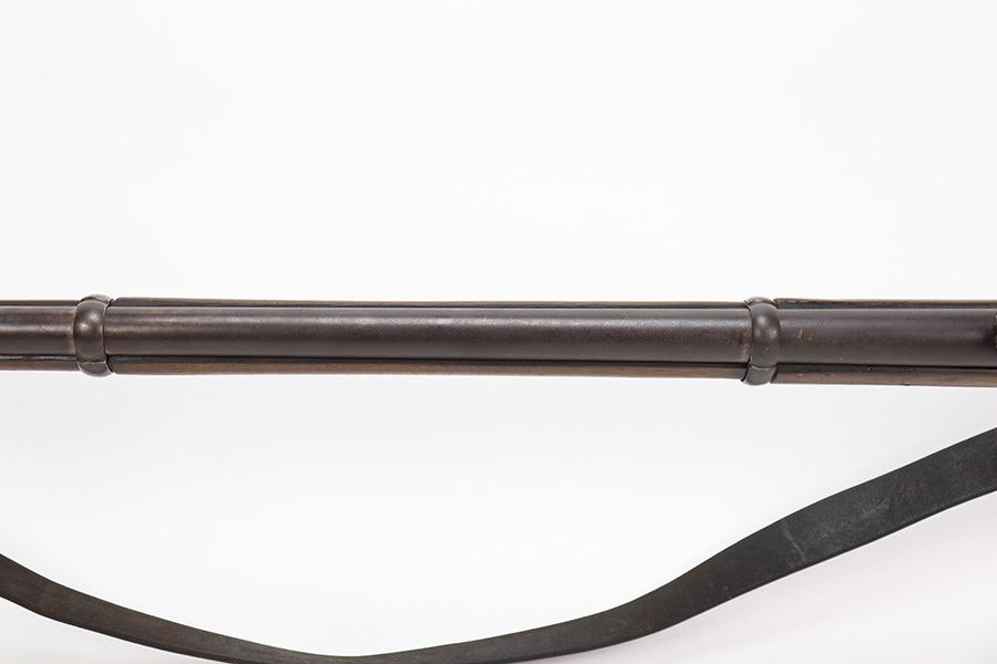 6/2/23 – This is a nice example of a British Tower Pattern 53 Musket, chambered in .58 Caliber and dated 1861 on the lock. It was most likely purchased from England by the Confederate Army during the Civil War. It has the proper British export proofs on the breech. It comes with its original ram rod and an original leather sling. Overall, the gun is in nice condition for its age and functions properly. Most of the metal is smooth and is covered in honest “attic patina”. There is some minor pitting and very light surface rust around the breech. Very nice wood stock with only minor bruises and scratches throughout. The butt stock may have been very lightly sanded. There are some very faint markings on the underside of the butt stock, but we cannot make them out. May be unit markings. The majority of the bore is very nice – fairly shiny with great rifling.