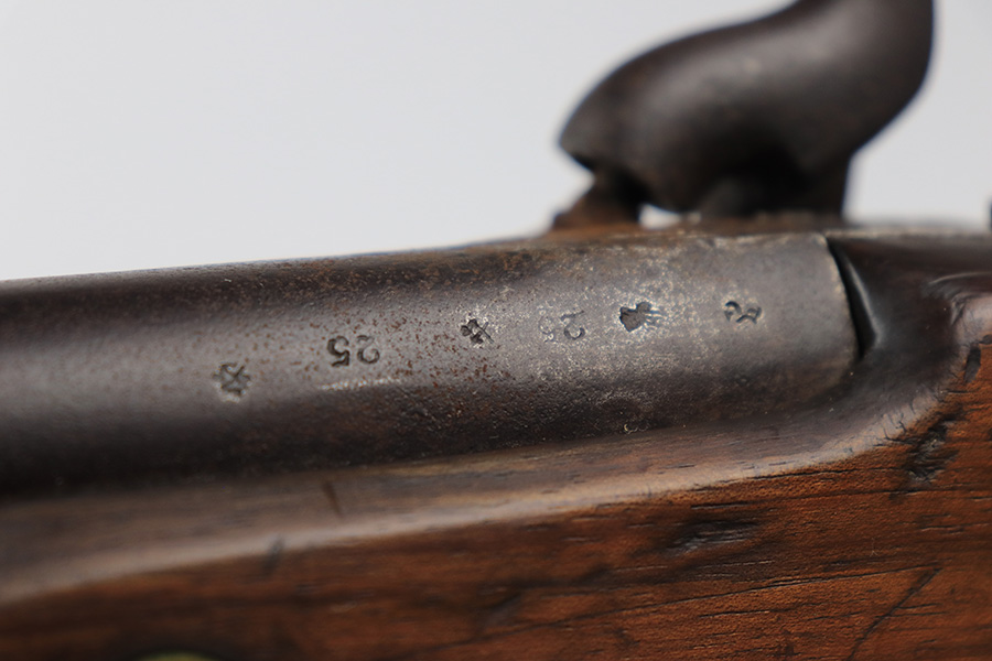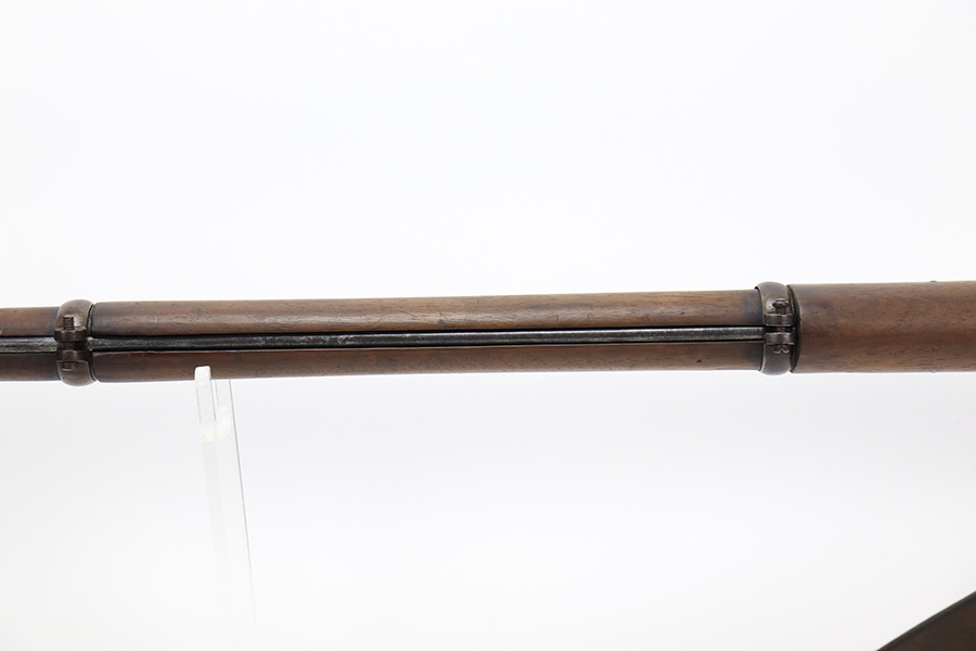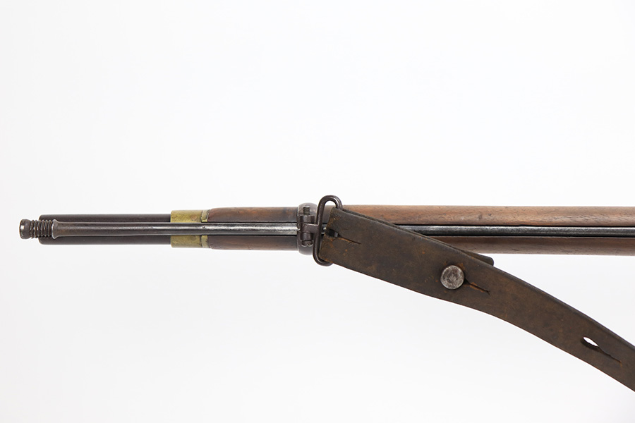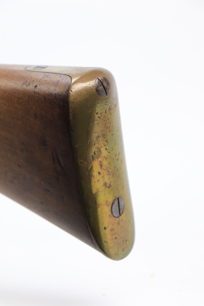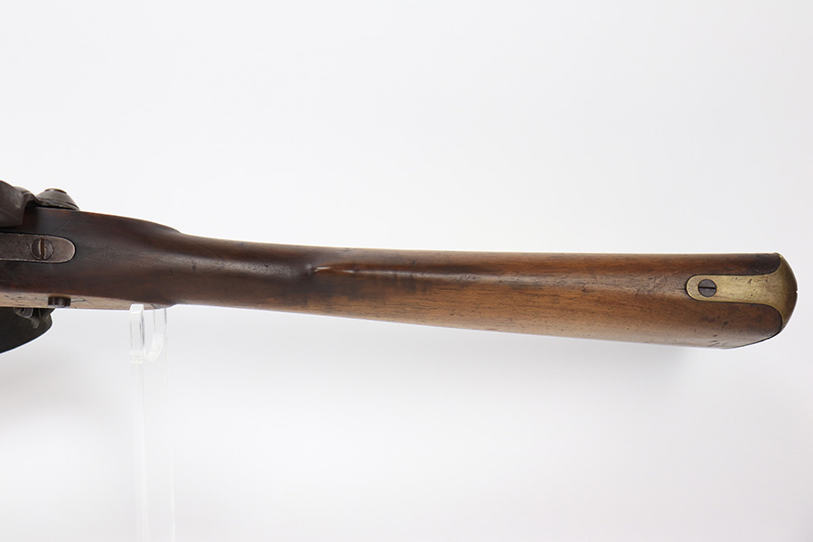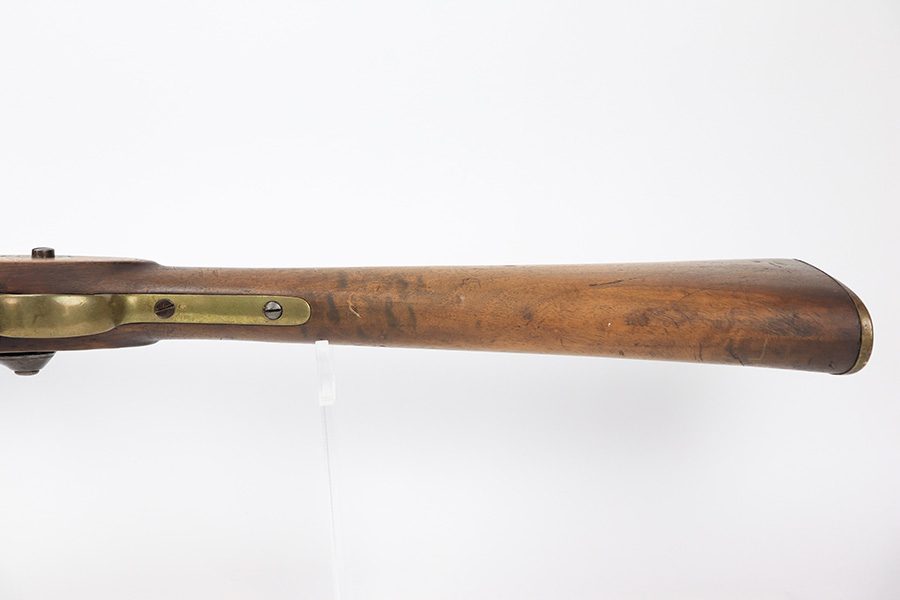 6/2/23 – This is a nice example of a British Tower Pattern 53 Musket, chambered in .58 Caliber and dated 1861 on the lock. It was most likely purchased from England by the Confederate Army during the Civil War. It has the proper British export proofs on the breech. It comes with its original ram rod and an original leather sling. Overall, the gun is in nice condition for its age and functions properly. Most of the metal is smooth and is covered in honest “attic patina”. There is some minor pitting and very light surface rust around the breech. Very nice wood stock with only minor bruises and scratches throughout. The butt stock may have been very lightly sanded. There are some very faint markings on the underside of the butt stock, but we cannot make them out. May be unit markings. The majority of the bore is very nice – fairly shiny with great rifling.