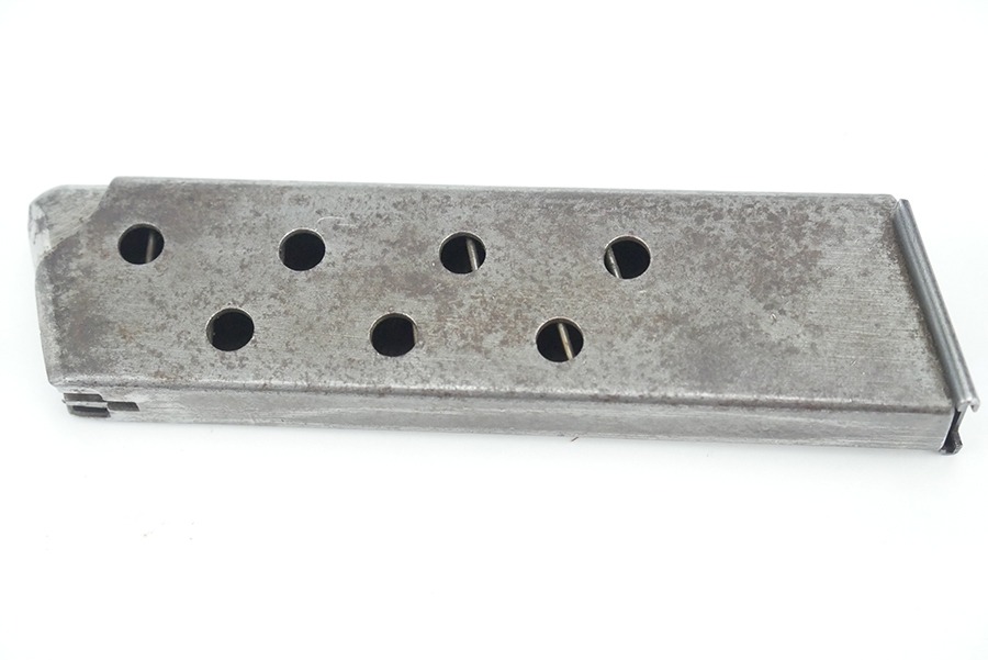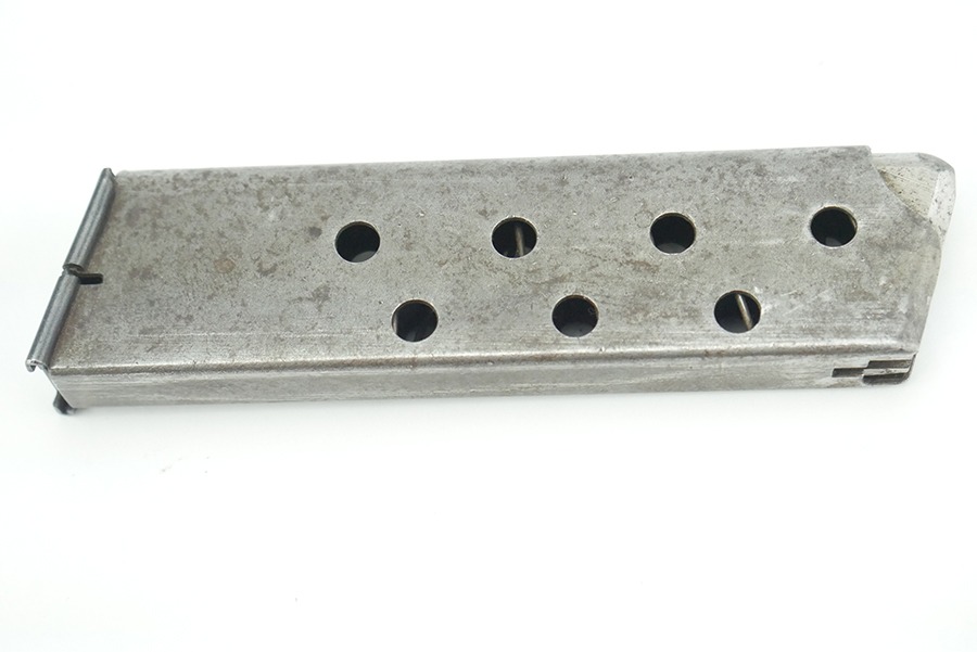 10/7/24 – This is a fair example of a Mauser HSc Magazine from WW2. Unfortunately, the base plate of the magazine is damaged with the toe of the magazine being broken off. The body of the magazine has a decent amount of patina. The spring on this magazine remains strong and is fully functional. This magazine would make a perfect magazine for repair or for parts.