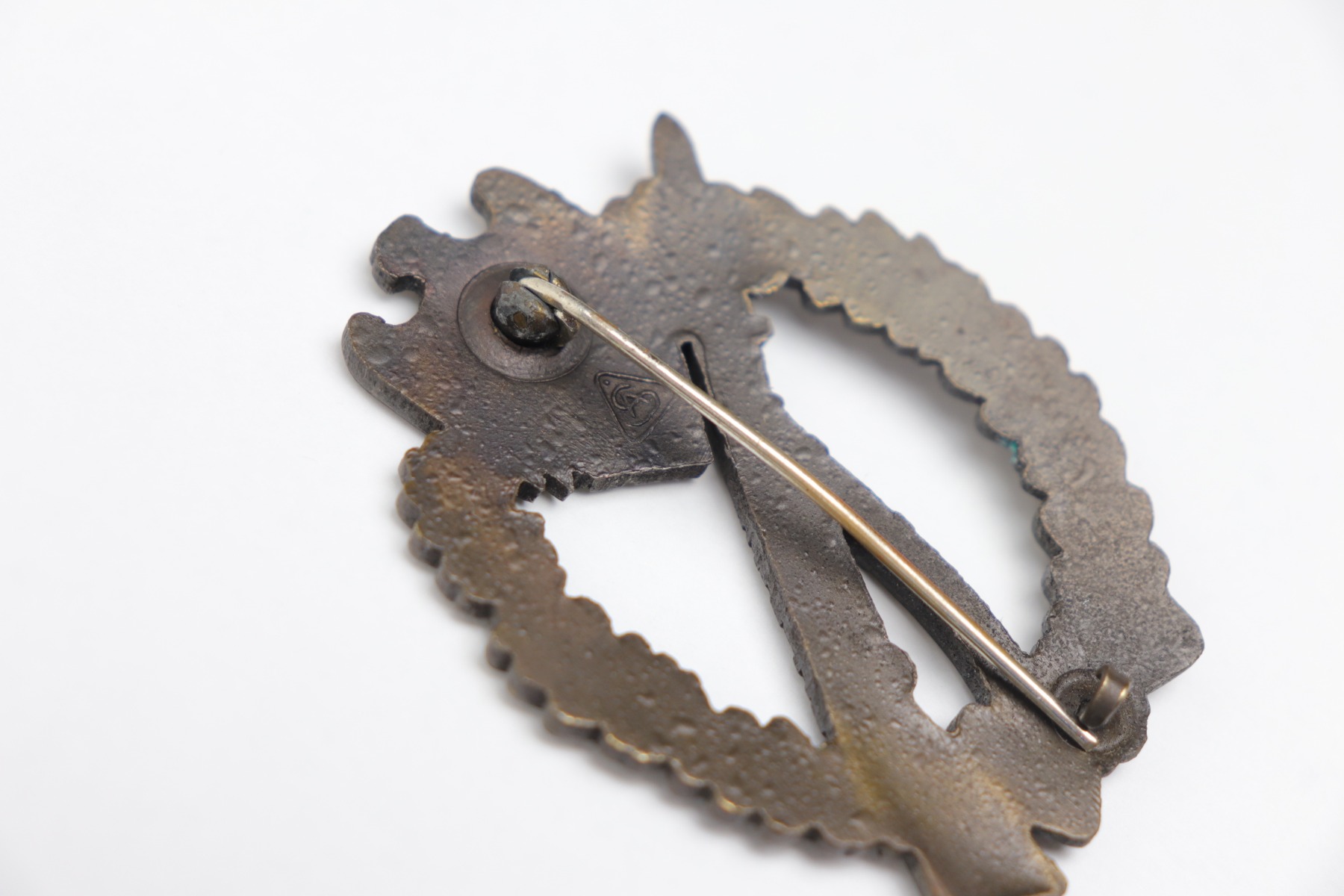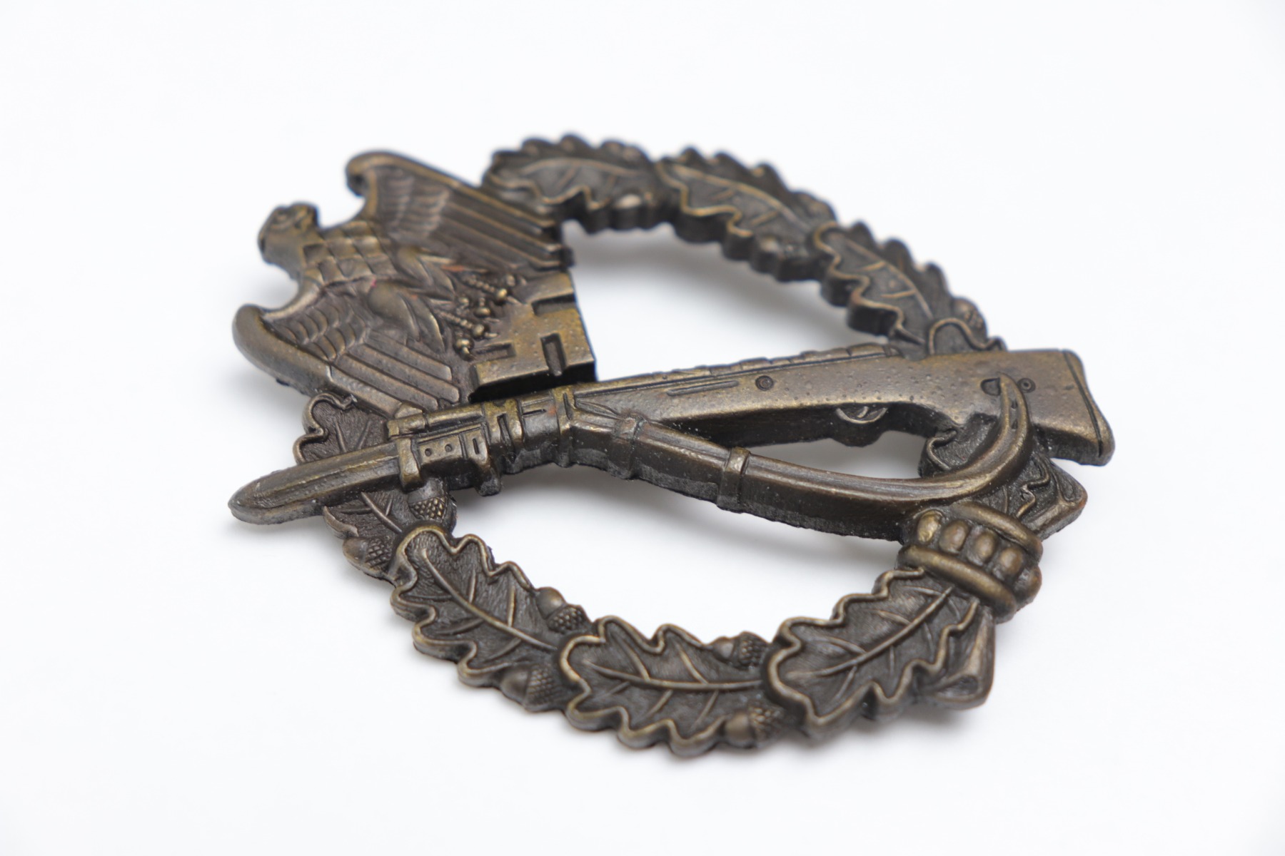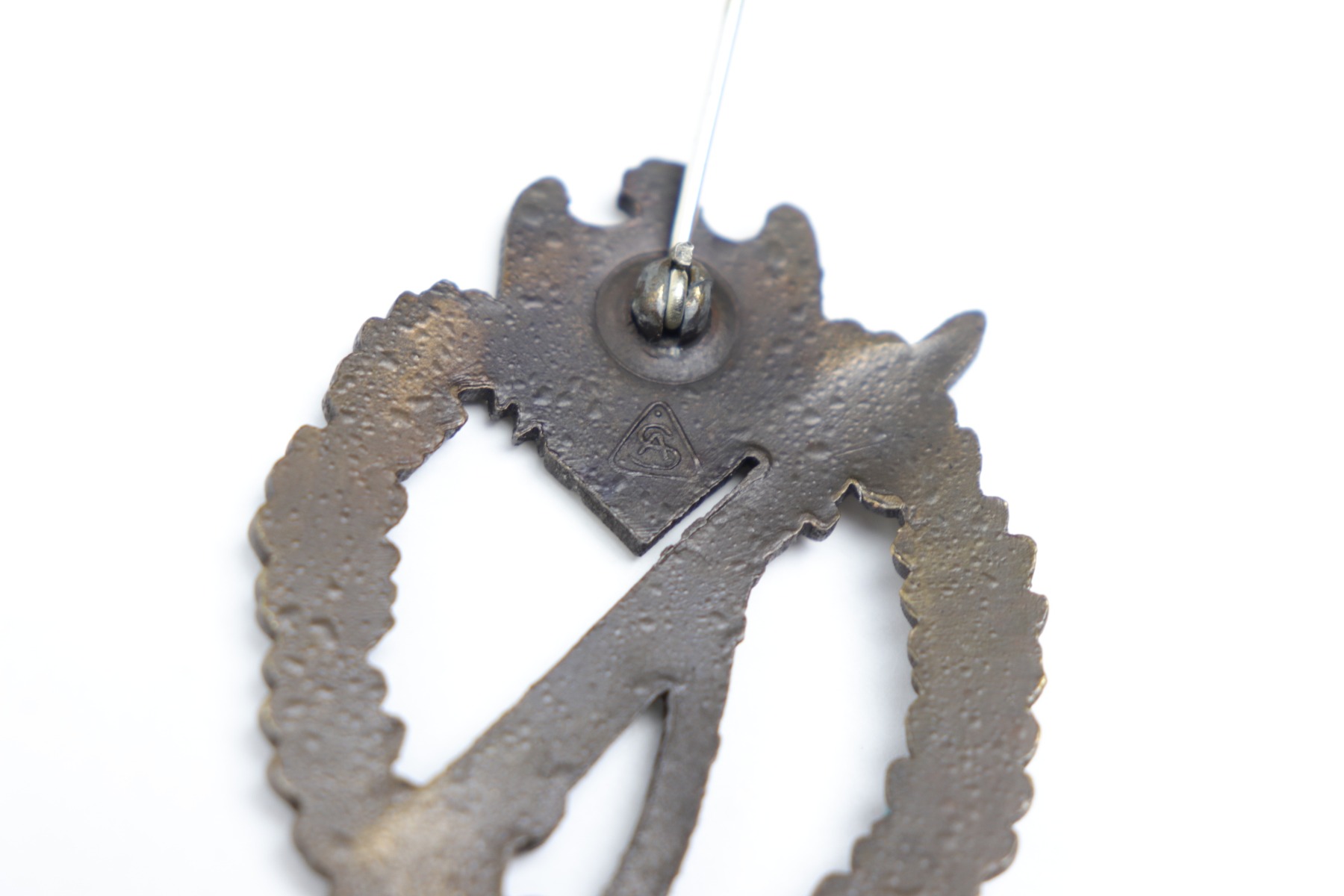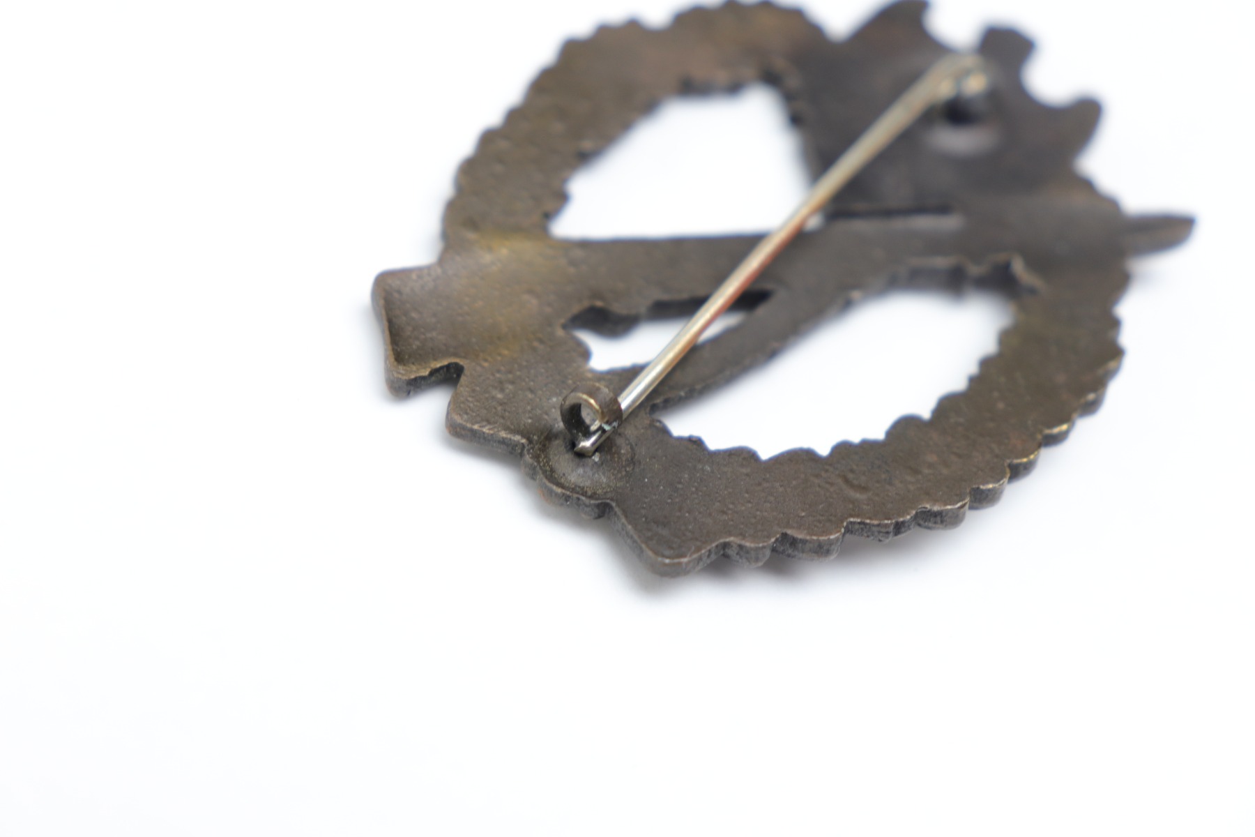 12/23/20 – This is an original WW2 nazi infantry assault badge in bronze. the medal is in great condition with the original hook and pin in tact. The reverse is maker stamped with a “AS” logo by Assman. Guaranteed original and authentic.