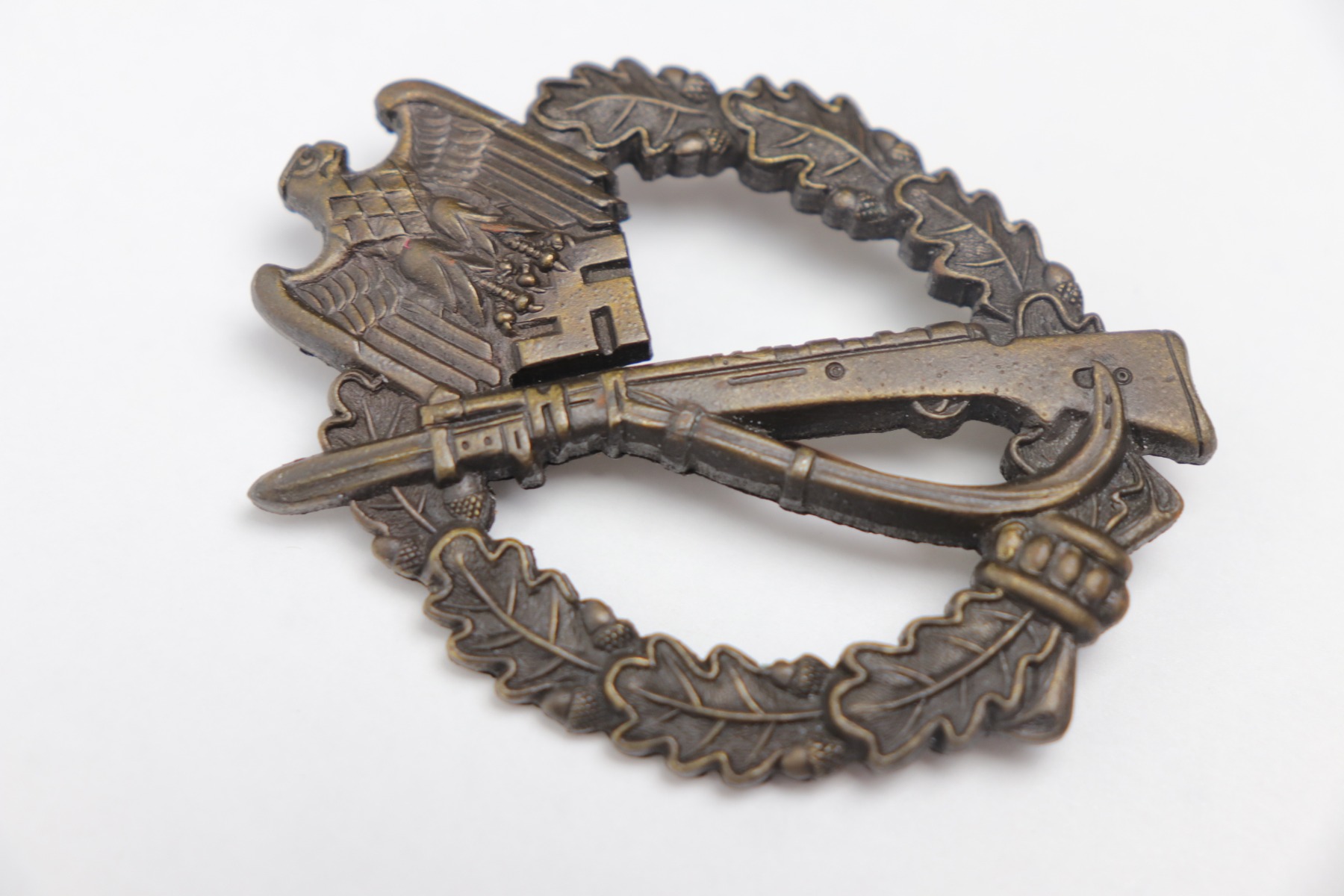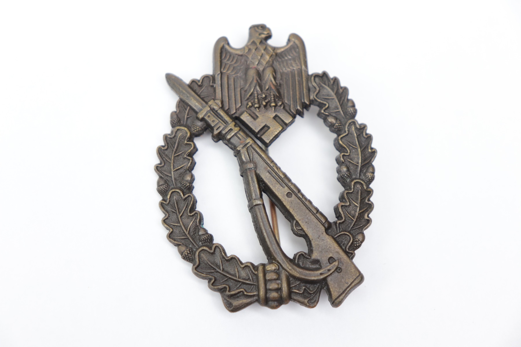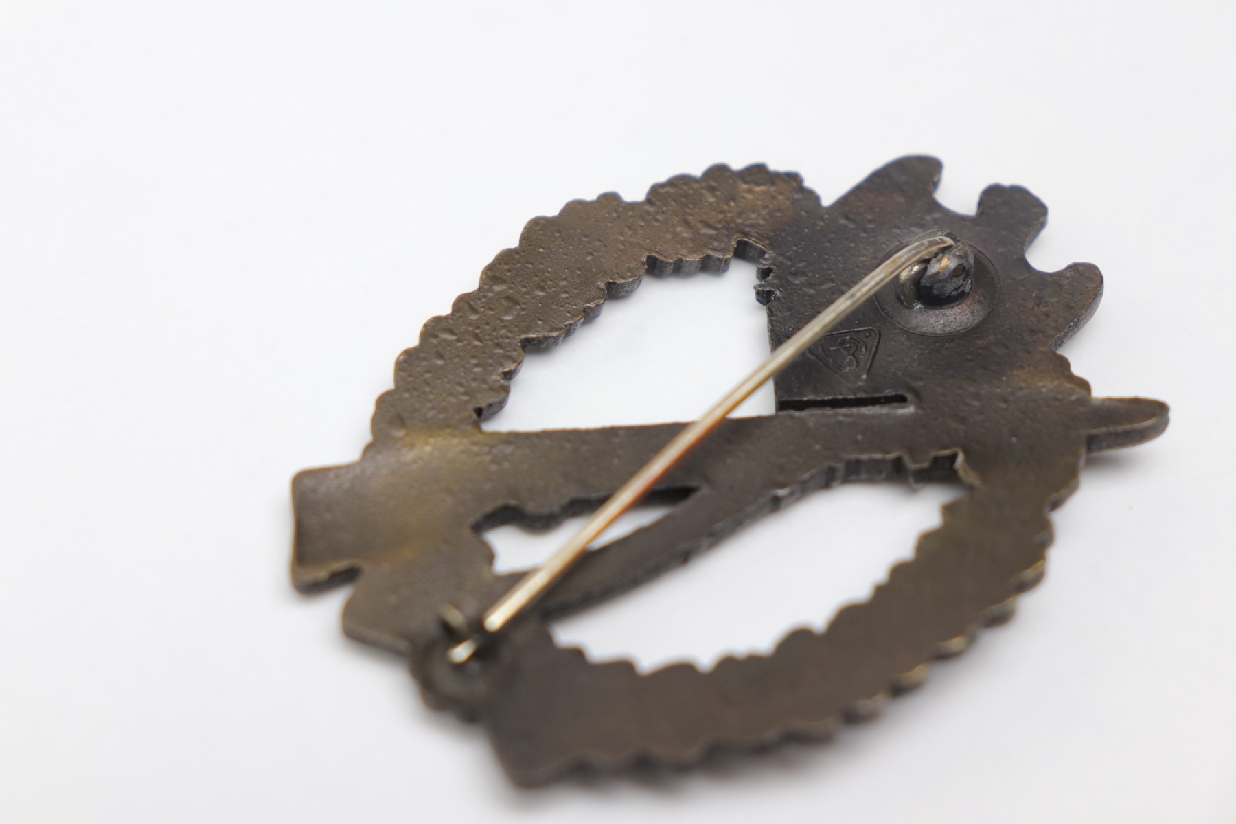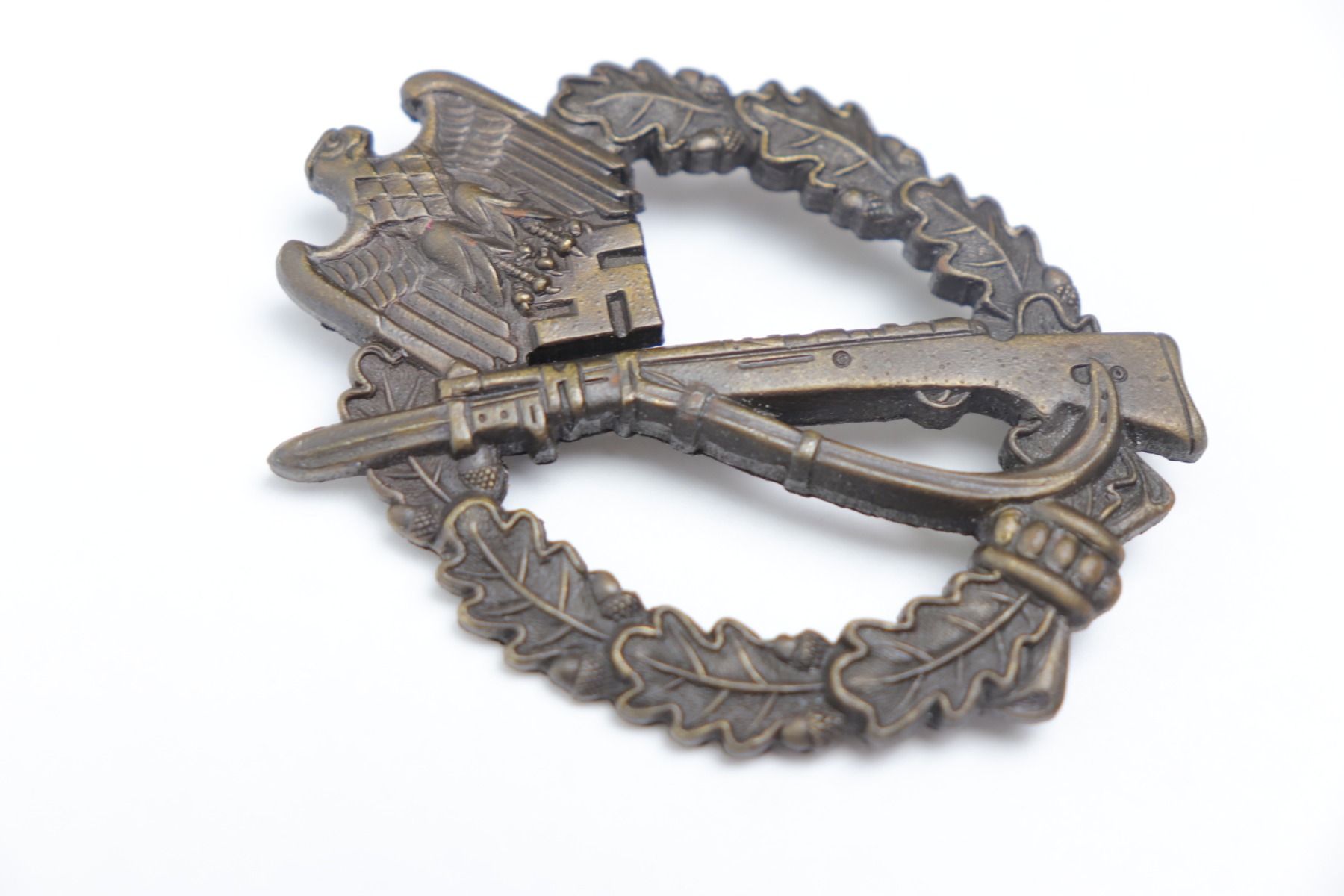 12/23/20 – This is an original WW2 nazi infantry assault badge in bronze. the medal is in great condition with the original hook and pin in tact. The reverse is maker stamped with a “AS” logo by Assman. Guaranteed original and authentic.
