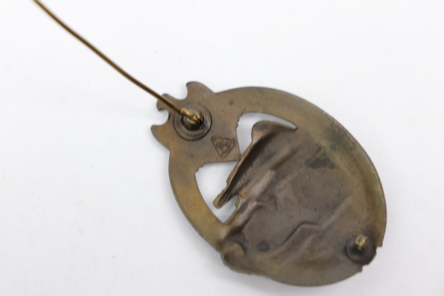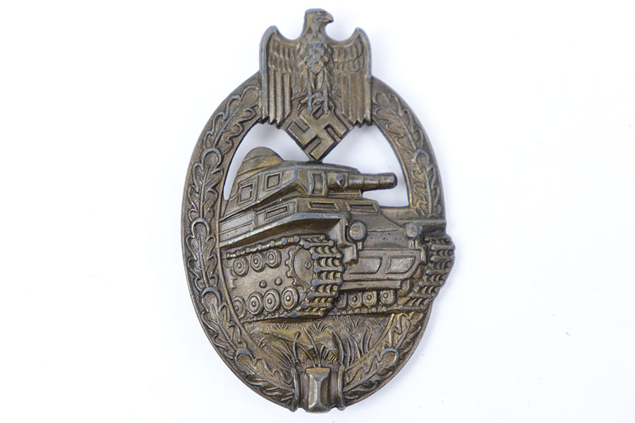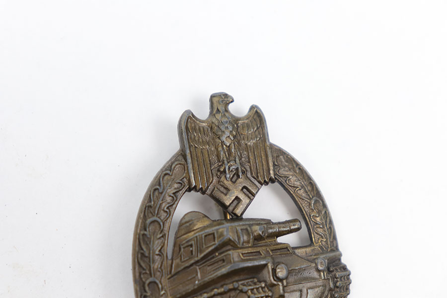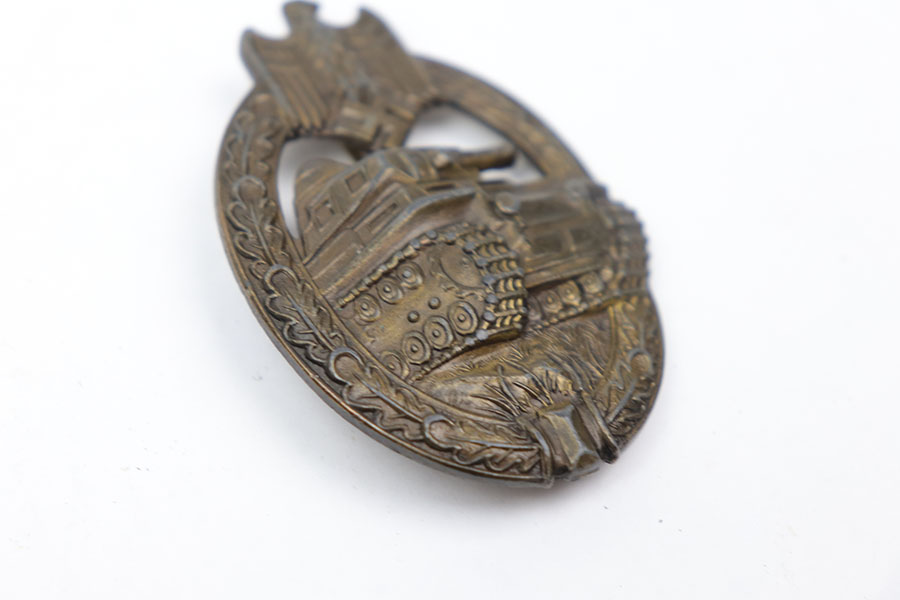 10/30/20 – This is an original panzer assault badge in bronze. Awarded to troops in armored divisions. Maker stamped on the reverse by Hermann Aurich. A fair amount of honest wear and light patina on the front of the badge. No excessive wear.