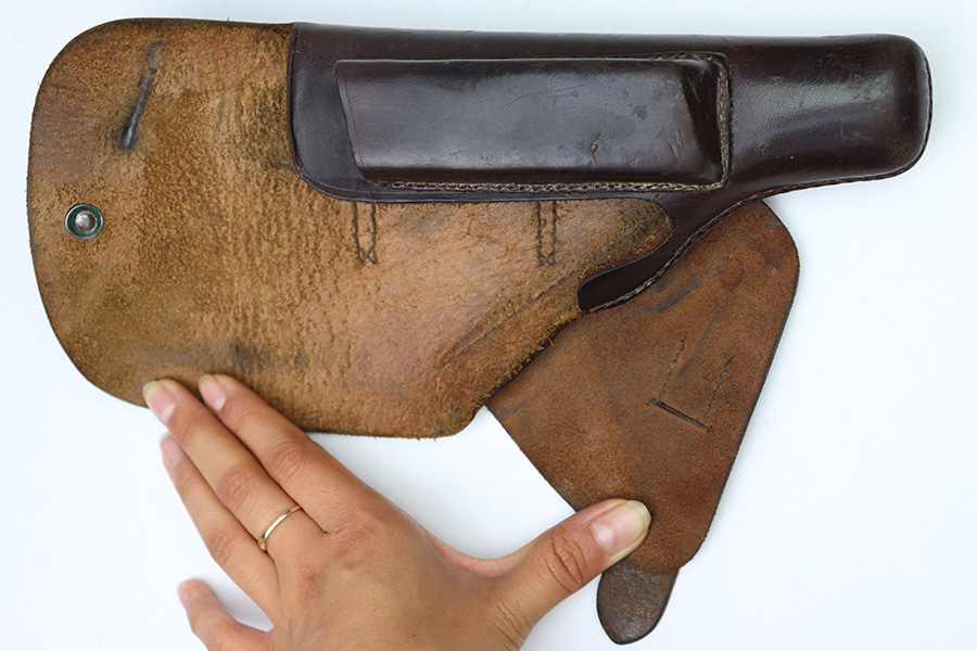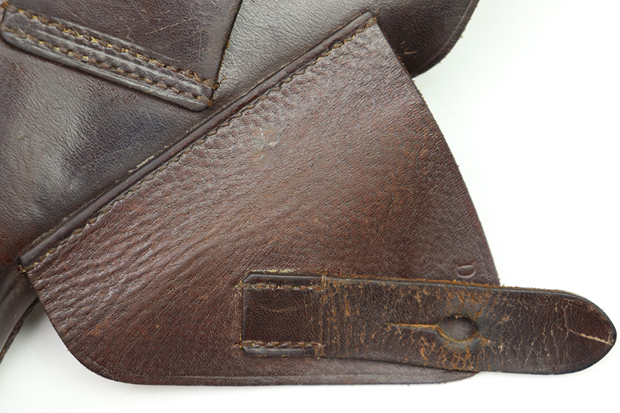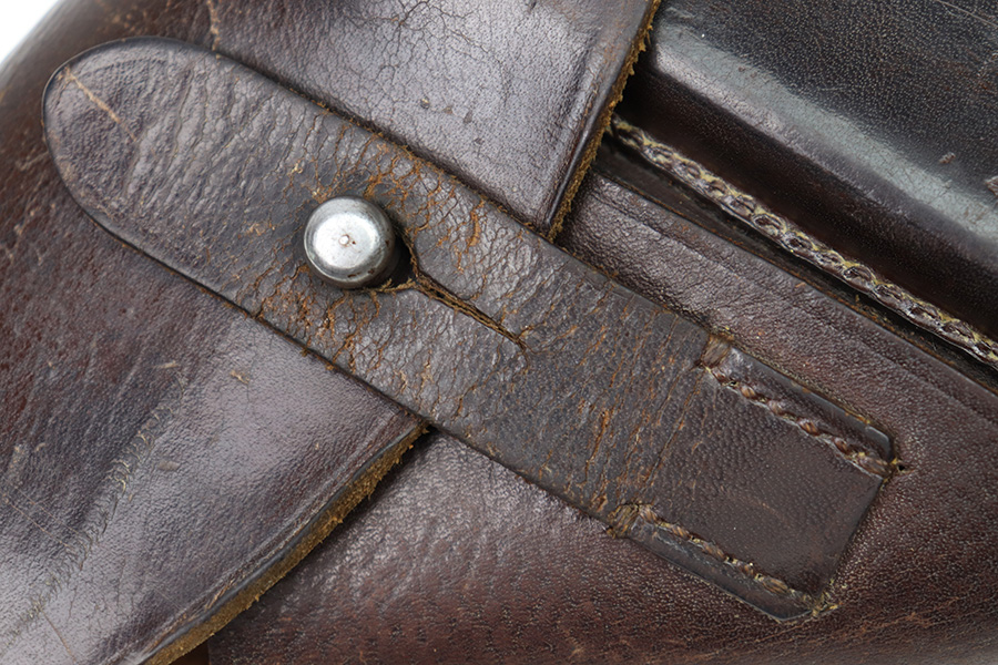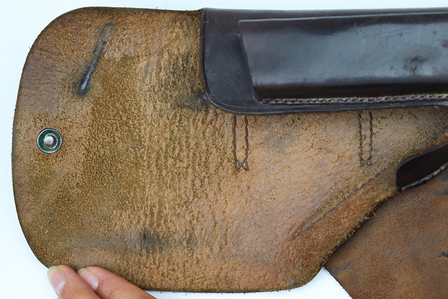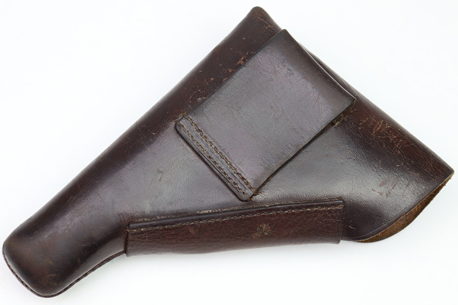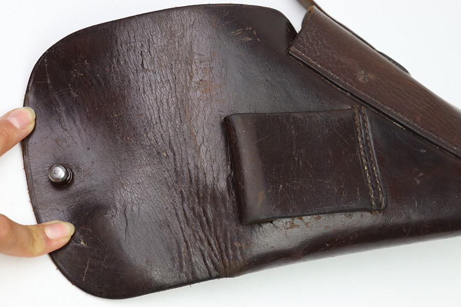 10/18/22 – This is an AKAH Walther PP holster with dark brown leather. The holster is in excellent overall condition with some surface wrinkling around the top leather / pivot point, and some scuffing on the toe. The interior leather is in good condition with some mild signs of previous use. The side flap has an AKAH maker stamp under the closure strap, and there are no other markings. Excellent, clean stitching throughout.
