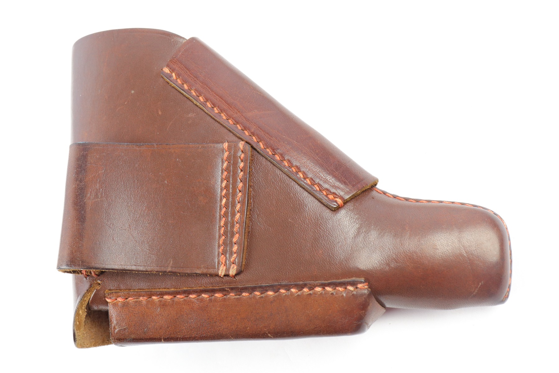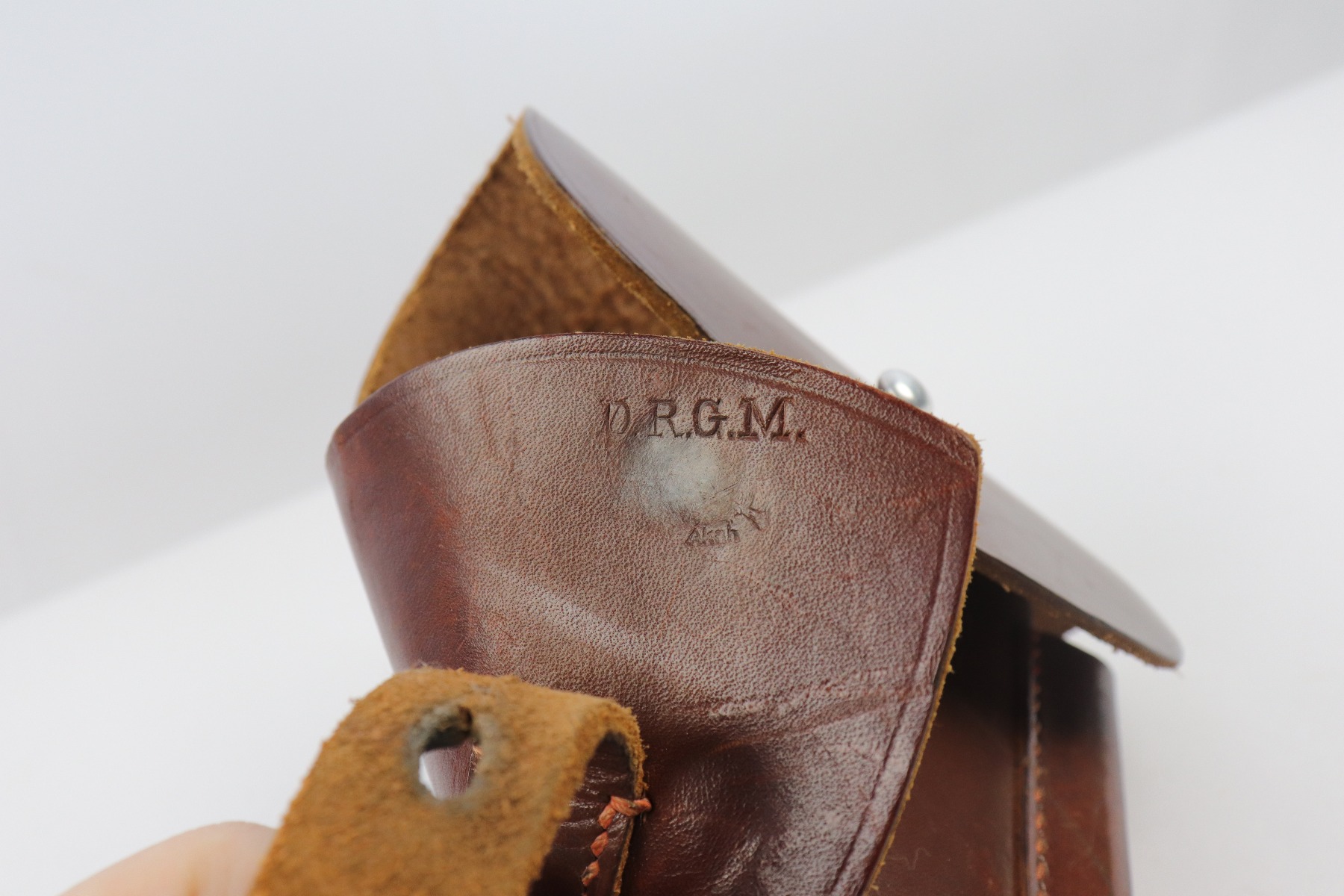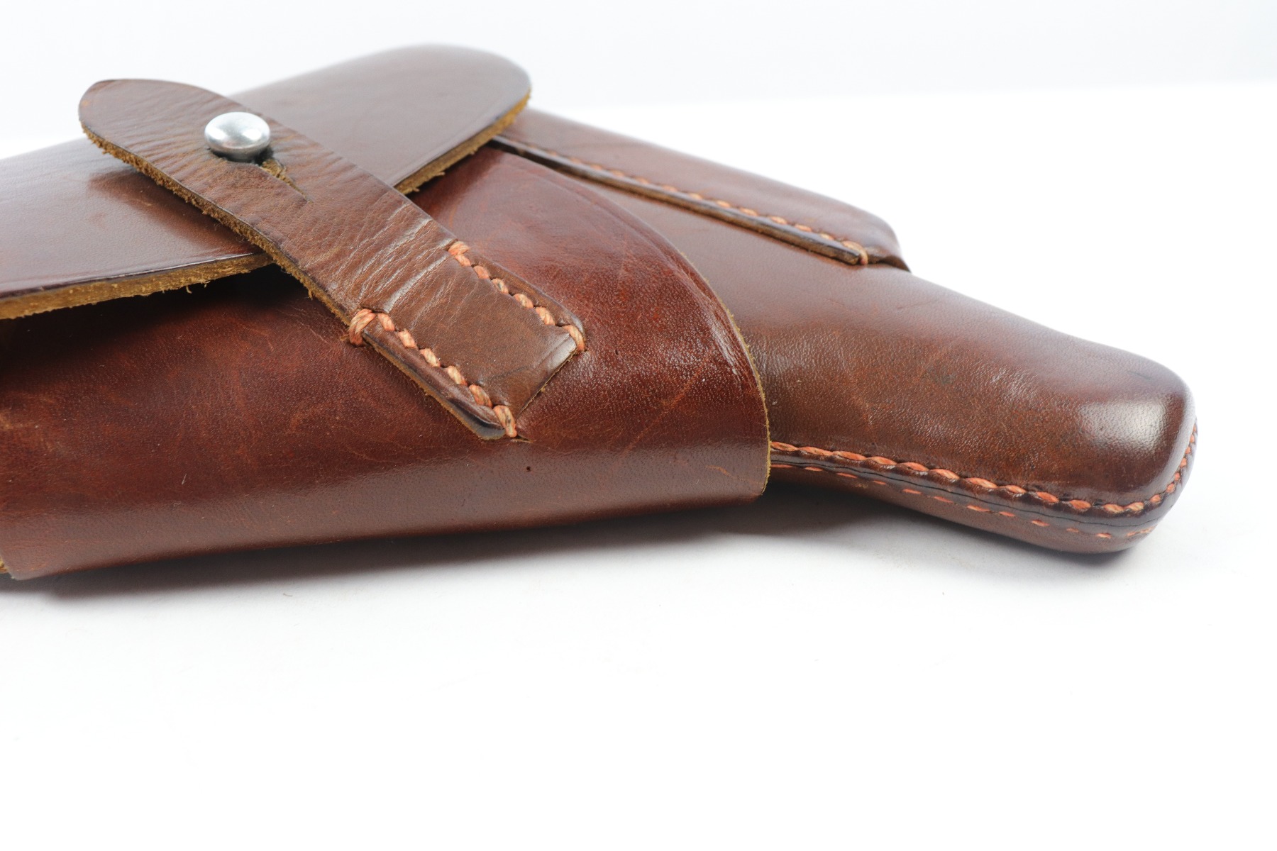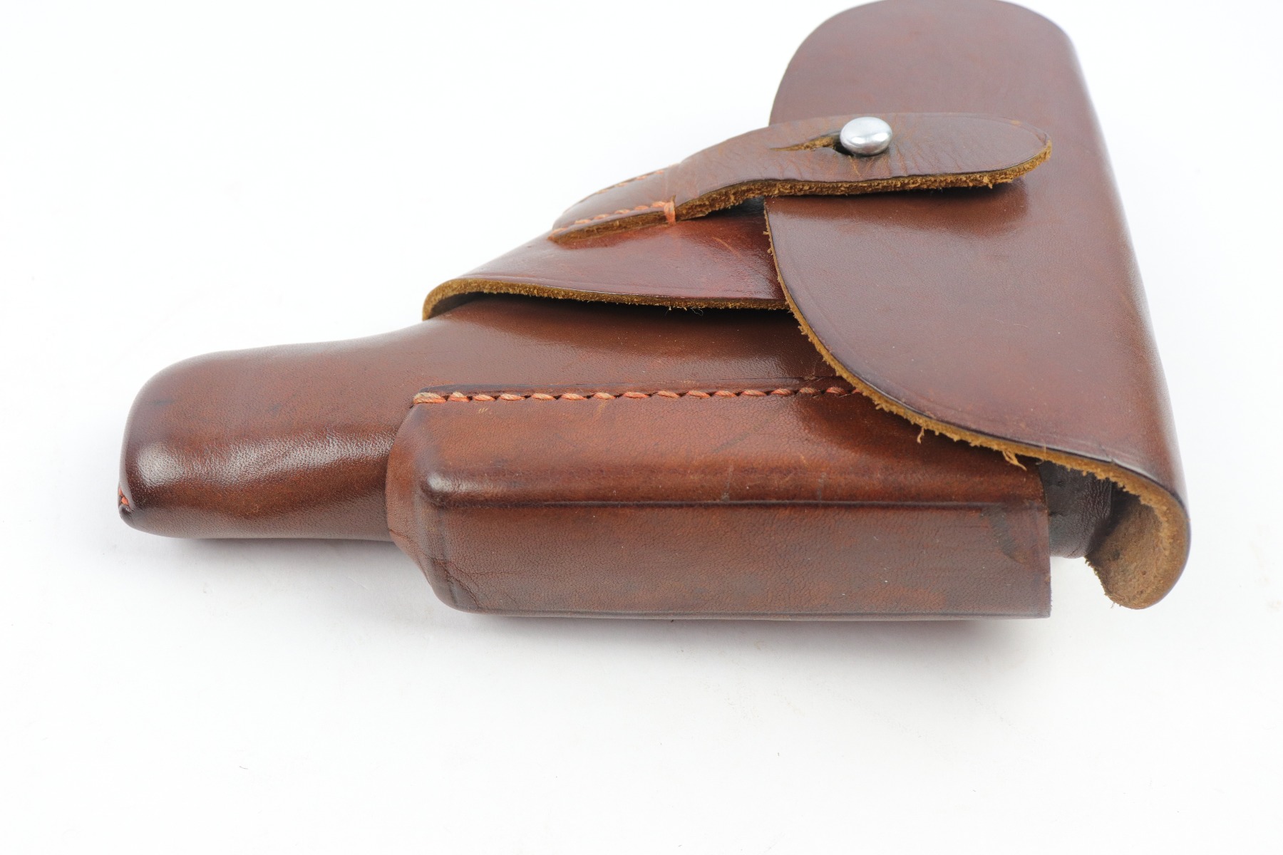 4/9/18 – This is an original AKAH Walther PP holster with excellent brown leather and reddish colored stitching. Most leading edge PP holsters are black, so this brown leather holster is fairly desirable. The exterior leather is clean and there’s an AKAH DRGM maker stamp under the closure strap. The interior leather has a faint P.P. ink stamp. The stitching is all tight and original.