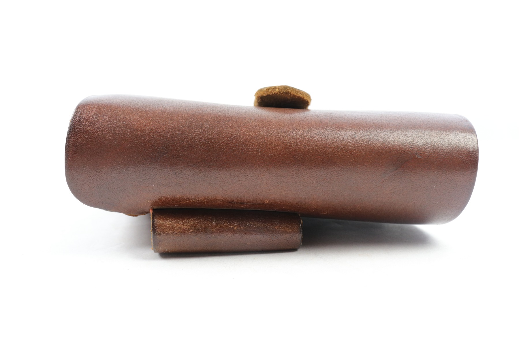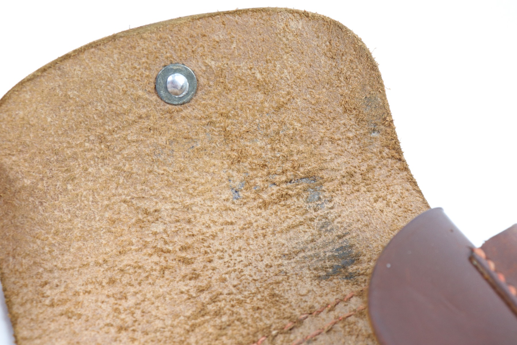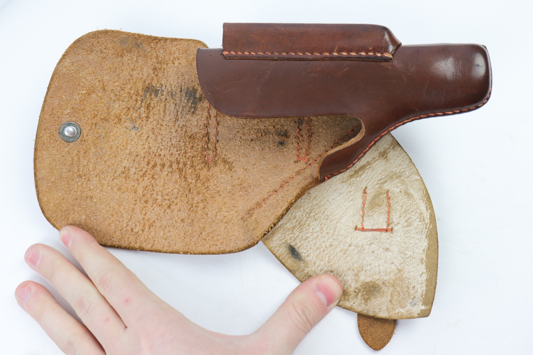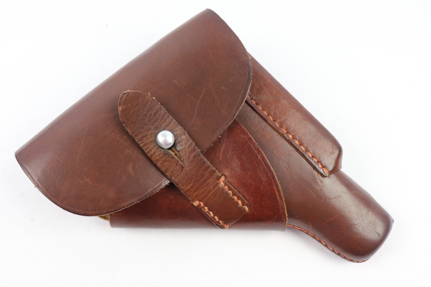 4/9/18 – This is an original AKAH Walther PP holster with excellent brown leather and reddish colored stitching. Most leading edge PP holsters are black, so this brown leather holster is fairly desirable. The exterior leather is clean and there’s an AKAH DRGM maker stamp under the closure strap. The interior leather has a faint P.P. ink stamp. The stitching is all tight and original.