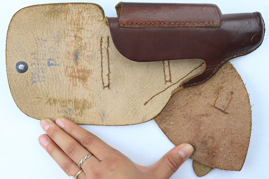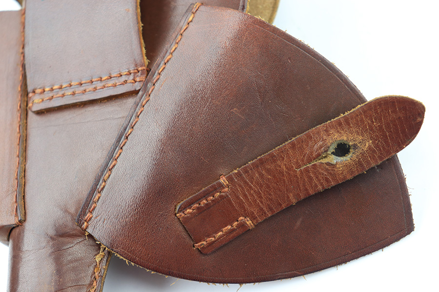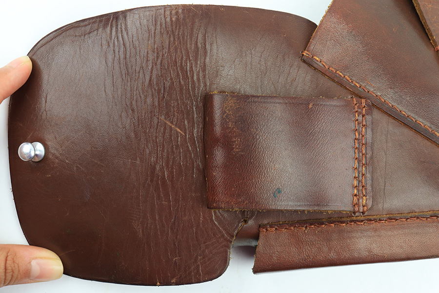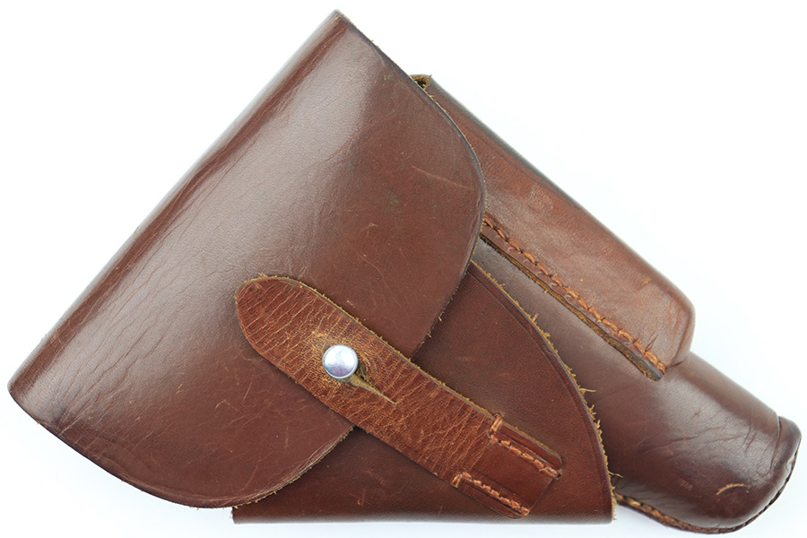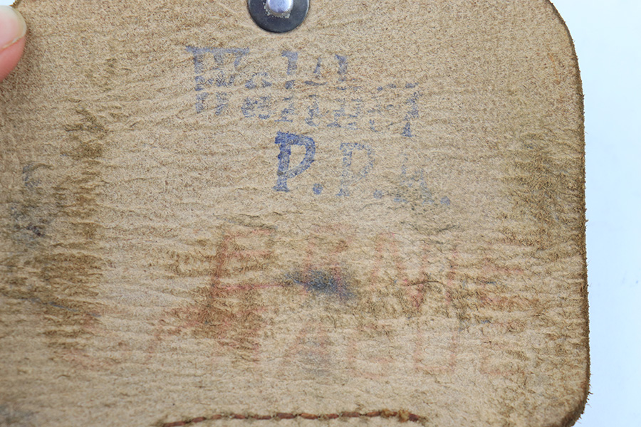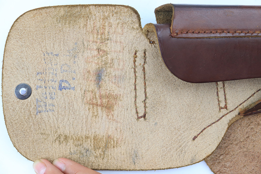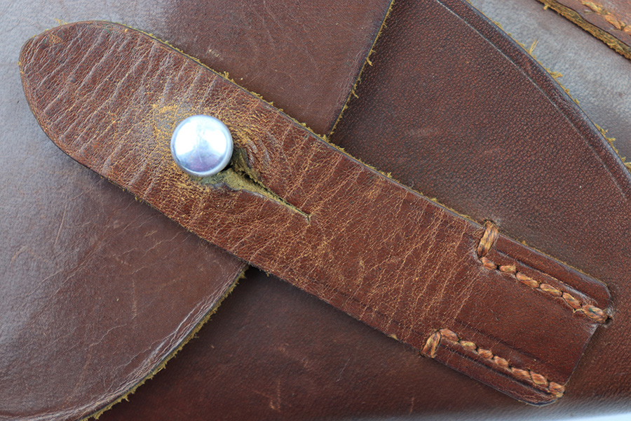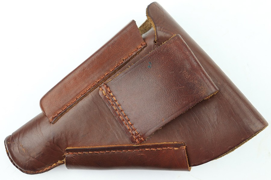 7/26/23 – This is an excellent condition leading edge style AKAH PPK holster from WW2. The holster features brown leather with an AKAH maker stamp under the closure strap, and a still-visible Walther PPK designation ink stamp on the interior leather. The holster has some mild surface blemishes on the exterior leather, and signs of previous use on the interior. The leather is overall clean, soft, and pliable. No stitching issues.