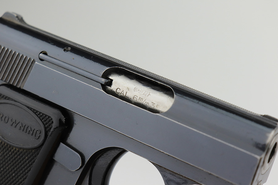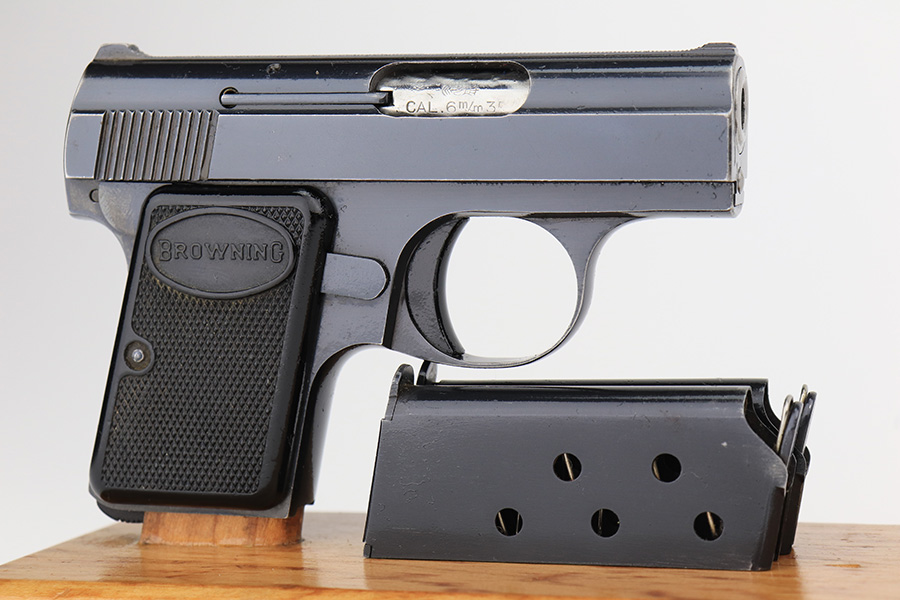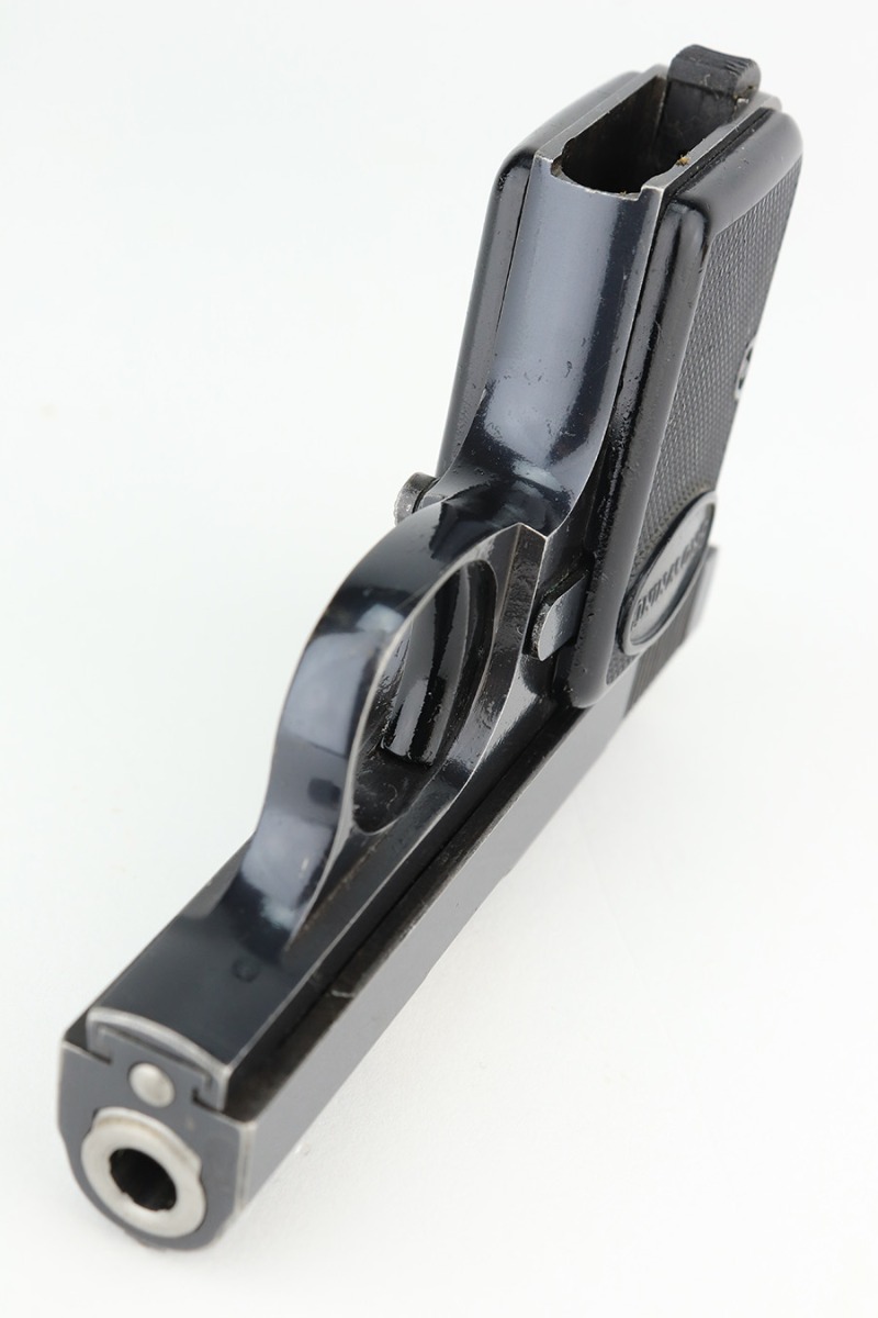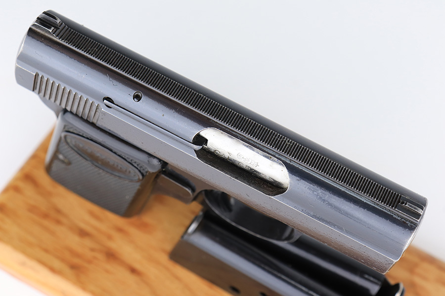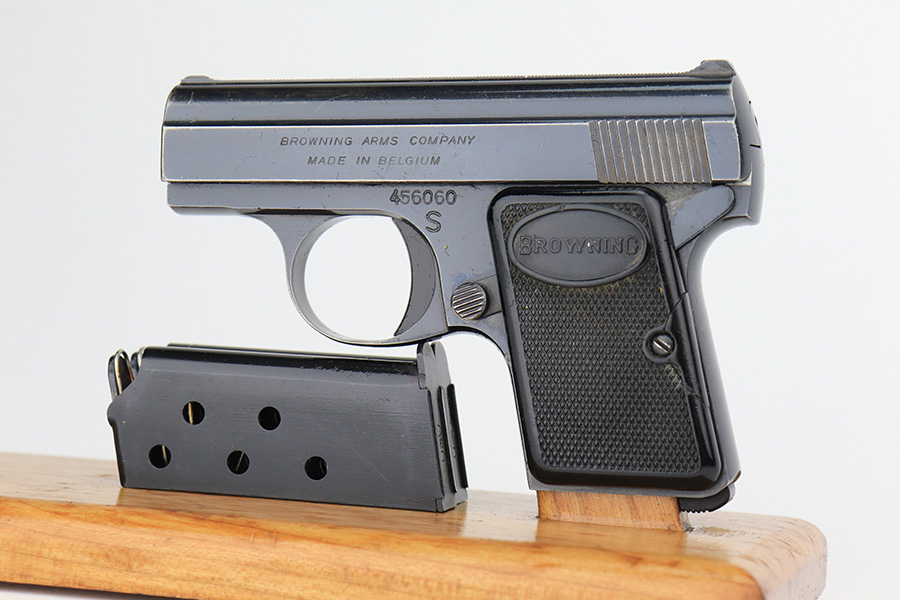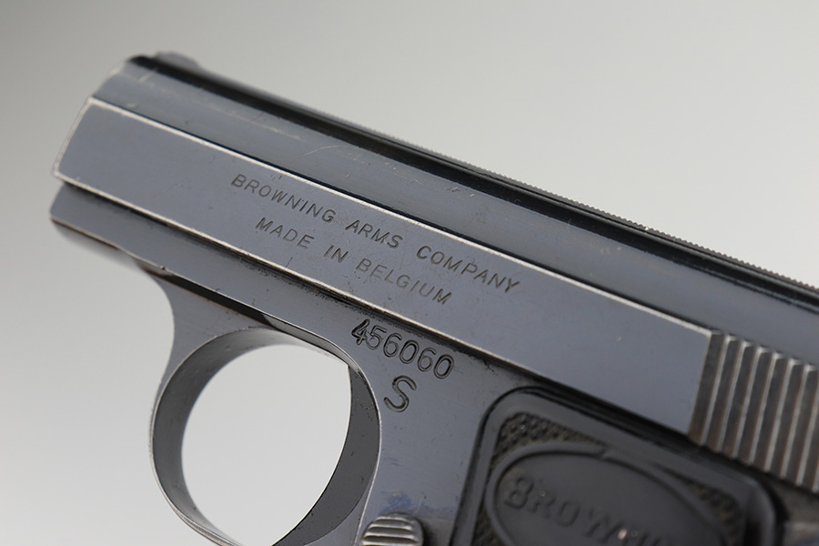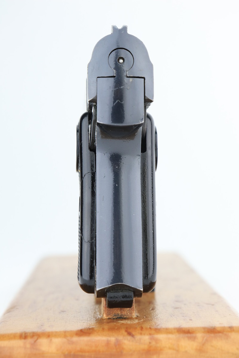 5/10/23 – This is an excellent, original Browning Baby from 1968. It has 97% of the blue remaining with minor high edge wear on the slide but no major defects. Comes with two original magazines, both marked FN on the bottom. Original grips in good condition except for a repaired crack on the left panel. Minty bore. Jeweled barrel.