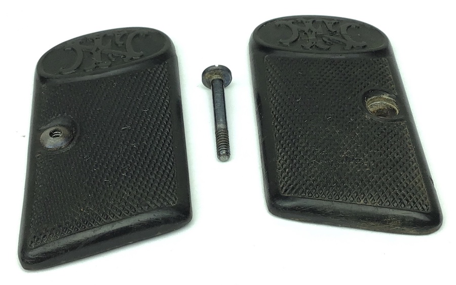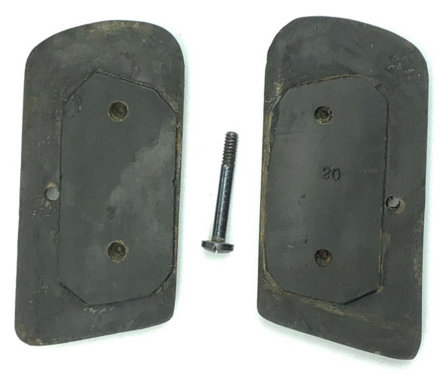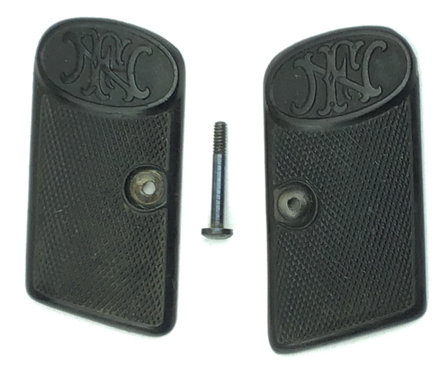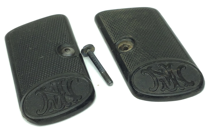 1/20/20 – Original Belgian Grips and Screw for the Browning FN 1905 /1906 pocket pistol. No warping or cracks. Nice checkering with the FN logo at the top of each grip. Nice, hard to locate grip panels in this condition. Factory original grips, not reproduction!