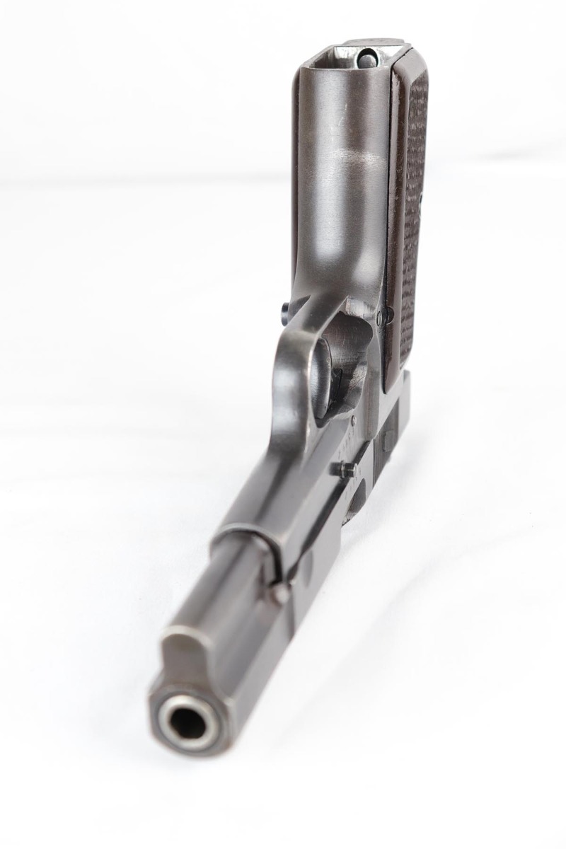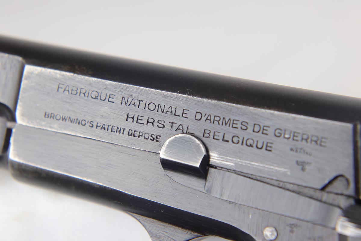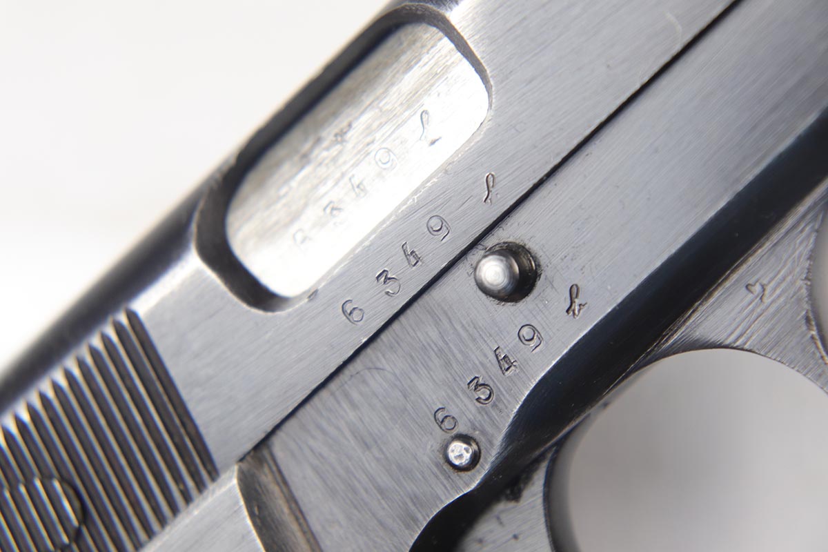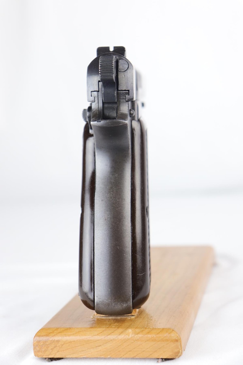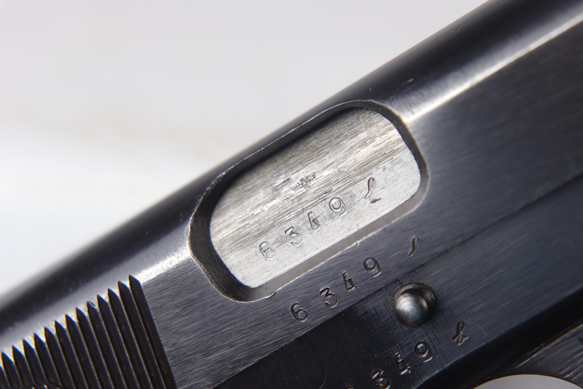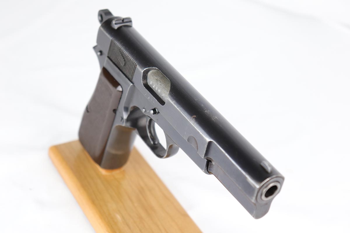 7/17/18 – This is an original and matching Browning Hi Power in the ‘b’ block, with later WaA140 proofs on slide and frame.  The finish rates at 92-93% with thinning/dulling of the straps, and basic high edge wear on the slide.  Bore shows minor frost but is in good shape overall and should shoot well.  Excellent brown plastic grips.