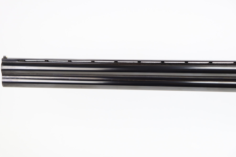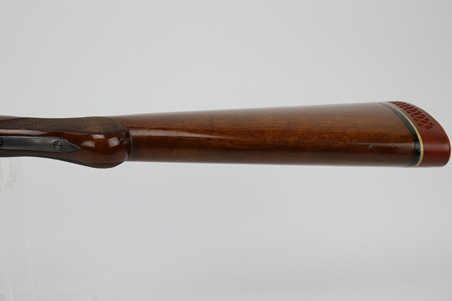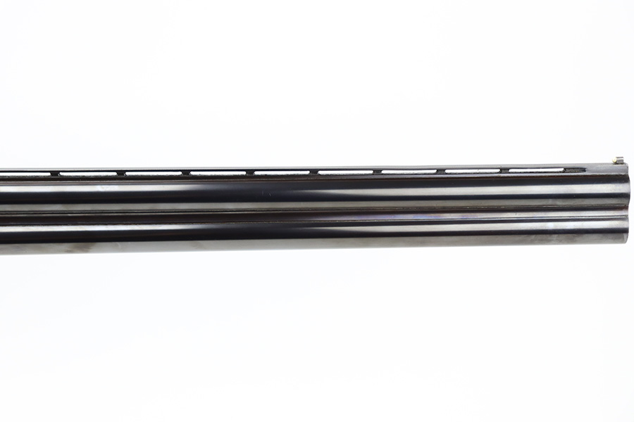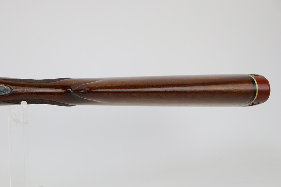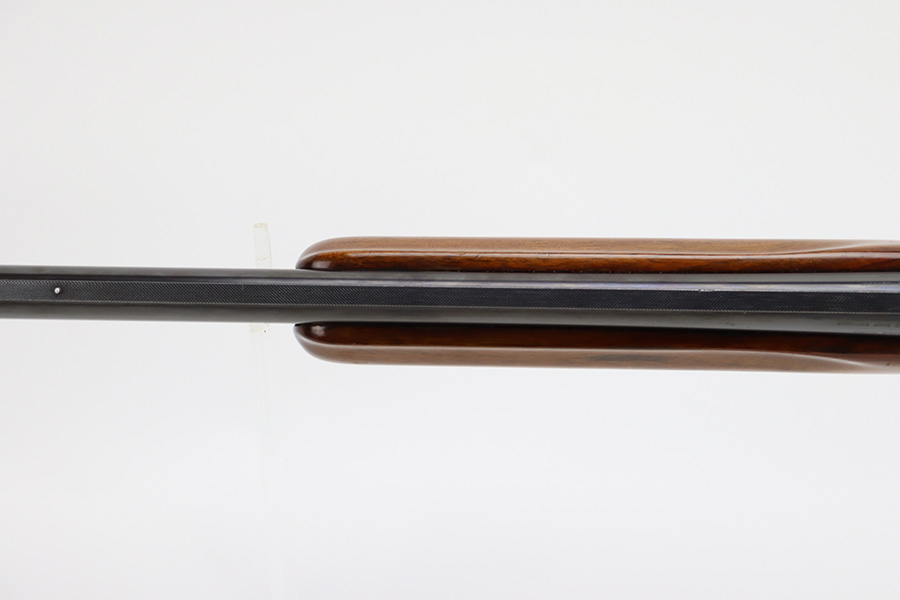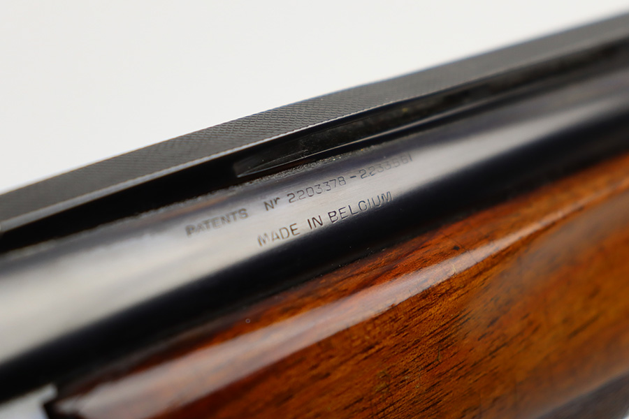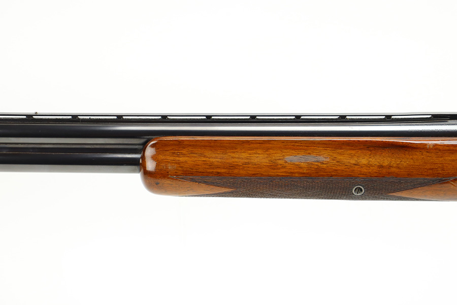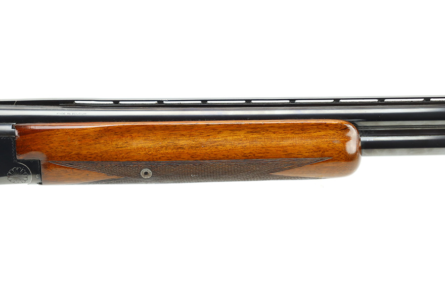 1/16/24 – This is an excellent example of a Browning Superposed Over/Under Shotgun Set, manufactured in Belgium in 1951. It is chambered in 12 GA, but comes with a complete set of scarce, full-length tube inserts for .410, 28, and 20 gauges. It also comes with all of the proper hardware. The gun, the tube inserts, and the hardware all come in a really nice green velvet-lined carrying case. The gun itself is a Grade I and has retained about 90% of its original high polish bluing. The majority of the wear is on the high edges of the receiver and on the lower tang of the trigger guard. The wood furniture is excellent with just some extremely light cracking in the laminate finish. Excellent, shiny bores. 30″ barrels, 14.5″ LOP.
