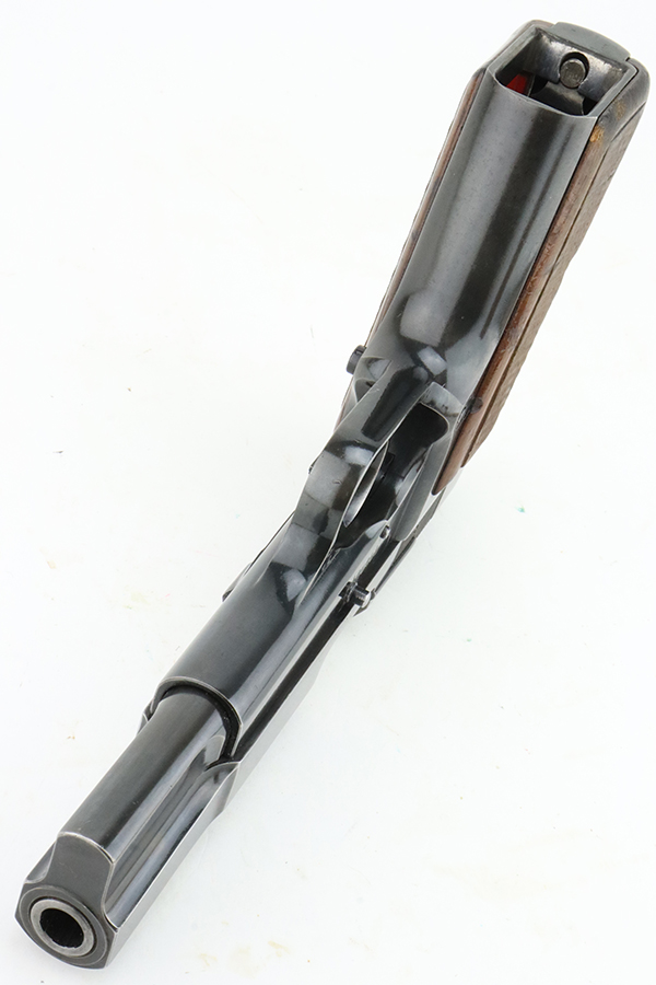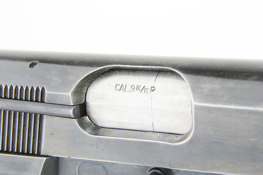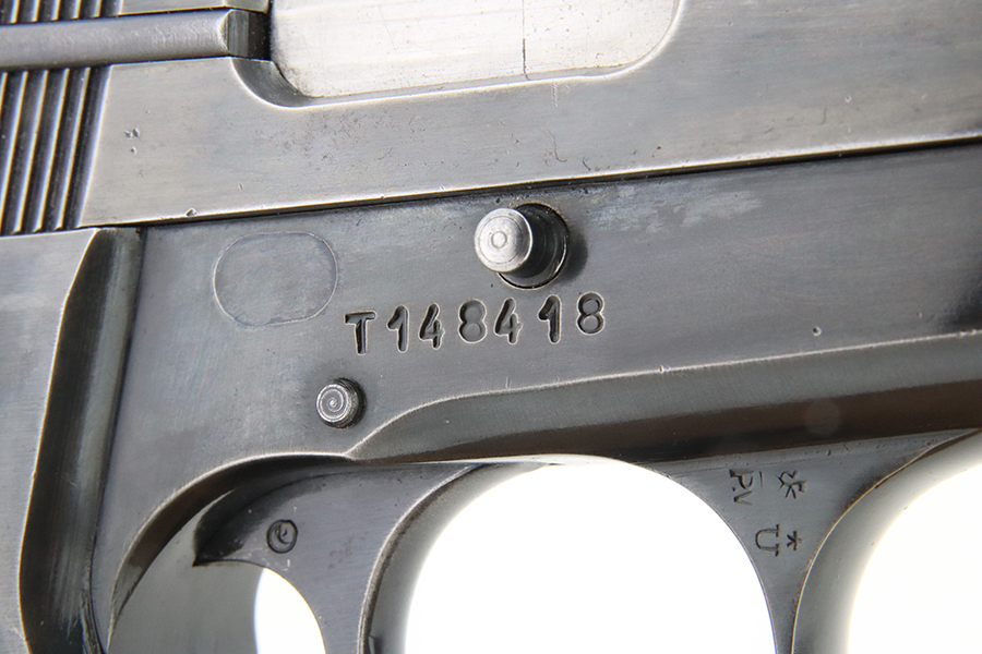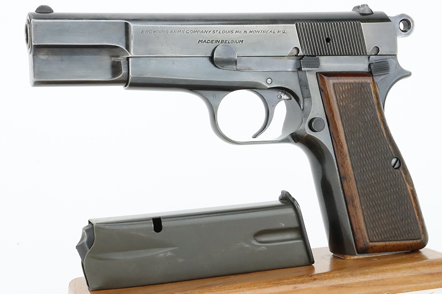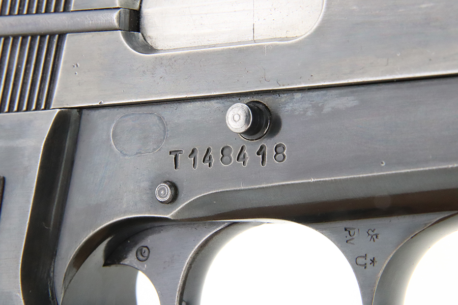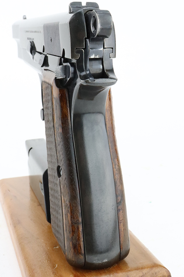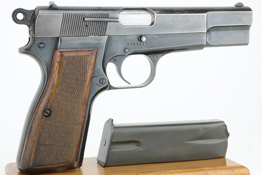 3/5/24 – This is a Browning Hi Power with a T-Series serial manufactured in 1966. The “T Series” guns are regarded by collectors as being the last run of FN’s high polish guns with a quality factory fit and finish. This one has retained somewhere between 85-90% of its high polish finish. There is general high edge, thinning on the slide, and some light pin-pricking on the grip straps. Fitted with wood grips and comes with one magazine. Minty bore.