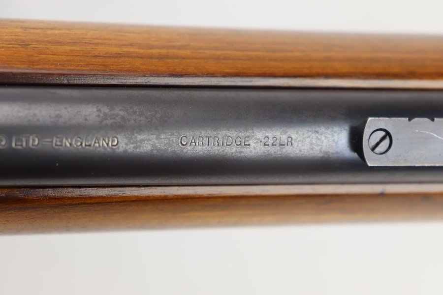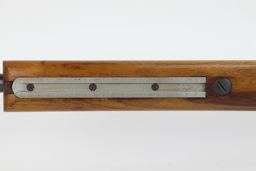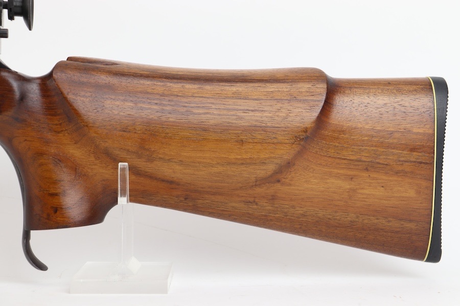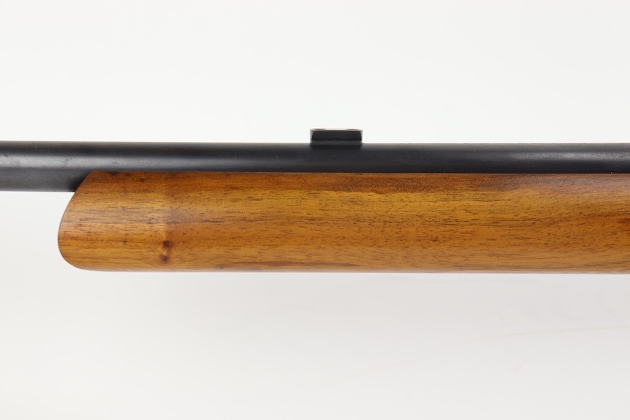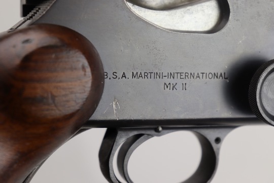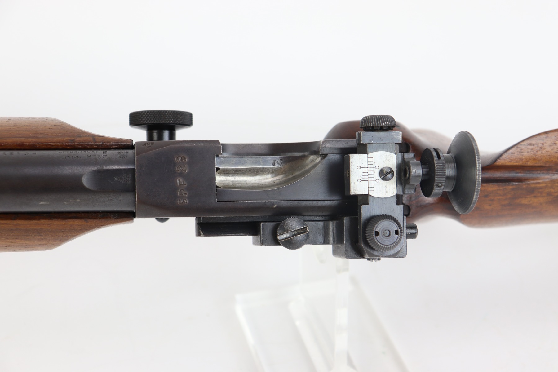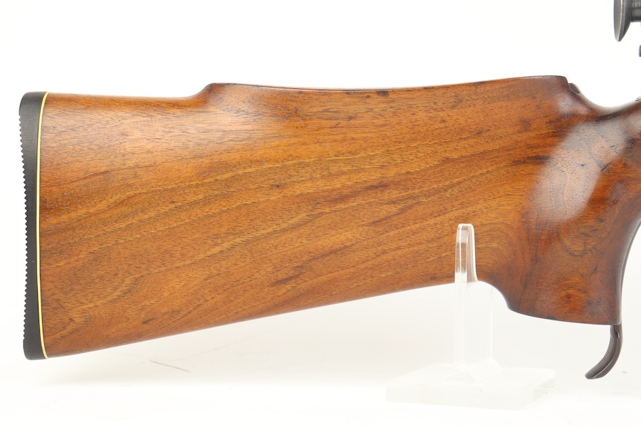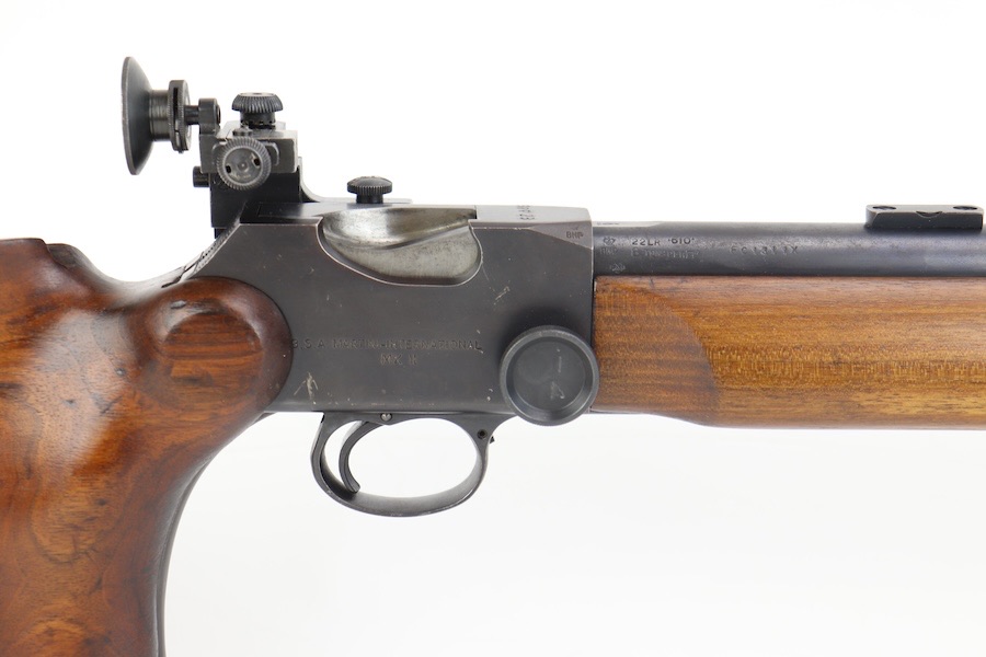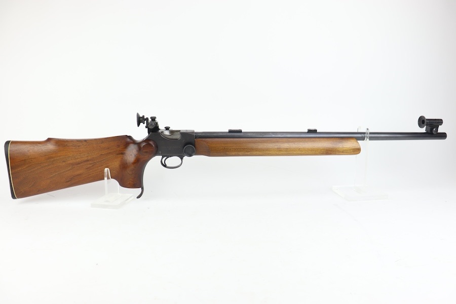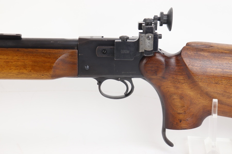 3/21/24 – Beautiful condition. Birmingham Small Arms, Martini International .22 caliber match rifle. Featuring a 25” medium-weight barrel with an excellent bore that rates a 9.5 out of 10. Target scope blocks. Olympic front target sight and international micrometer rear sight are both made by Parker Hale. Barrel and receiver bluing rate is about 90%, with only minor wear and light pin pricking on the barrel. Underlever Martini action works beautifully. The wood stock has minimal wear.