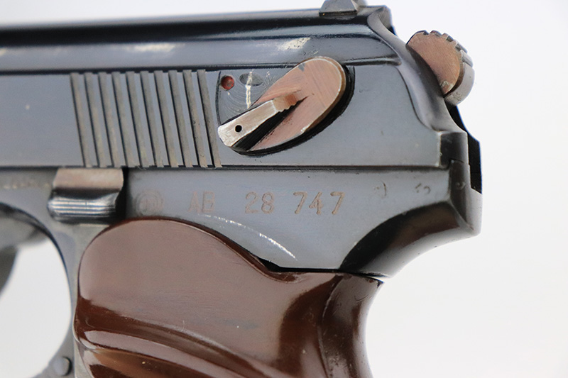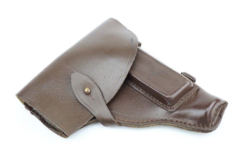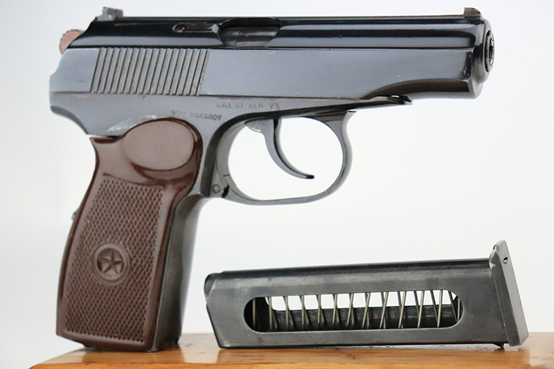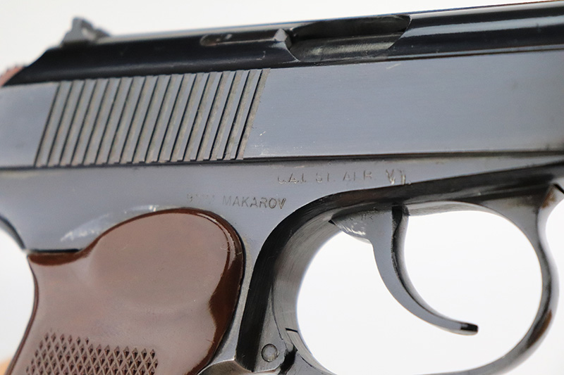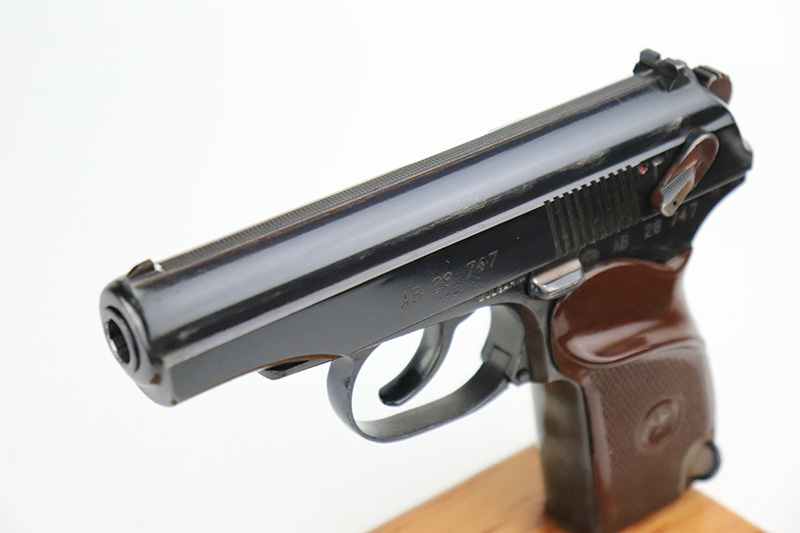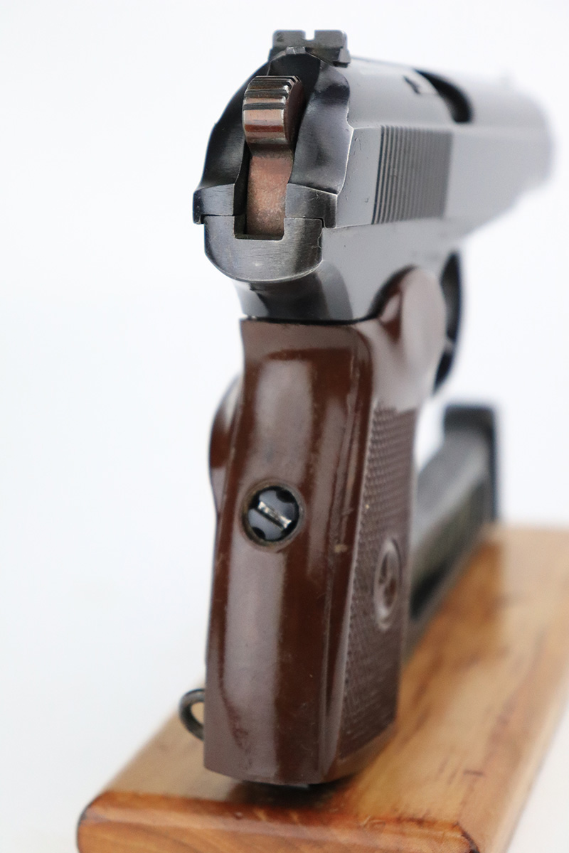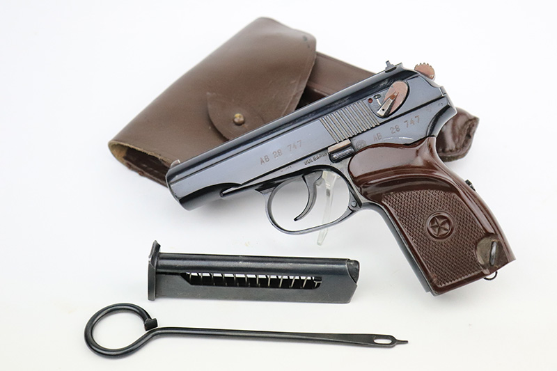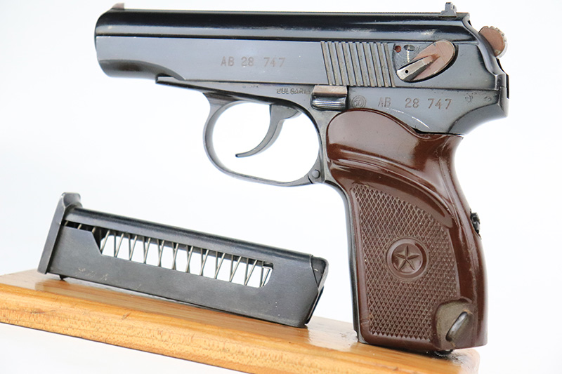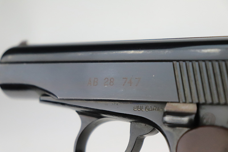 9/23/22 – This is a very nice example of a Bulgarian Makarov manufactured in 1988. It is all matching, has the proper “Circle 10” arsenal marking, and has an import mark. Comes as a rig with one matching-numbered magazine, cleaning rod, and a minty 1989-dated leather holster. The gun has retained about 93-94% of its original high polish finish. The majority of the finish loss is on the front strap, but there is also very minor wear along the round edges of the slide. Comes with a nice brown plastic grip. Near-mint bore.
