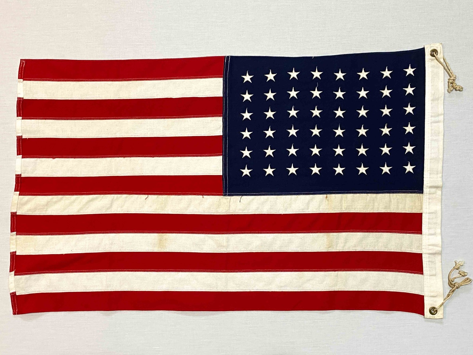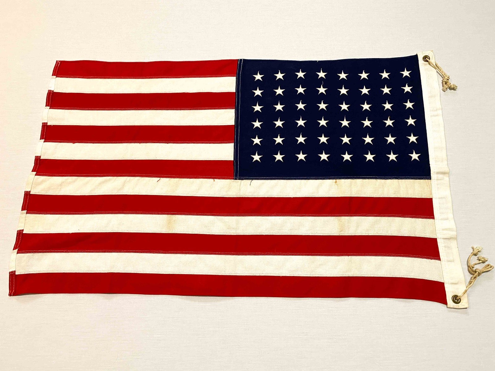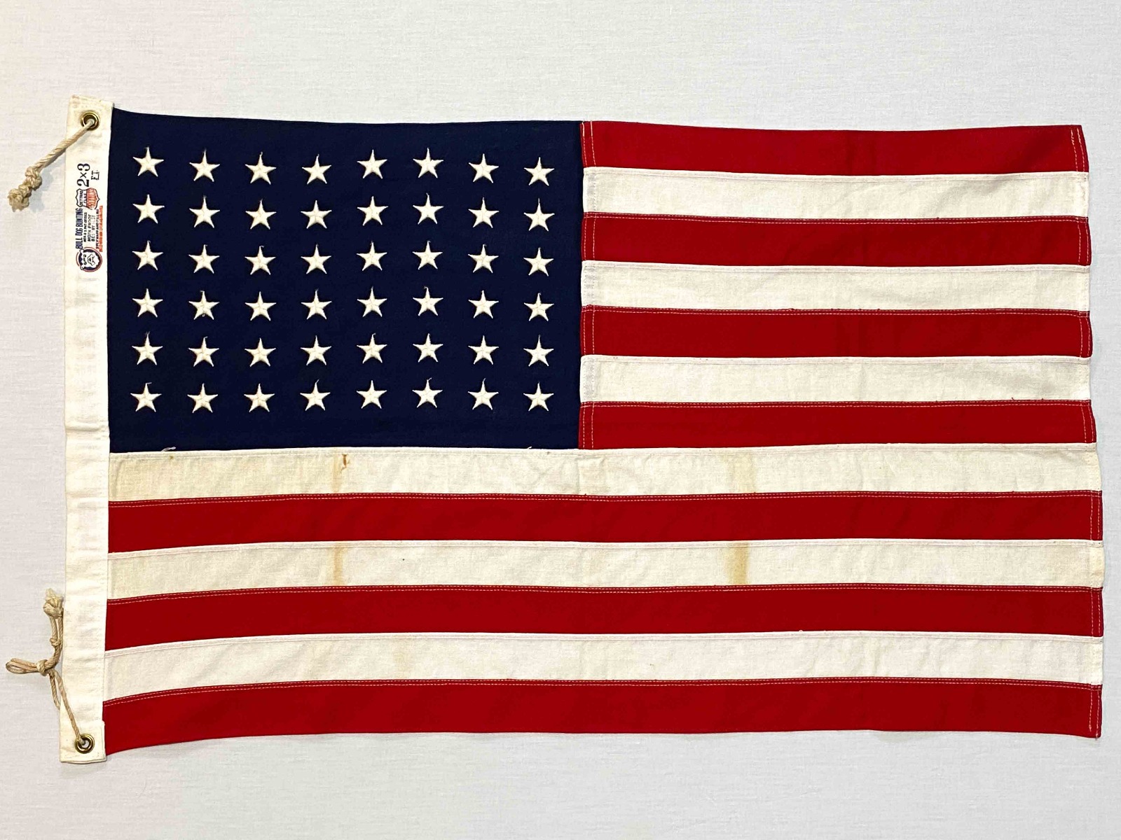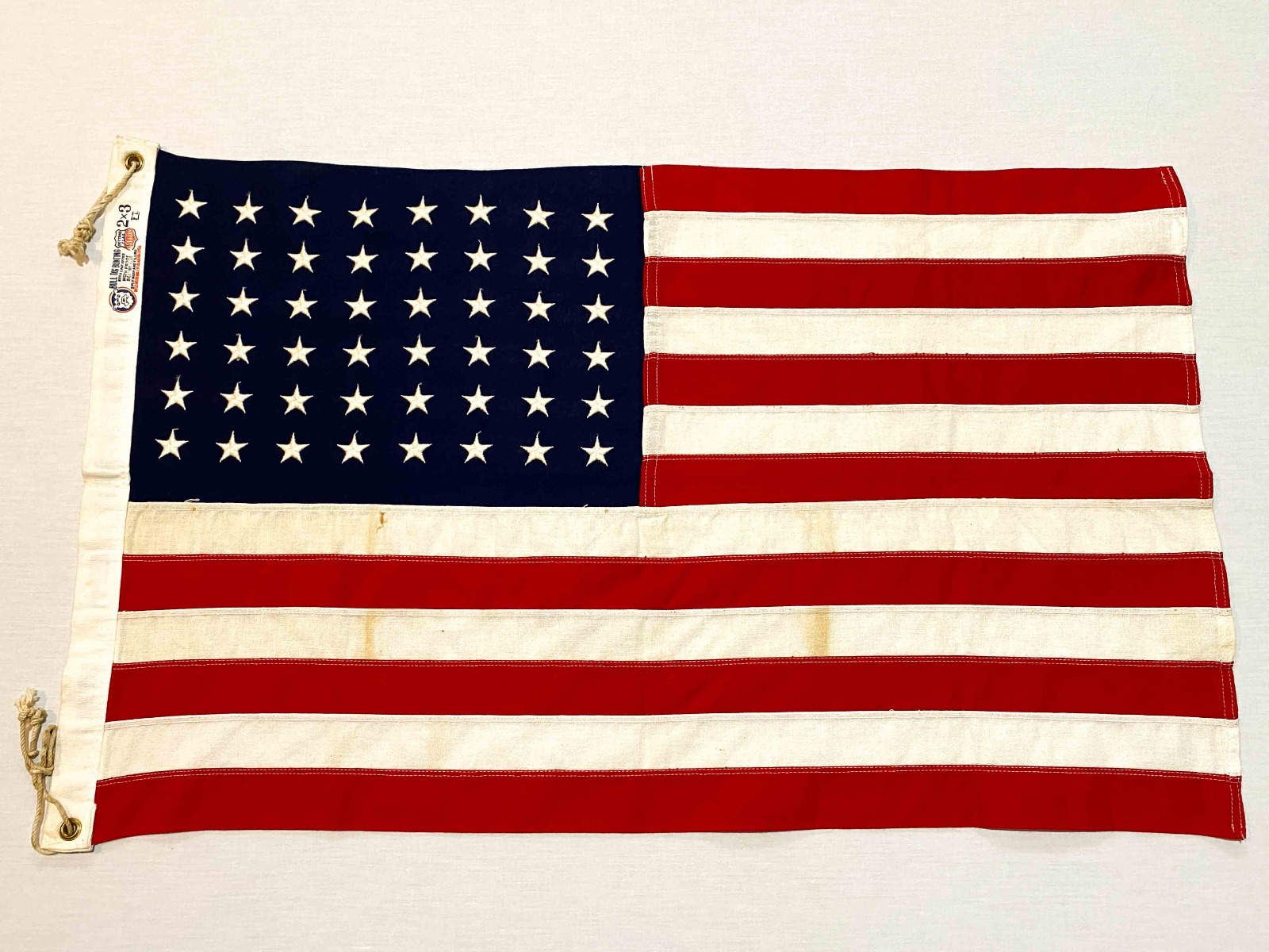 5/6/20 – This is an original Korean War era U.S. 48 star flag. The flag is made by Bull Dog Bunting, as shown on the seam. The flag is 2×3 feet, a smaller, more desirable size. The flag has a few very minor stains but overall is in excellent condition. These were made between 1945 and 1950.