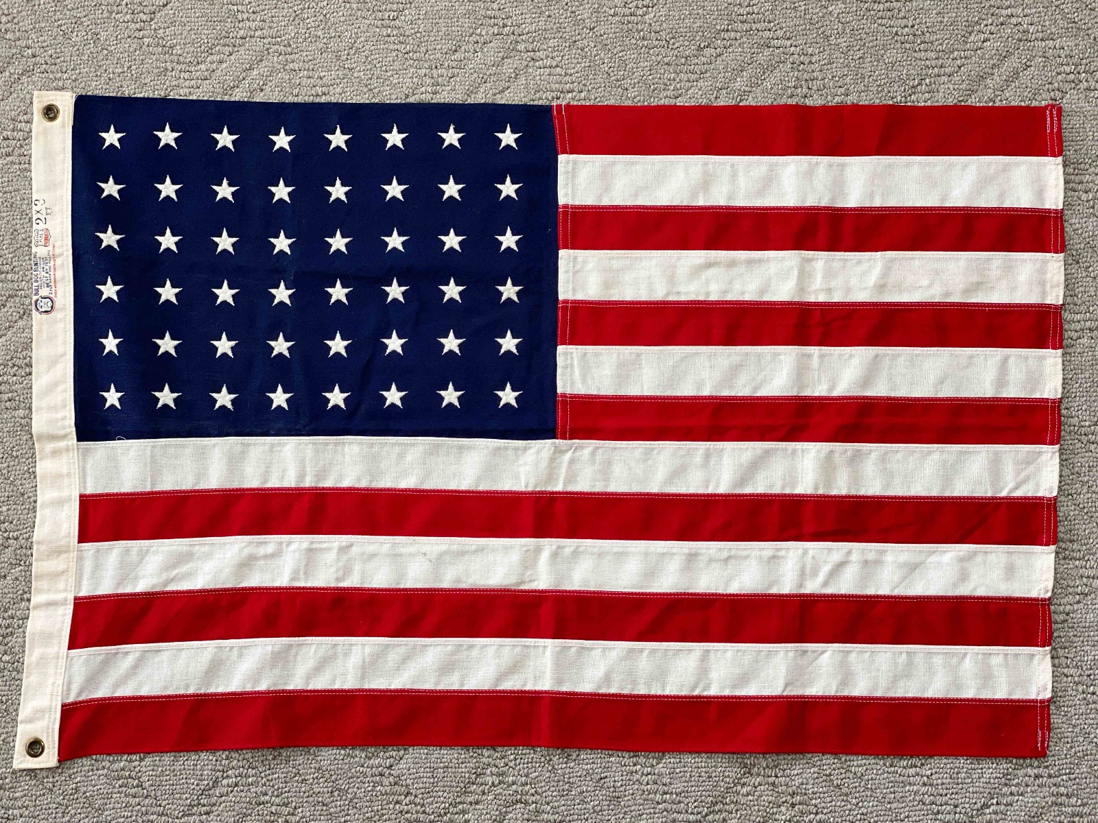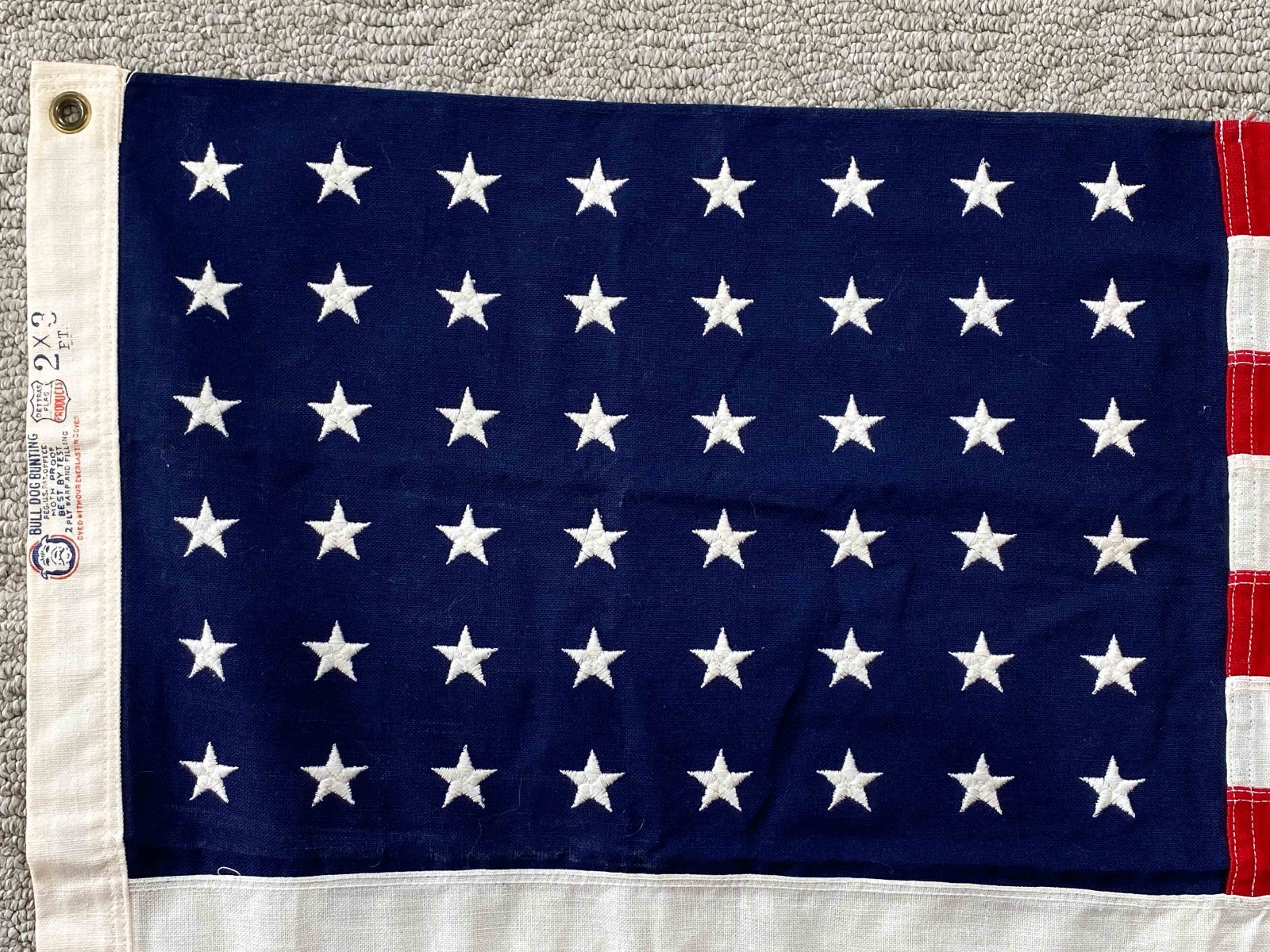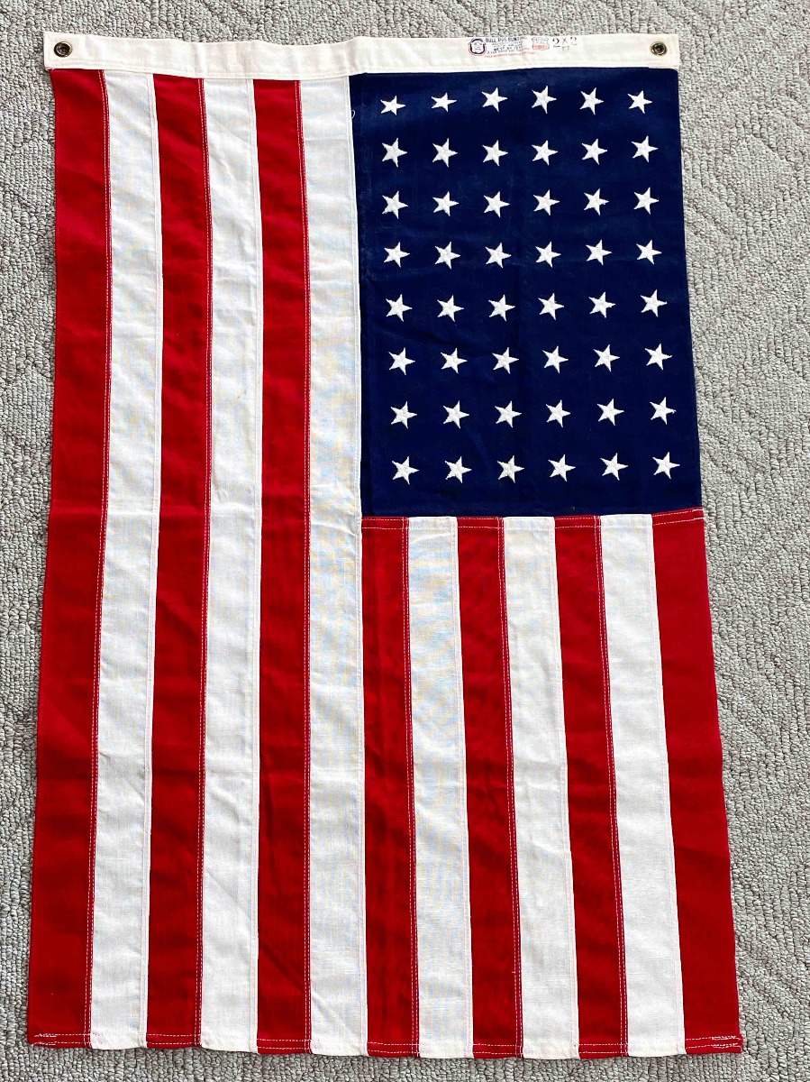 7/12/21 – This is an original 48 star US military flag made by Bull Dog Bunting. The flag is in excellent condition and measures 2×3 ft.