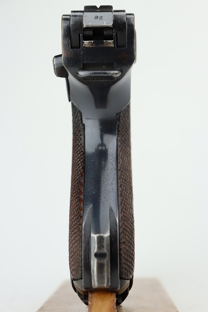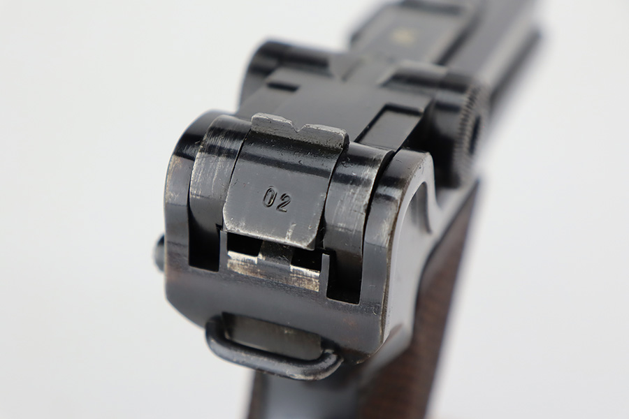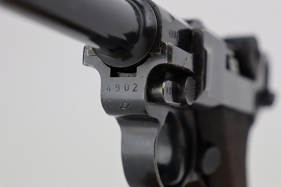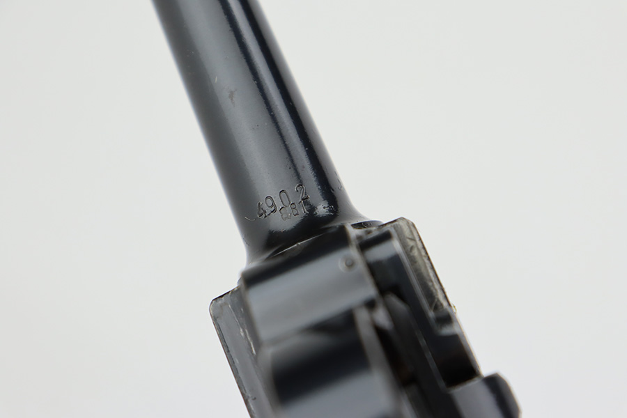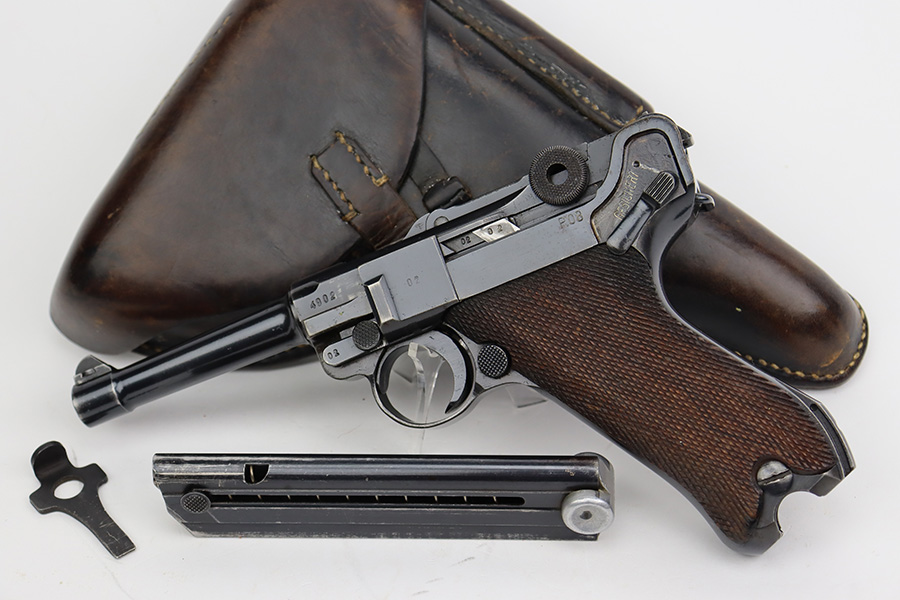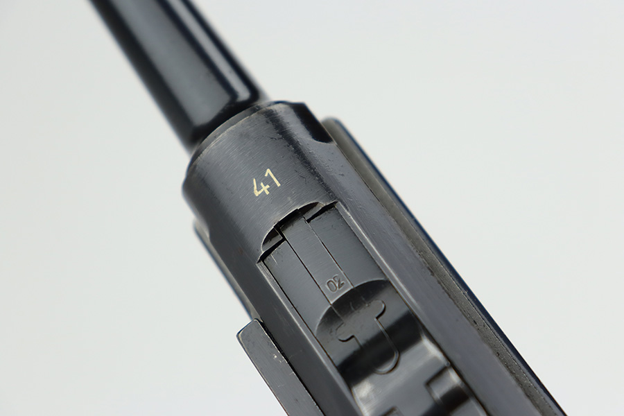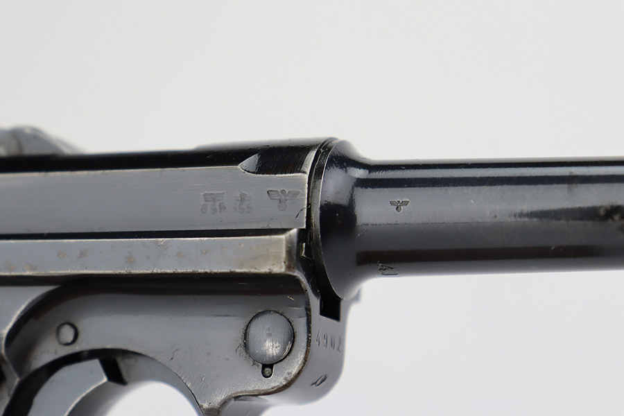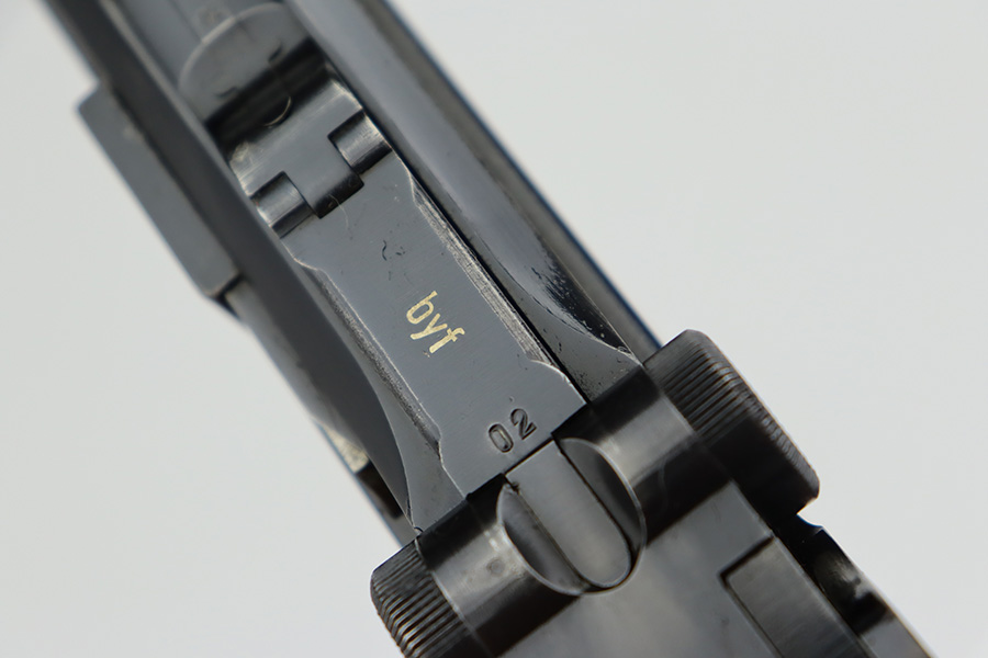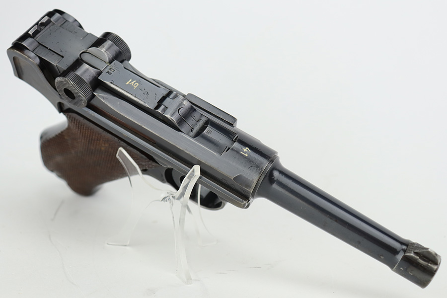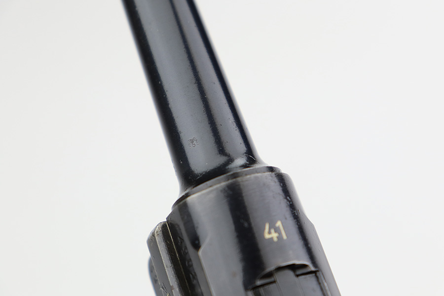 8/15/23 – This is a very nice example of a BYF 41 Mauser Luger issued to the Nazi military in 1941. It is all matching and has the proper “Eagle 655” military acceptance proofs. It comes as a rig with one original matching-numbered magazine, an “Eagle 655” tool, and a very nice 1941-dated holster. Some of the pieces on the inside of the holster are made from pigskin leather. The gun itself has retained about 93-94% of its original finish. There is minor wear around the muzzle and on the high edges, some light pin-pricking on the grip straps, and some spotty discoloration along the right side of the barrel and frame. Fitted with excellent un-numbered but “Eagle 655” proofed wood grips. The bore is shiny for the most part with strong rifling, but there is some light spotty oxidation around the muzzle end.
