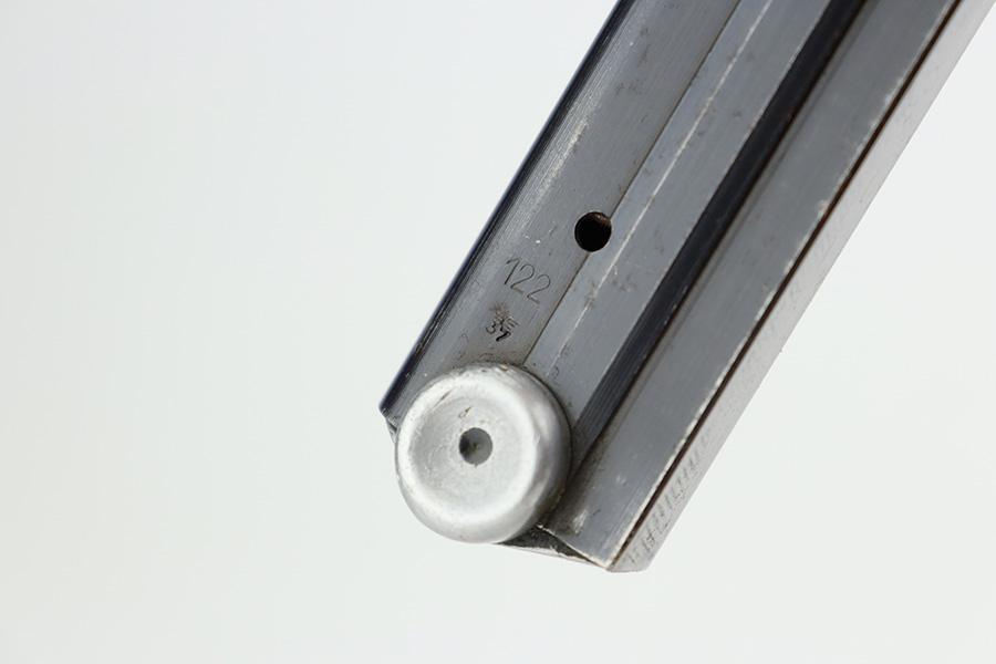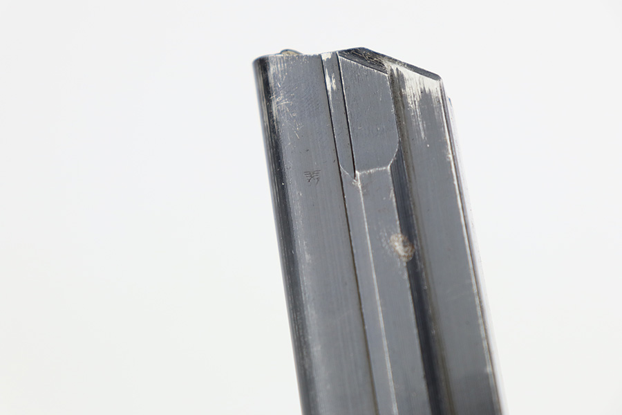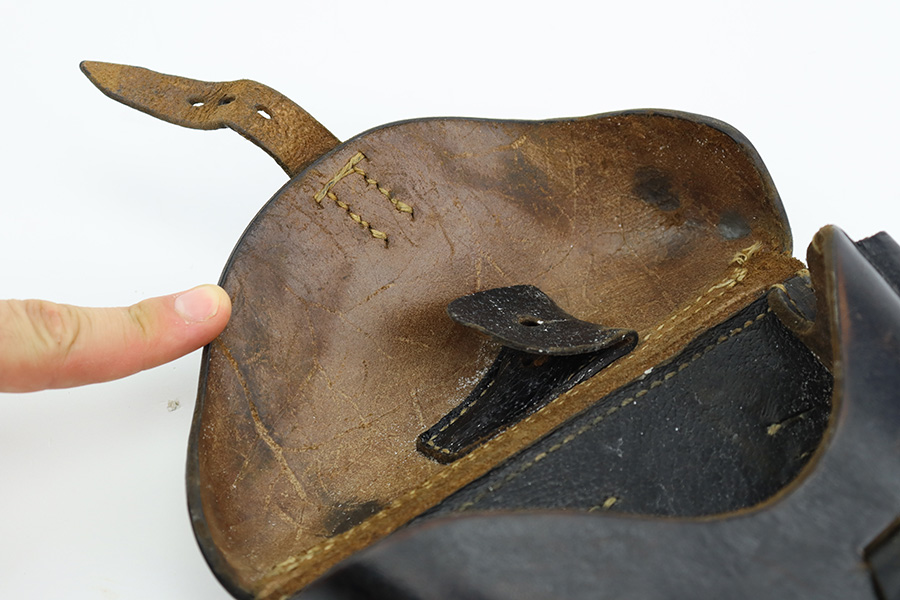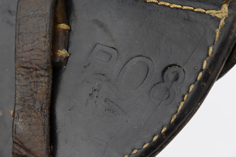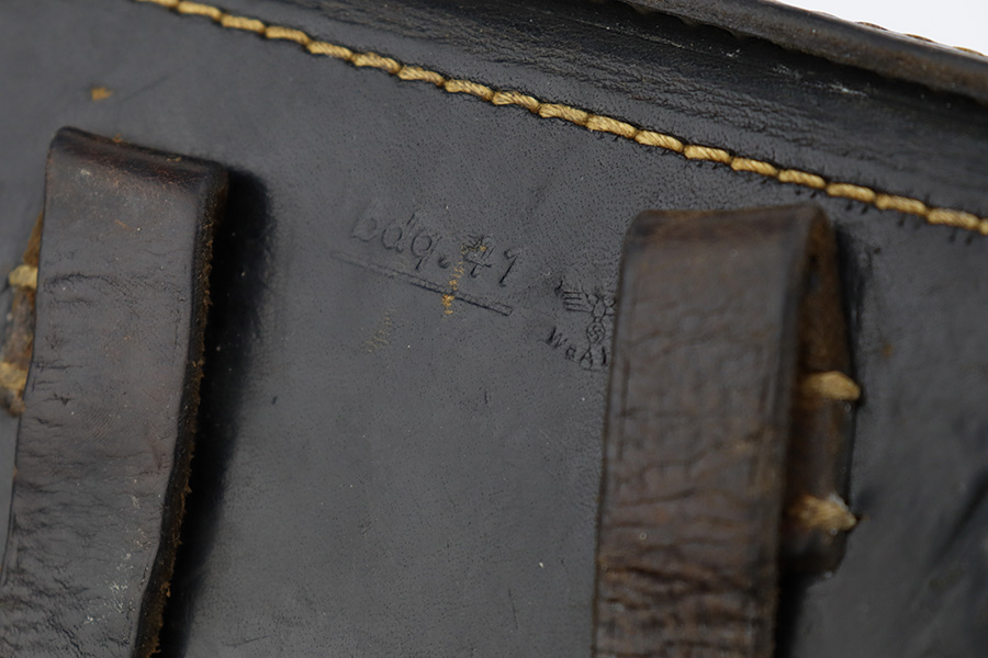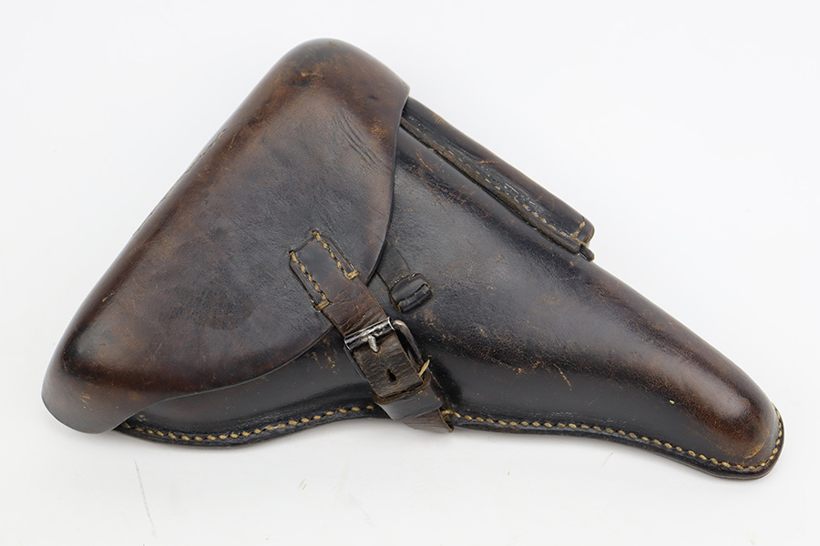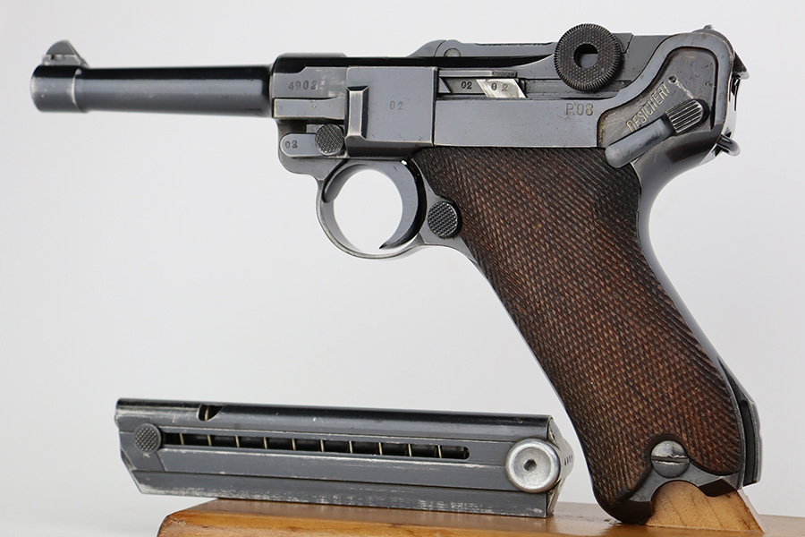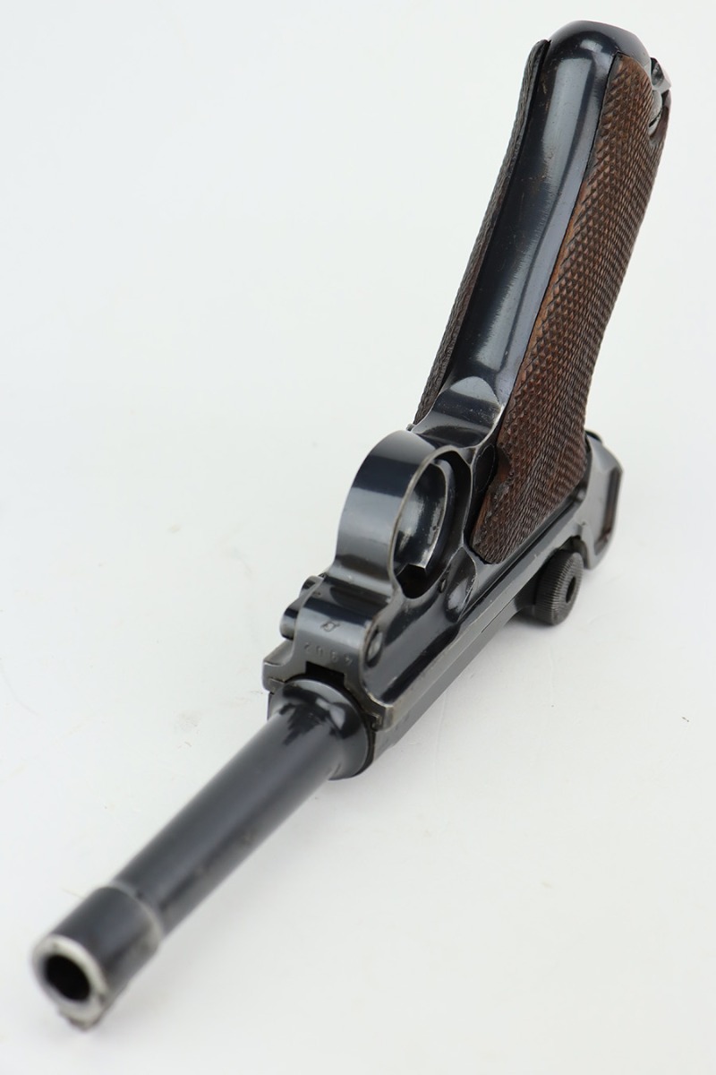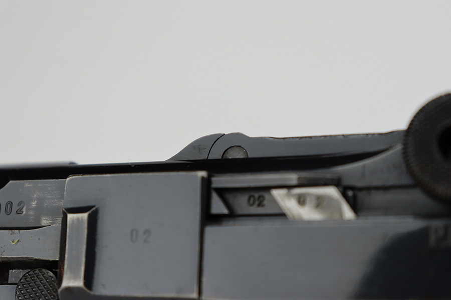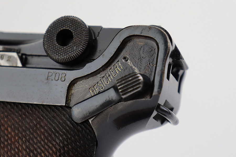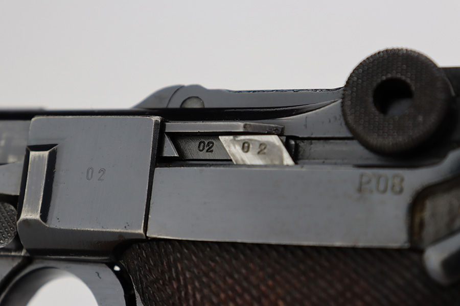 8/15/23 – This is a very nice example of a BYF 41 Mauser Luger issued to the Nazi military in 1941. It is all matching and has the proper “Eagle 655” military acceptance proofs. It comes as a rig with one original matching-numbered magazine, an “Eagle 655” tool, and a very nice 1941-dated holster. Some of the pieces on the inside of the holster are made from pigskin leather. The gun itself has retained about 93-94% of its original finish. There is minor wear around the muzzle and on the high edges, some light pin-pricking on the grip straps, and some spotty discoloration along the right side of the barrel and frame. Fitted with excellent un-numbered but “Eagle 655” proofed wood grips. The bore is shiny for the most part with strong rifling, but there is some light spotty oxidation around the muzzle end.