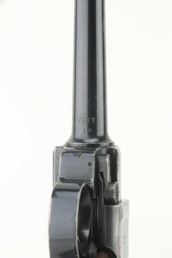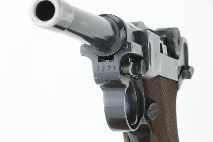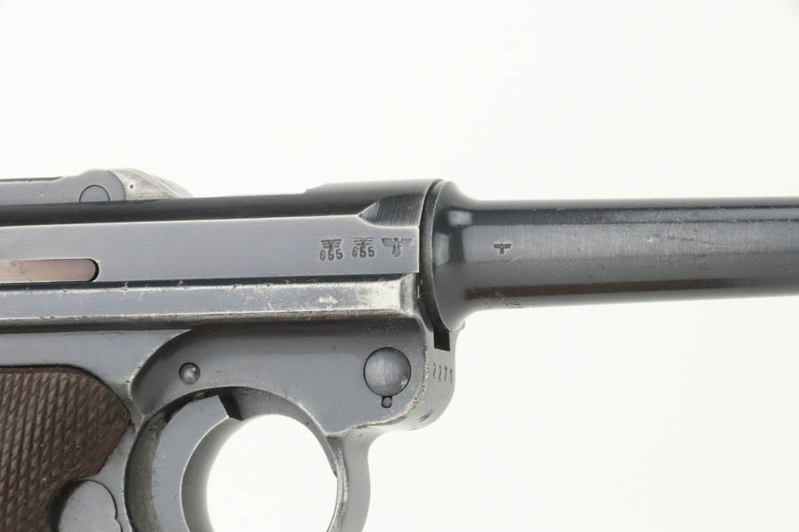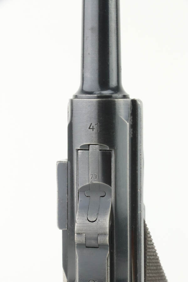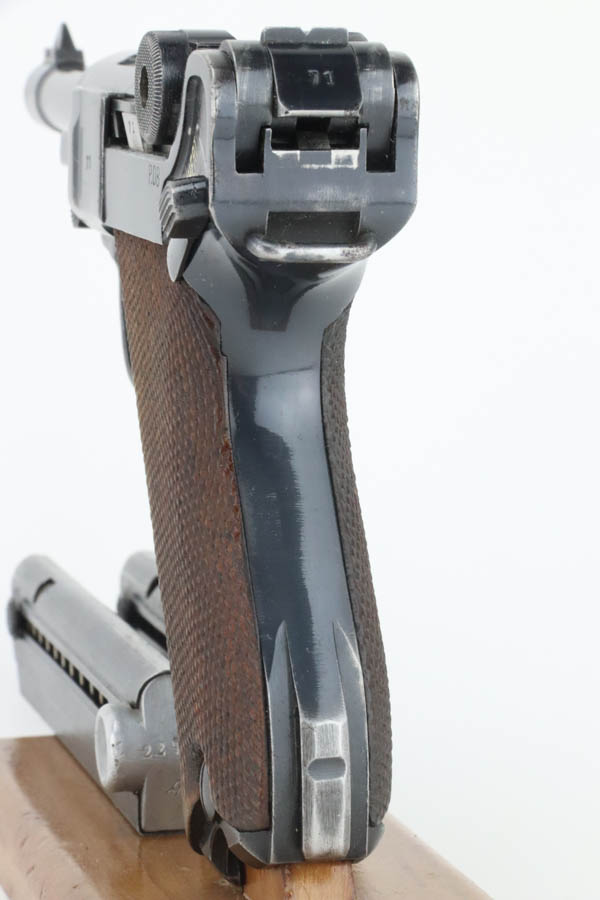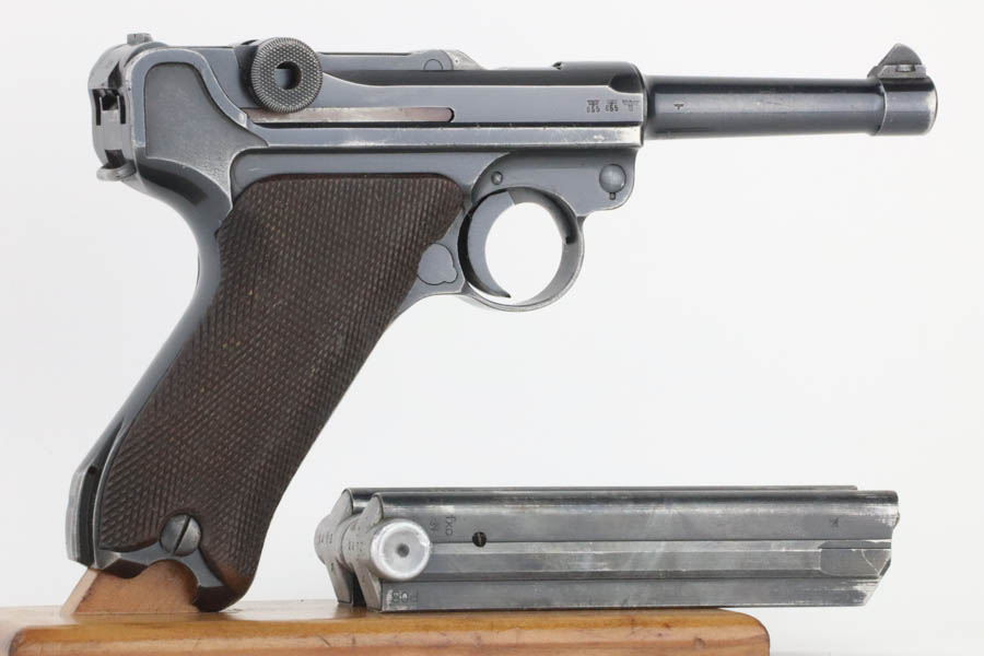 8/6/24 – This is a very nice example of a Mauser Luger issued to the Nazi military in 1941. All matching with the proper “Eagle 655” military acceptance proofs. It comes with two original matching-numbered magazines. The gun has retained somewhere between 85-90% of its original bluing. The majority of the wear is concentrated on the high edges and around the muzzle. Fitted with excellent matching-numbered and “Eagle 655” proofed wood grips. The bore has good rifling, but there is frosting and pin-pricking in the grooves.
