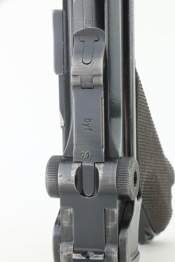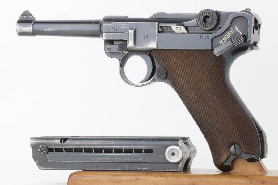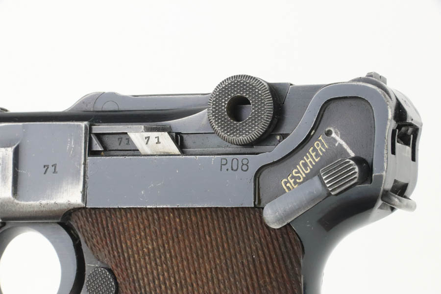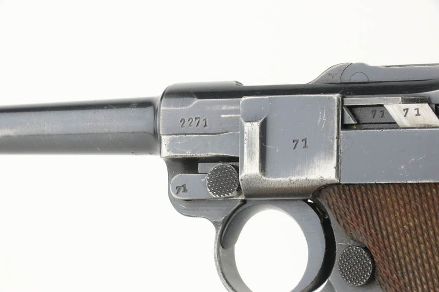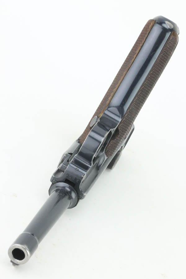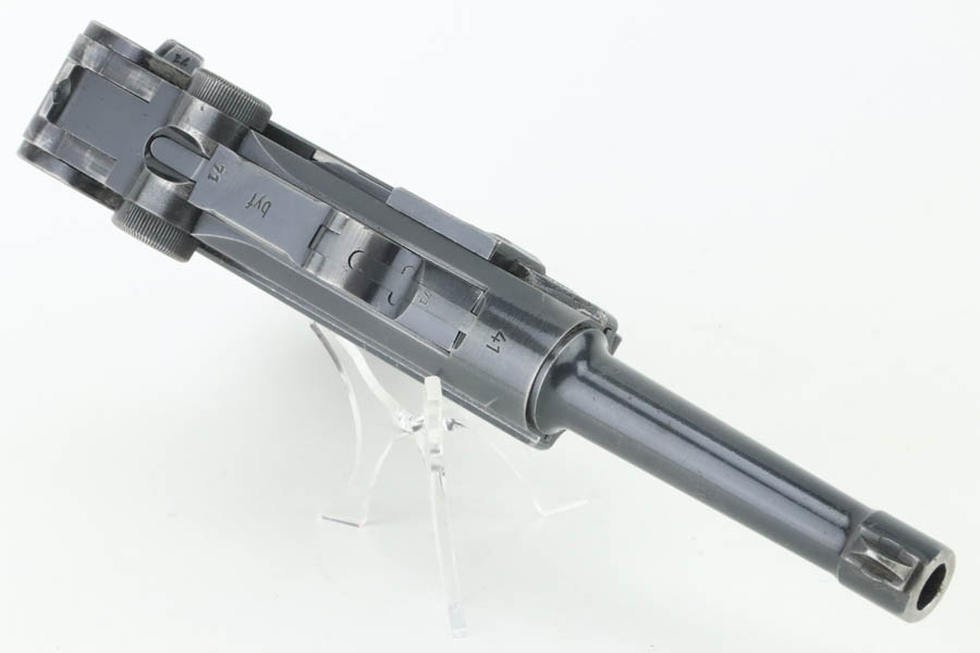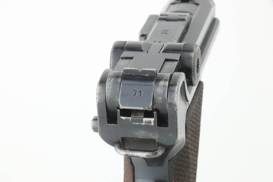 8/6/24 – This is a very nice example of a Mauser Luger issued to the Nazi military in 1941. All matching with the proper “Eagle 655” military acceptance proofs. It comes with two original matching-numbered magazines. The gun has retained somewhere between 85-90% of its original bluing. The majority of the wear is concentrated on the high edges and around the muzzle. Fitted with excellent matching-numbered and “Eagle 655” proofed wood grips. The bore has good rifling, but there is frosting and pin-pricking in the grooves.