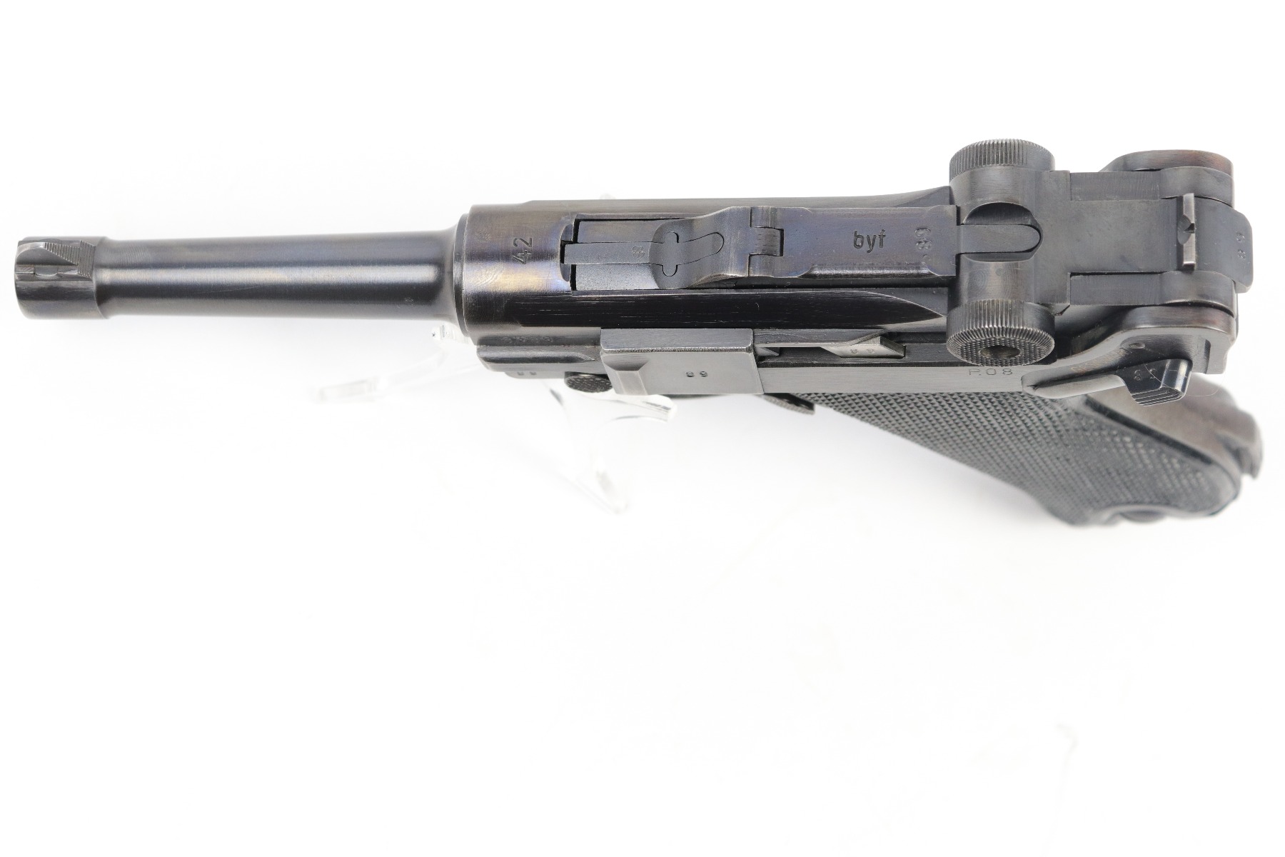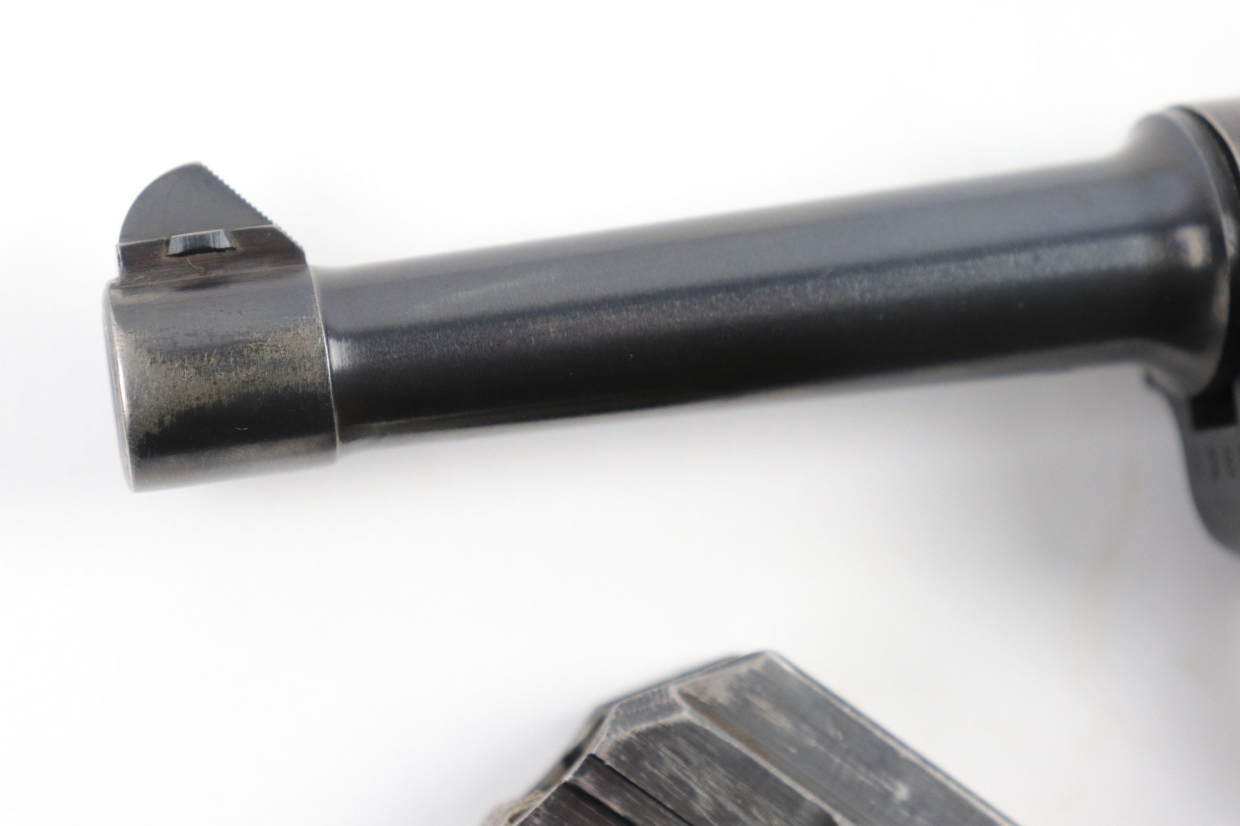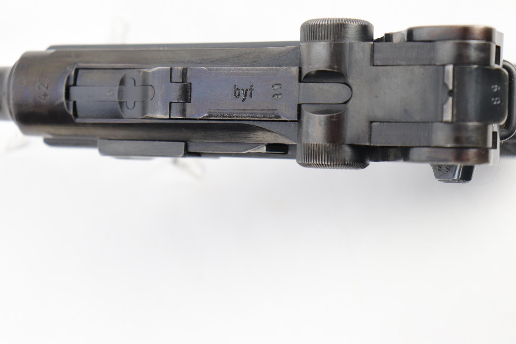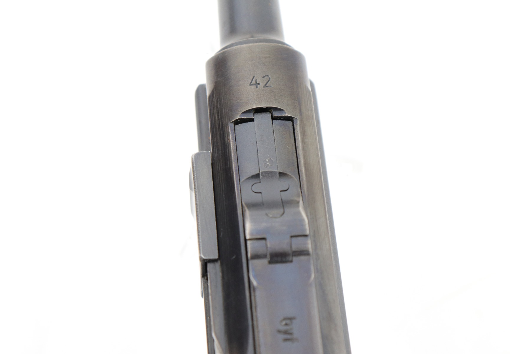 3/28/18 – This is an original Mauser BYF 42 Black Widow Luger. The pistols is all original configuration with all matching serial numbered parts, correct magazine and grip. The finish on the pistol is about 85% in tact, with most of the wear to the blued finish located on the front and back straps. The straps are missing most of the bluing, and the steel metal is showing from underneath. There is also some browning / patina wear on the straps – see photos. There is no active rust or pitting. The pistol also has edge wear on the muzzle and side plate. Overall the gun is mechanically sound, and guaranteed original.
