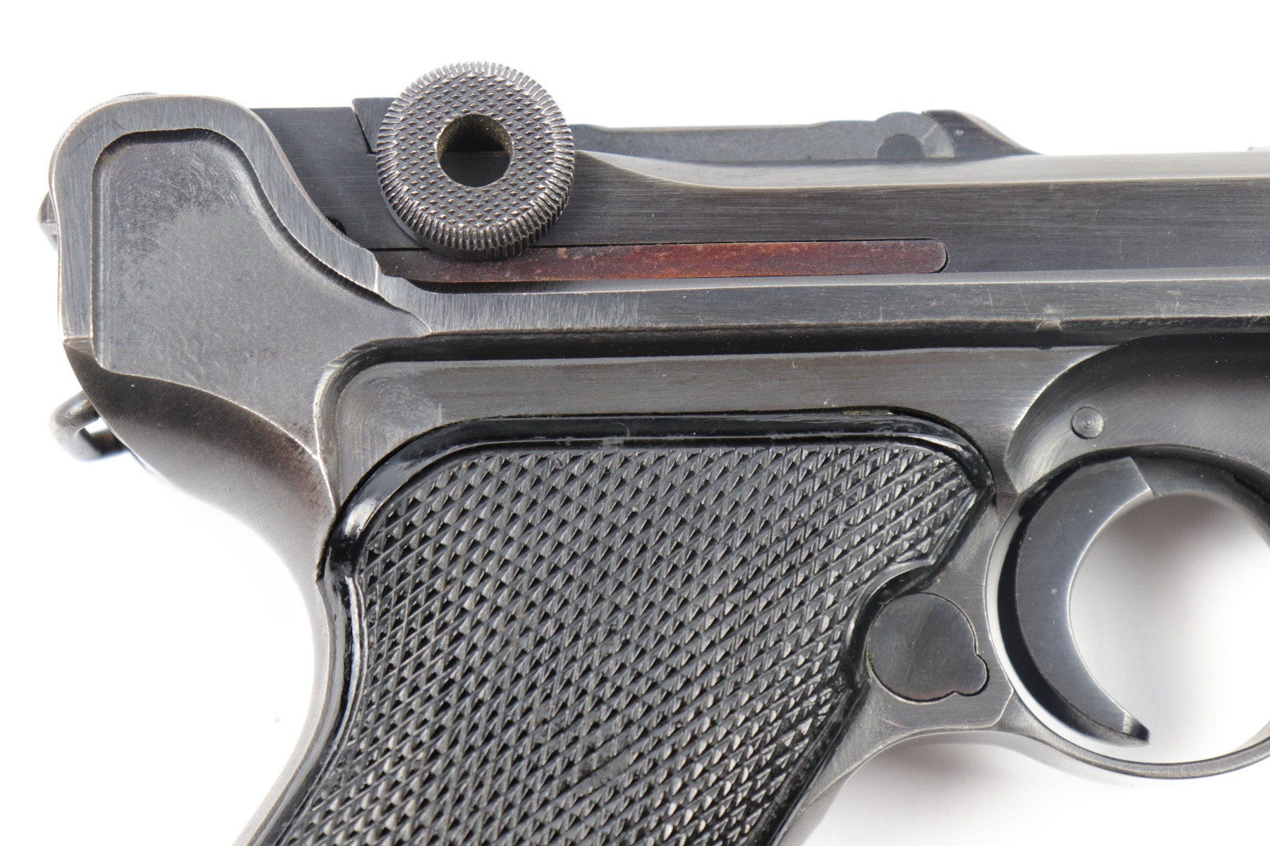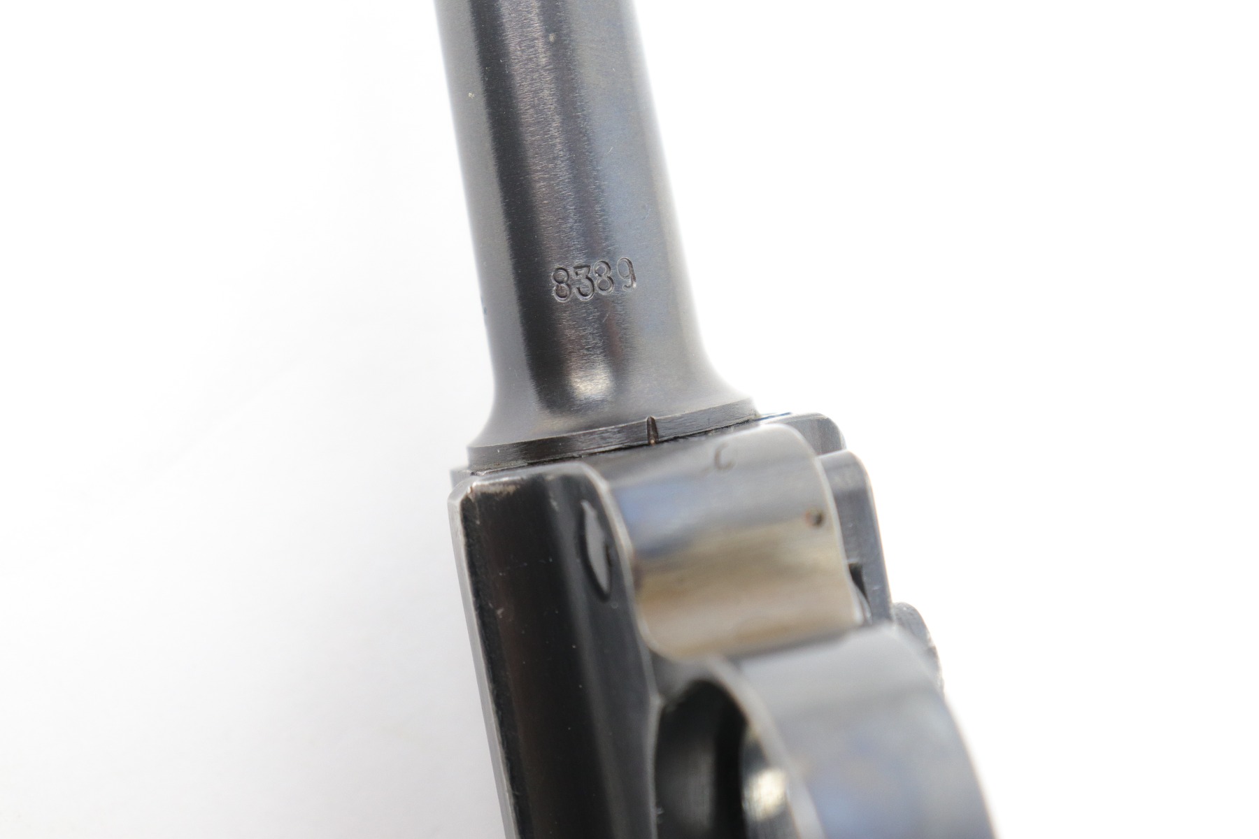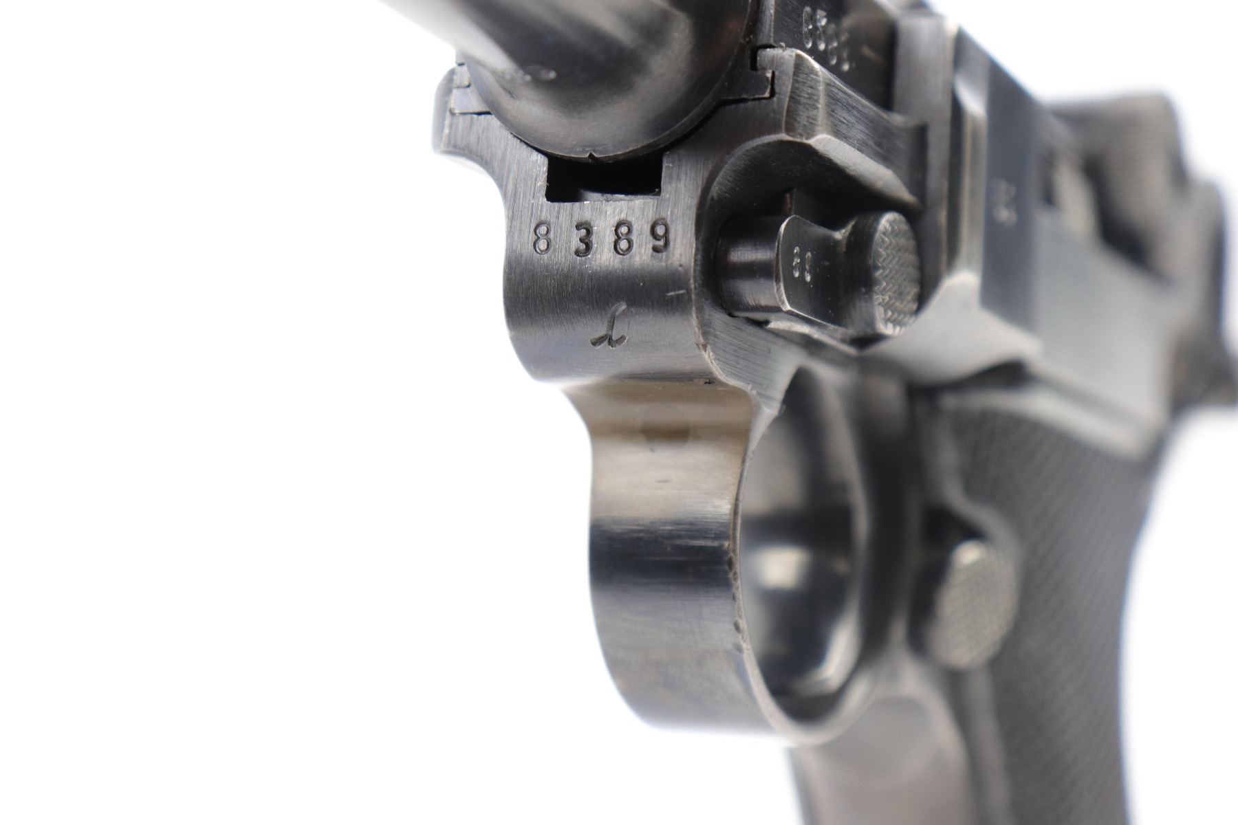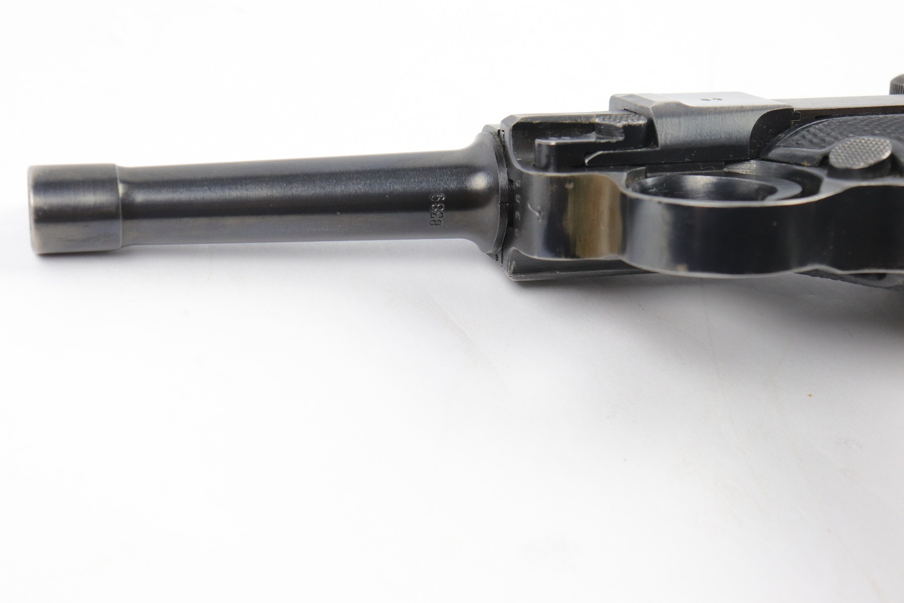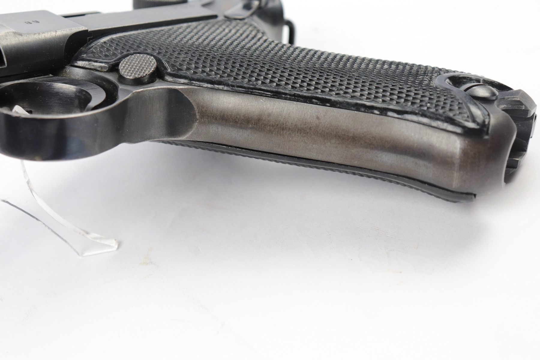 3/28/18 – This is an original Mauser BYF 42 Black Widow Luger. The pistols is all original configuration with all matching serial numbered parts, correct magazine and grip. The finish on the pistol is about 85% in tact, with most of the wear to the blued finish located on the front and back straps. The straps are missing most of the bluing, and the steel metal is showing from underneath. There is also some browning / patina wear on the straps – see photos. There is no active rust or pitting. The pistol also has edge wear on the muzzle and side plate. Overall the gun is mechanically sound, and guaranteed original.