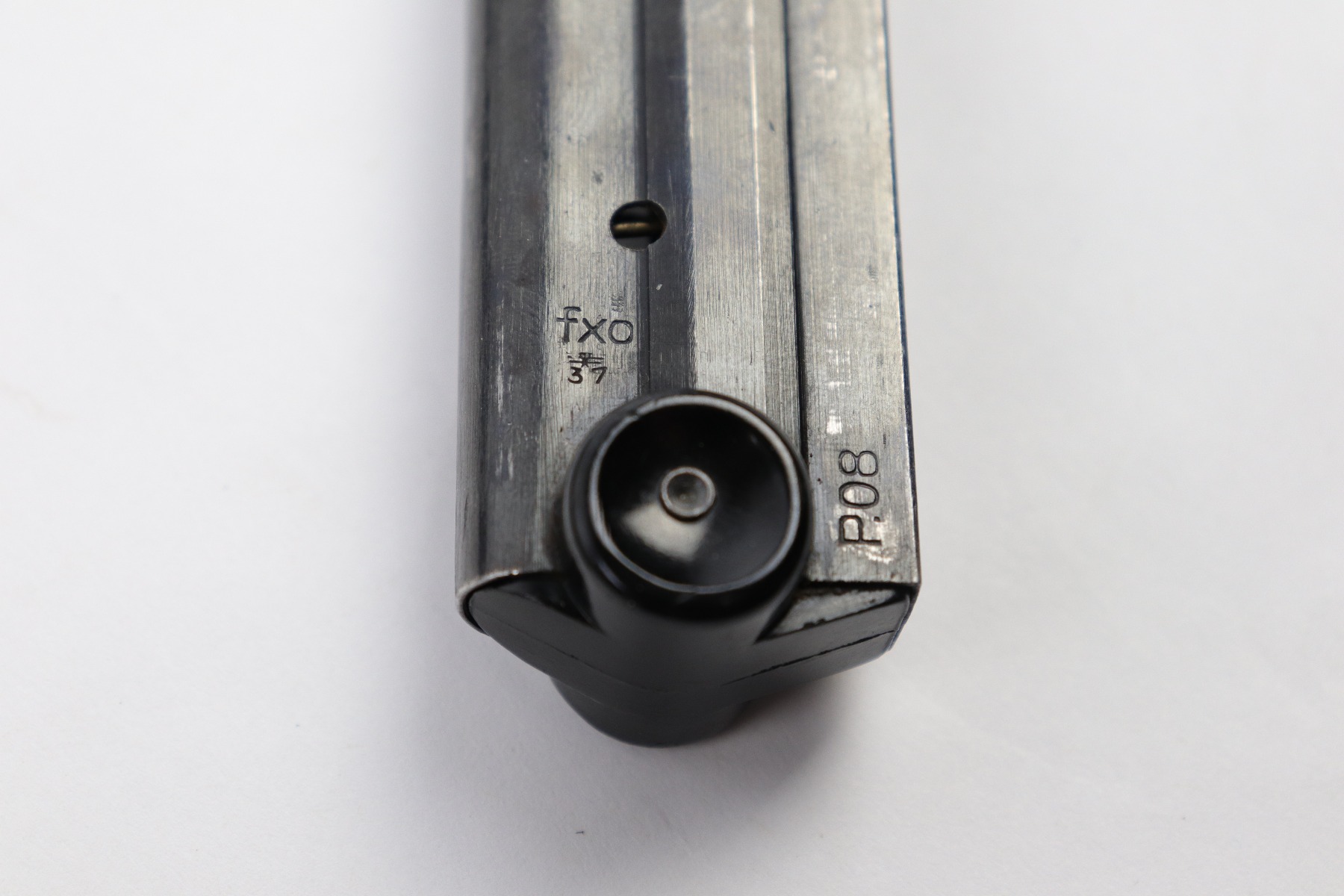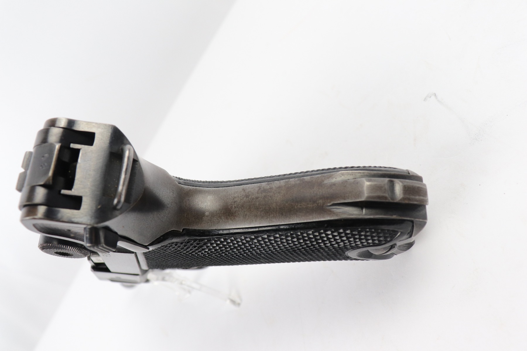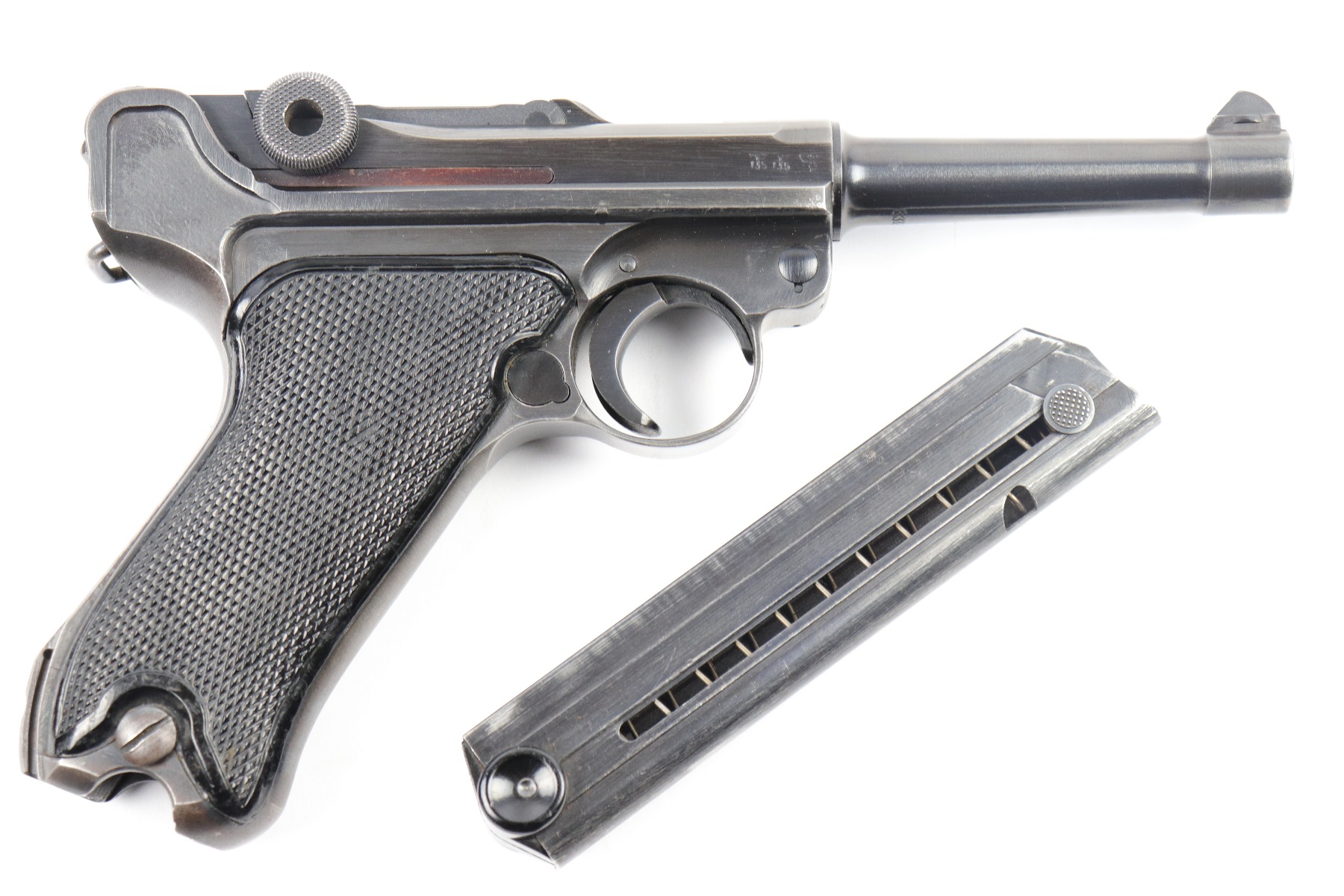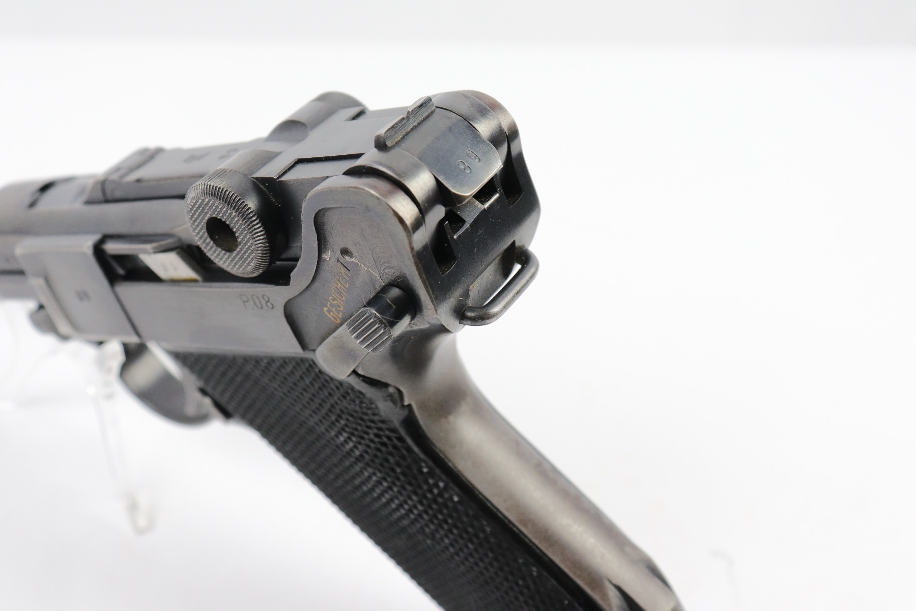 3/28/18 – This is an original Mauser BYF 42 Black Widow Luger. The pistols is all original configuration with all matching serial numbered parts, correct magazine and grip. The finish on the pistol is about 85% in tact, with most of the wear to the blued finish located on the front and back straps. The straps are missing most of the bluing, and the steel metal is showing from underneath. There is also some browning / patina wear on the straps – see photos. There is no active rust or pitting. The pistol also has edge wear on the muzzle and side plate. Overall the gun is mechanically sound, and guaranteed original.