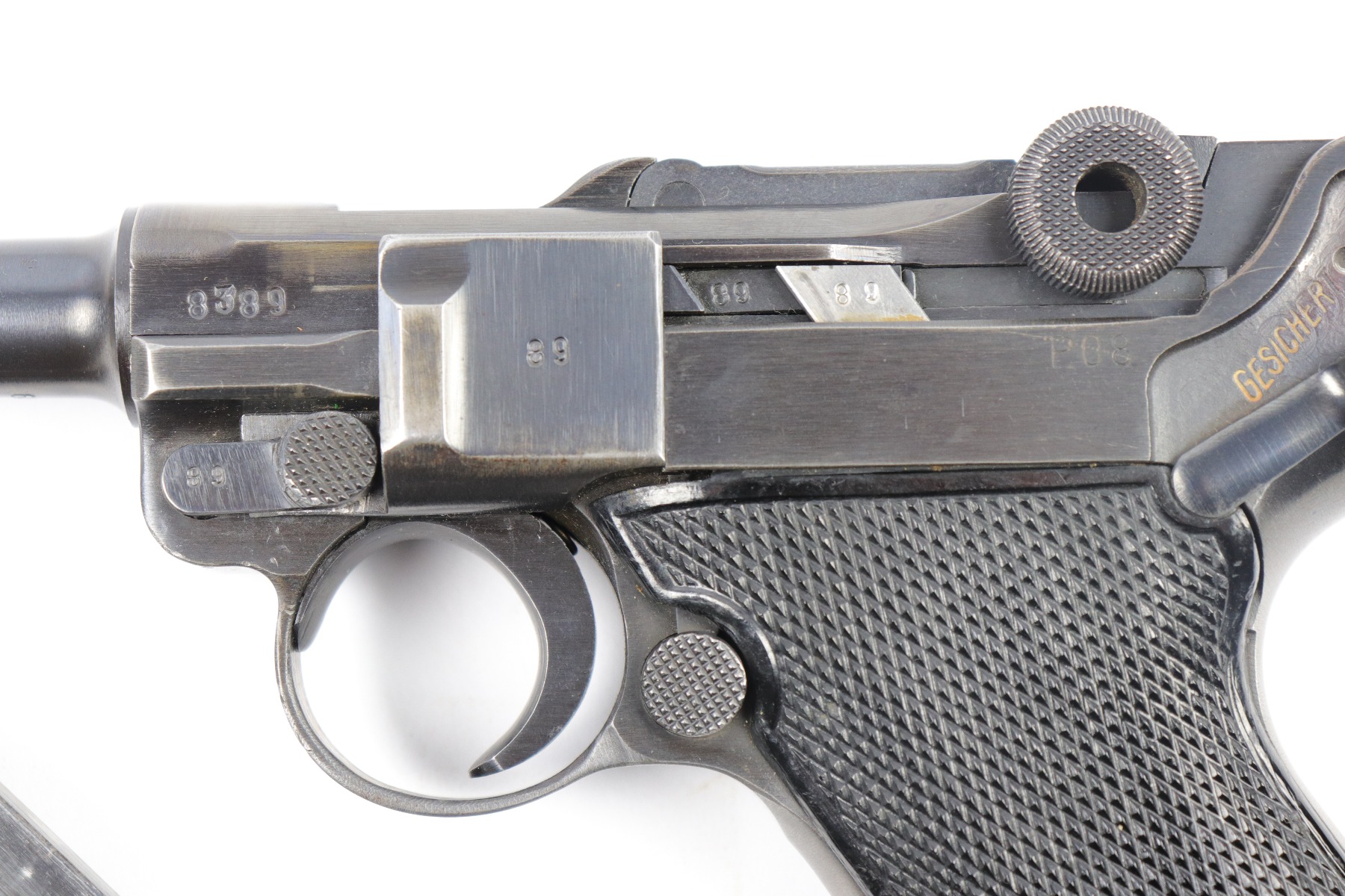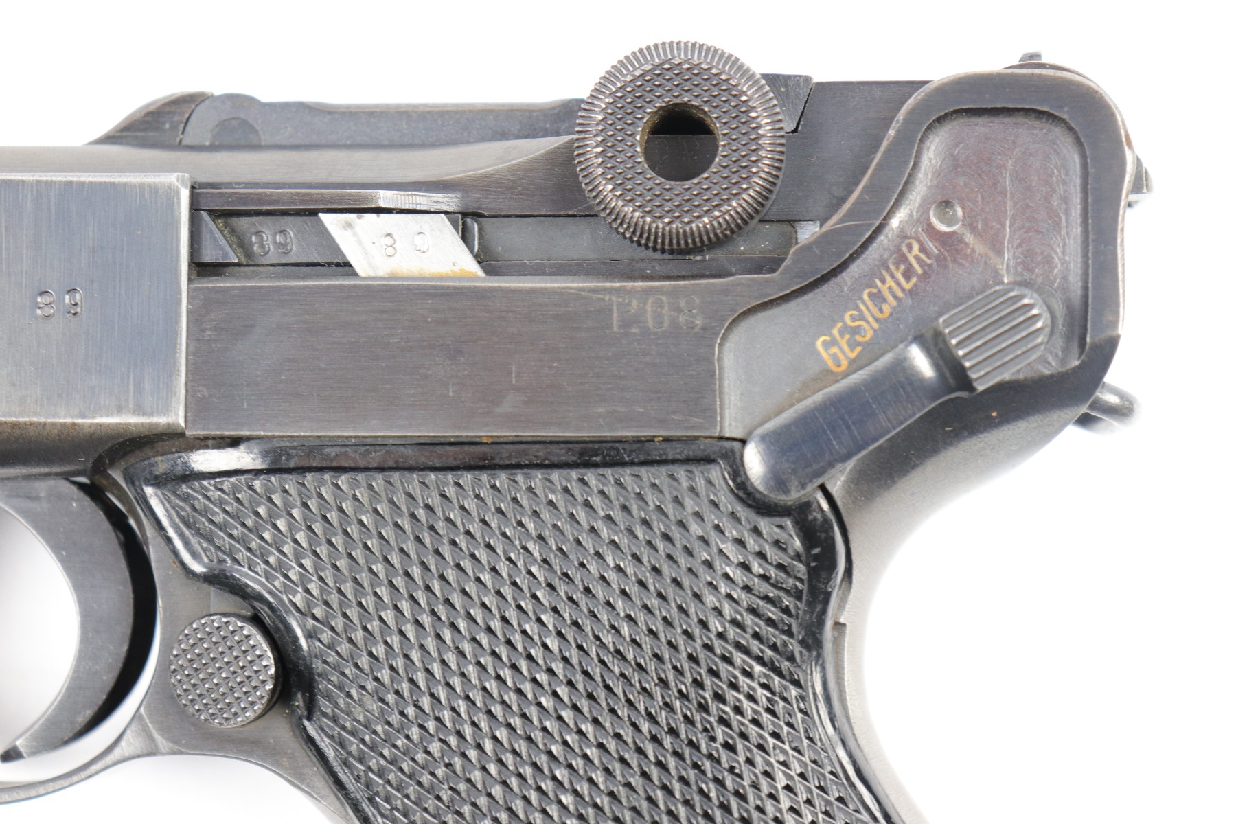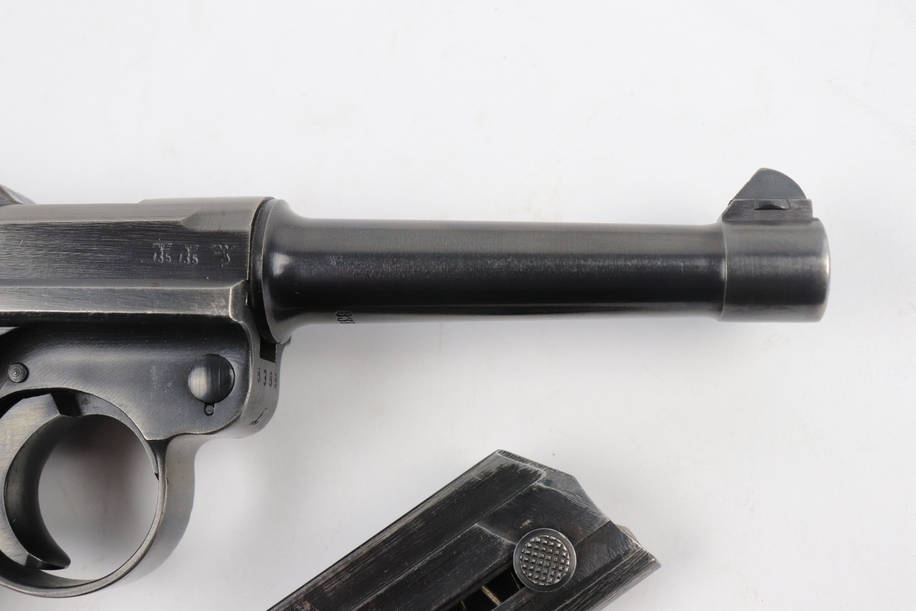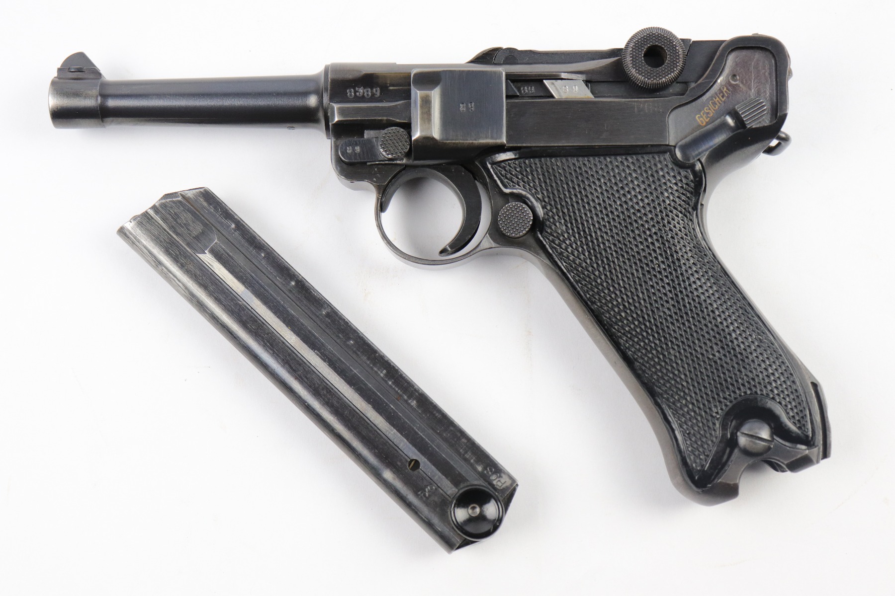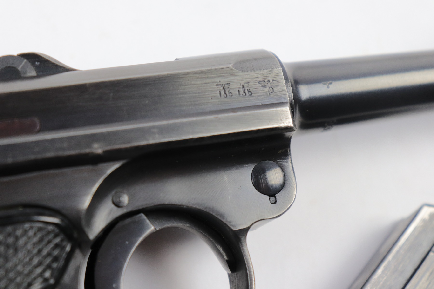 3/28/18 – This is an original Mauser BYF 42 Black Widow Luger. The pistols is all original configuration with all matching serial numbered parts, correct magazine and grip. The finish on the pistol is about 85% in tact, with most of the wear to the blued finish located on the front and back straps. The straps are missing most of the bluing, and the steel metal is showing from underneath. There is also some browning / patina wear on the straps – see photos. There is no active rust or pitting. The pistol also has edge wear on the muzzle and side plate. Overall the gun is mechanically sound, and guaranteed original.