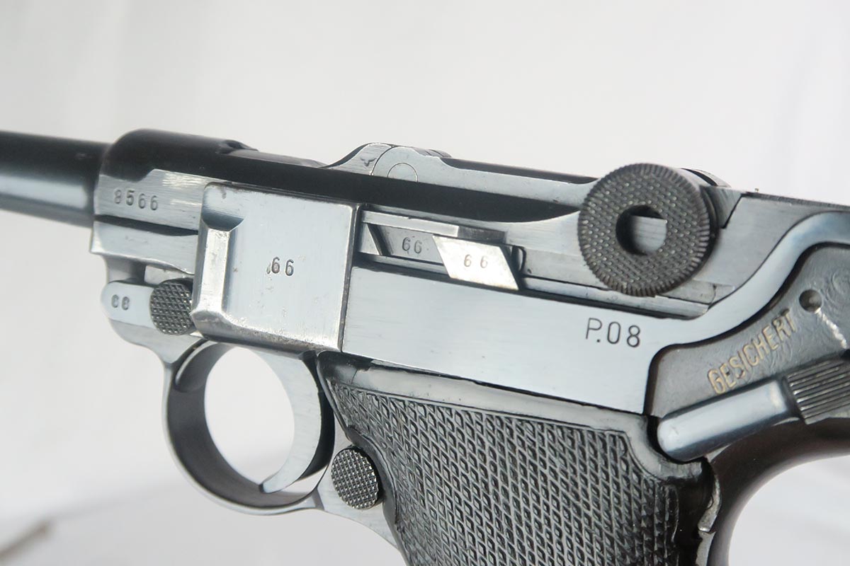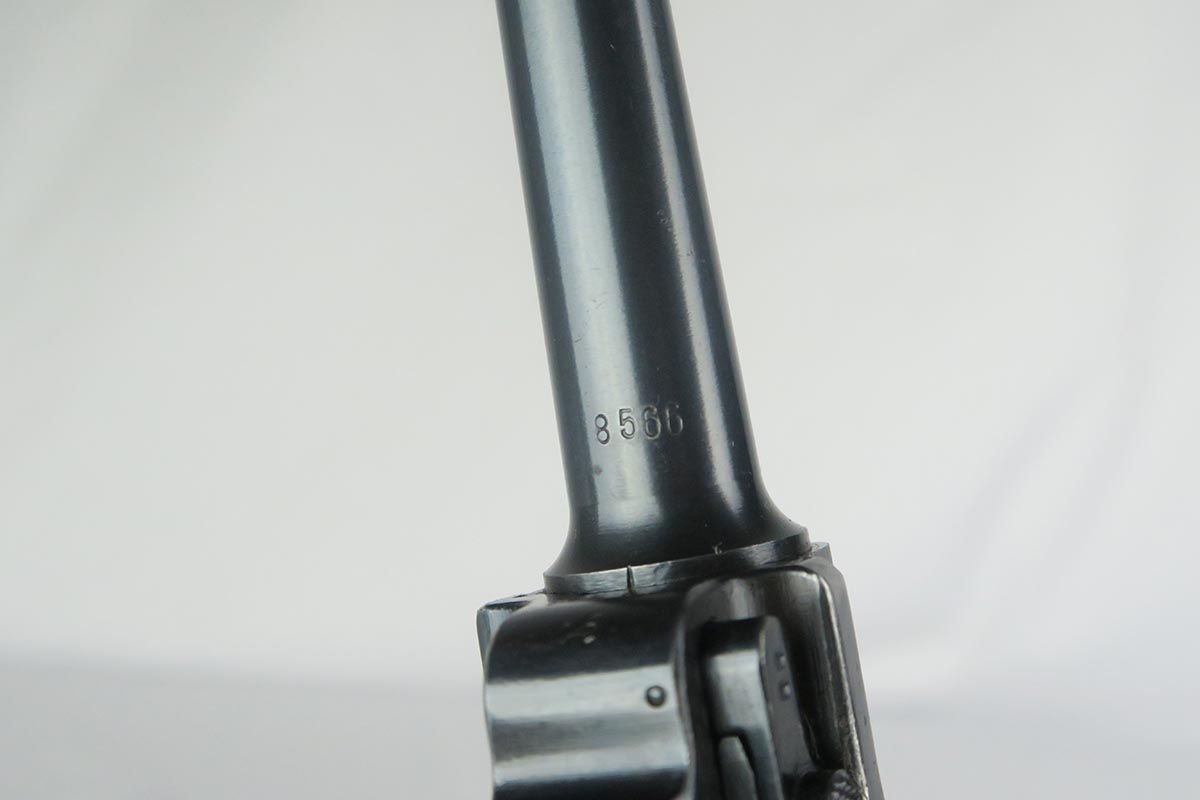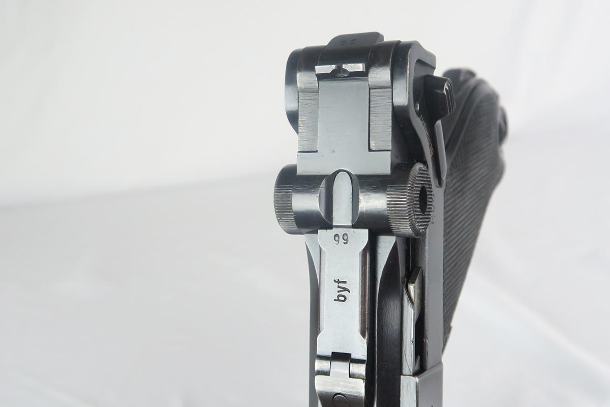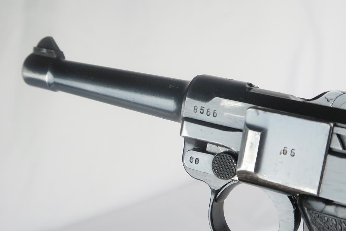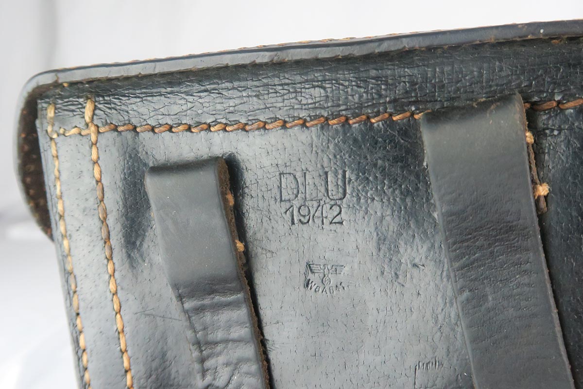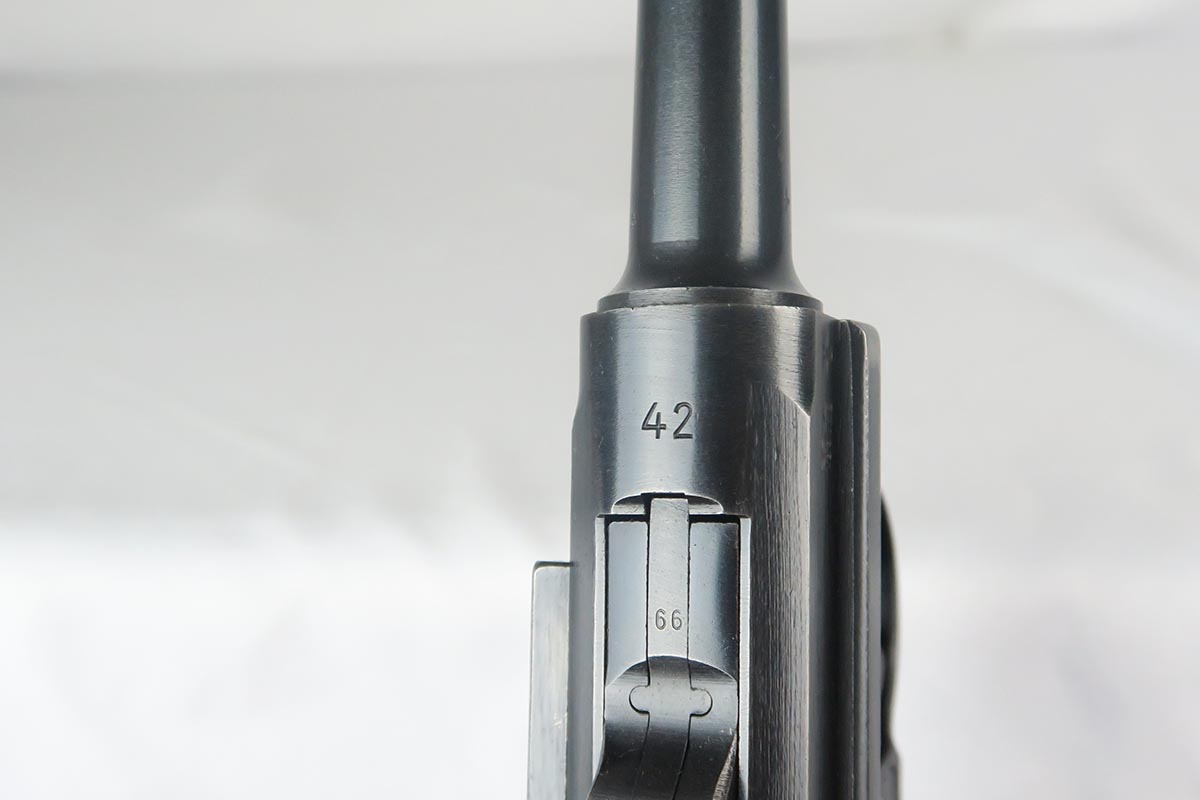 1/19/18 – This is an original Mauser BYF 42 “Black Widow” Luger, complete with two original “fxo” stamped black widow magazines, eagle/135 tool, and a pigskin leather holster. The pistol is all correct and matching with about 95+% of bluing still in tact. Most of the wear can be found on the side plate and on the back strap of this pistol. The side plate has some speckling around the edges and near the serial number “66”. The back strap has some light browning which is normal strap wear and not excessive. The rest of the frame is excellent with beautiful dark bluing. The barrel has some light wear as well, mostly near the muzzle which is normal. The bore has light signs of use but overall is nice with strong rifling and would function properly with no issues. The left grip panel is a little loose on the pistol, and can be jostled lightly back and forth. The right panel fits snug and has no issues. Both panels are guaranteed original. The holster has some light surface wear and cracking near the front toe, but overall is in great condition and a scarce variation Luger holster.