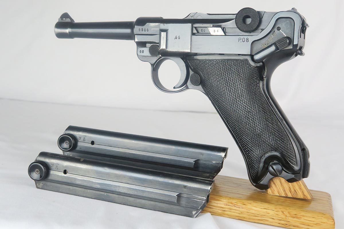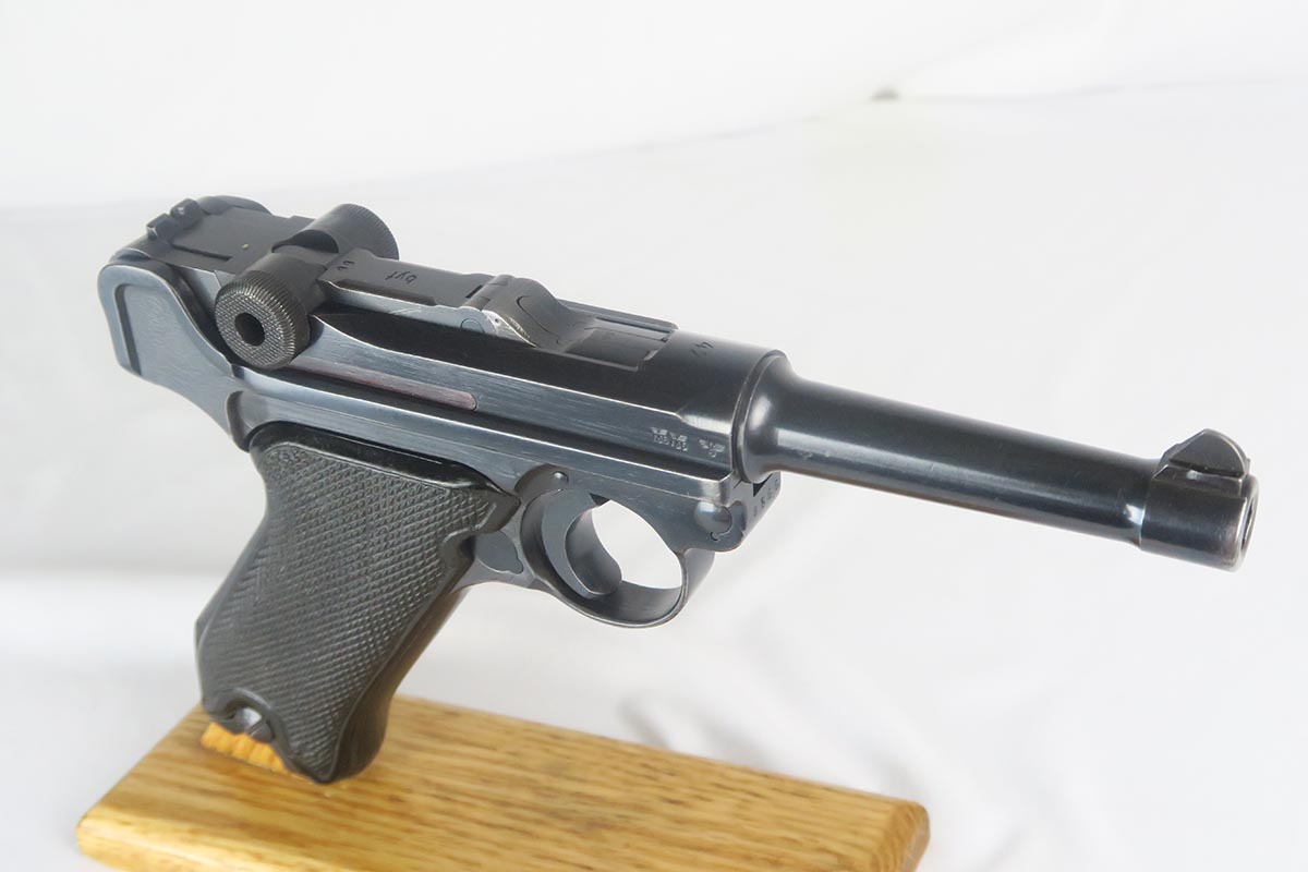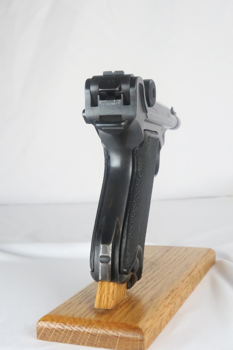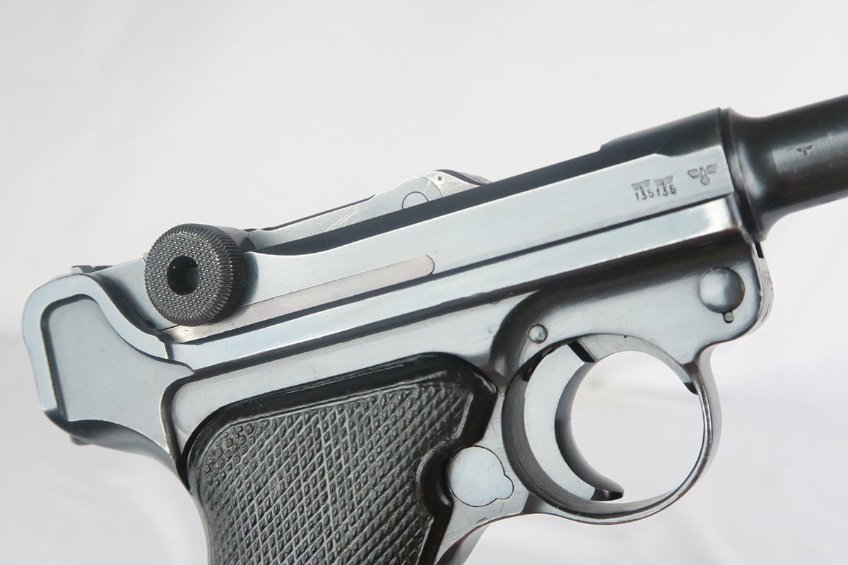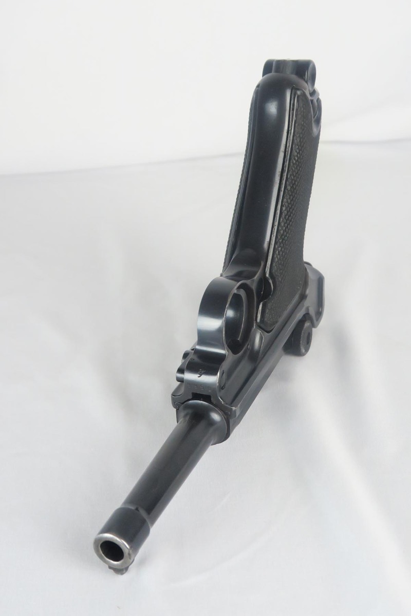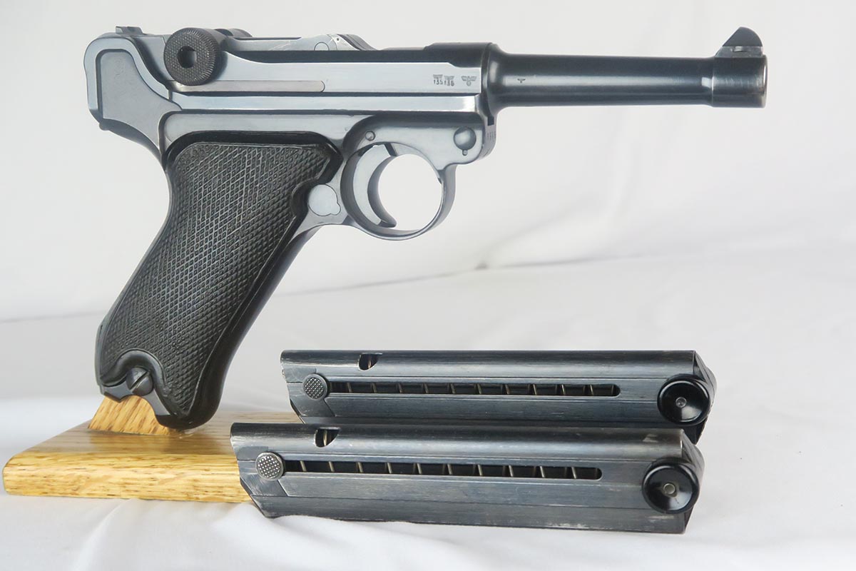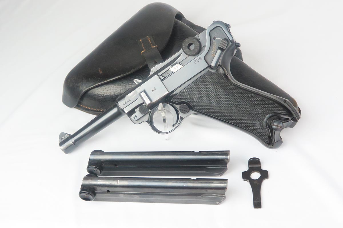 1/19/18 – This is an original Mauser BYF 42 “Black Widow” Luger, complete with two original “fxo” stamped black widow magazines, eagle/135 tool, and a pigskin leather holster. The pistol is all correct and matching with about 95+% of bluing still in tact. Most of the wear can be found on the side plate and on the back strap of this pistol. The side plate has some speckling around the edges and near the serial number “66”. The back strap has some light browning which is normal strap wear and not excessive. The rest of the frame is excellent with beautiful dark bluing. The barrel has some light wear as well, mostly near the muzzle which is normal. The bore has light signs of use but overall is nice with strong rifling and would function properly with no issues. The left grip panel is a little loose on the pistol, and can be jostled lightly back and forth. The right panel fits snug and has no issues. Both panels are guaranteed original. The holster has some light surface wear and cracking near the front toe, but overall is in great condition and a scarce variation Luger holster.
