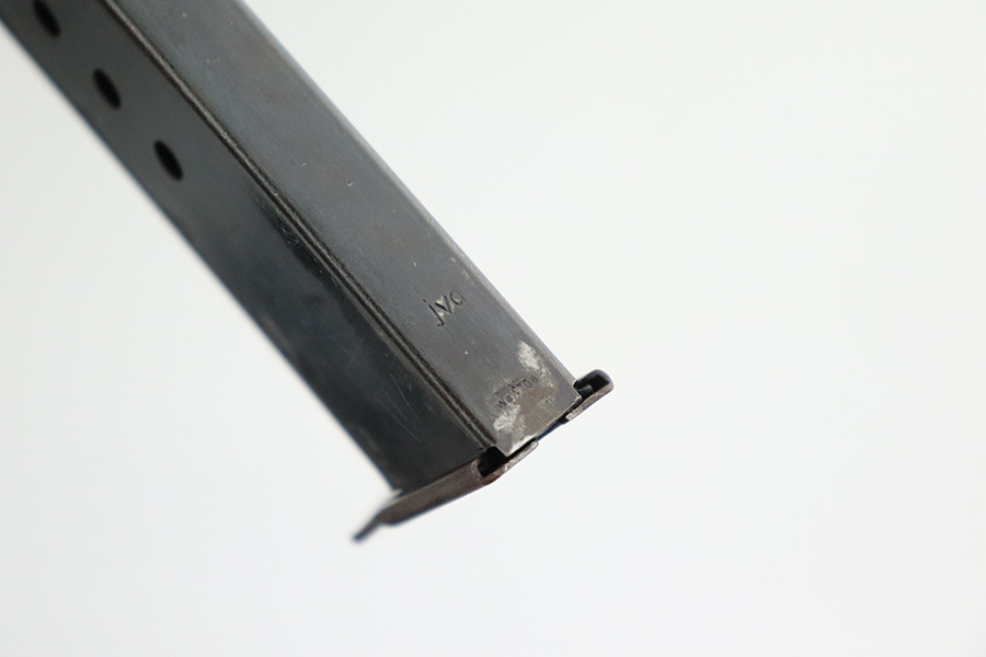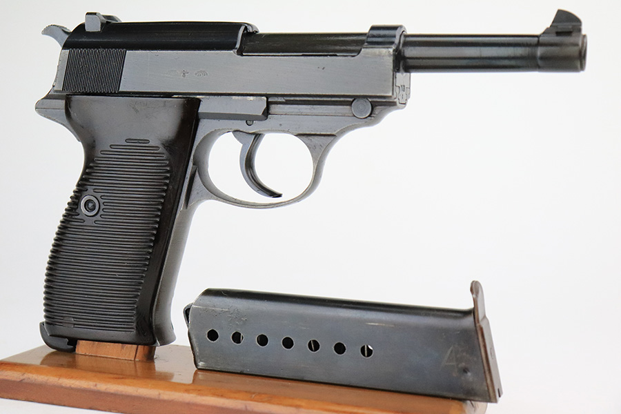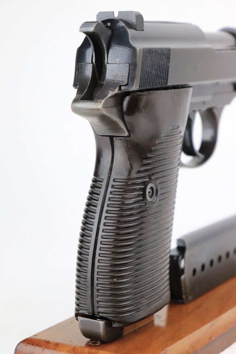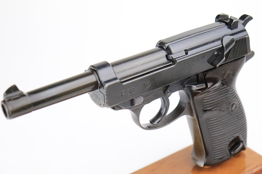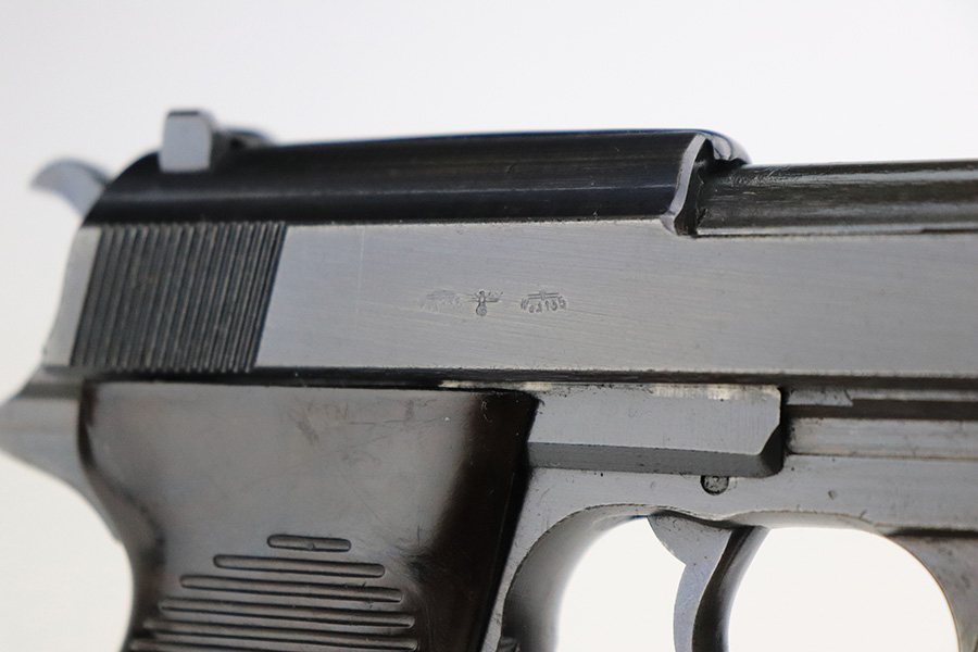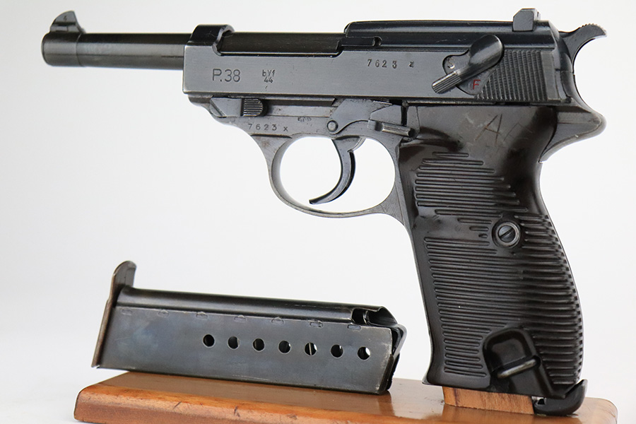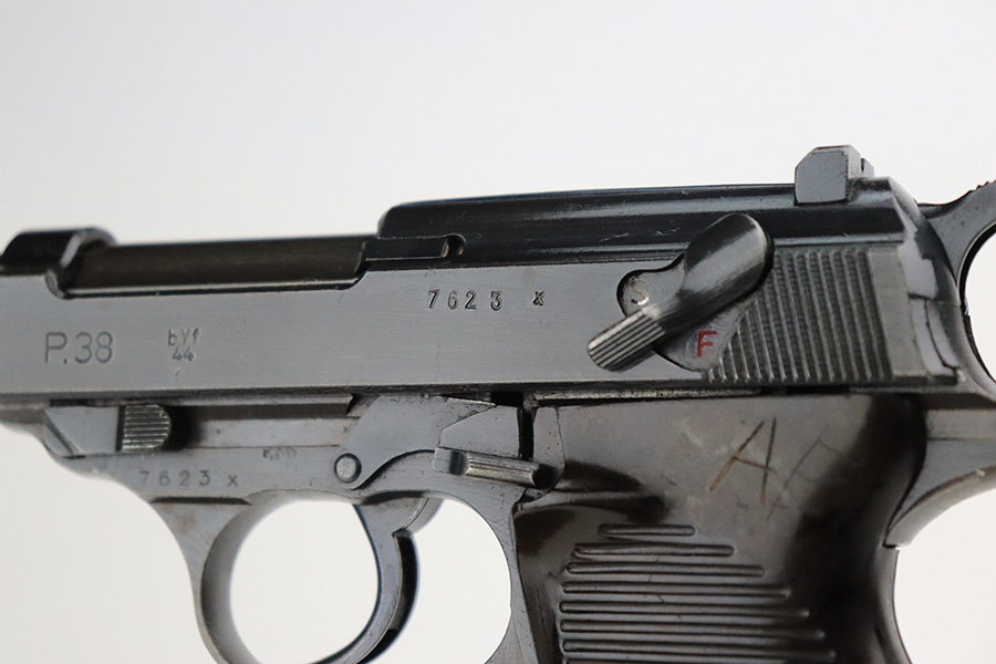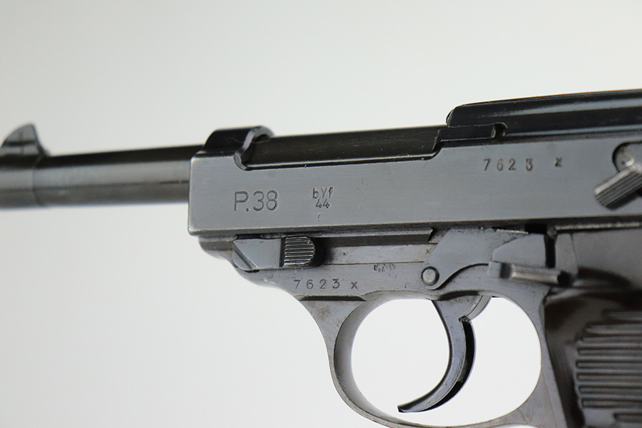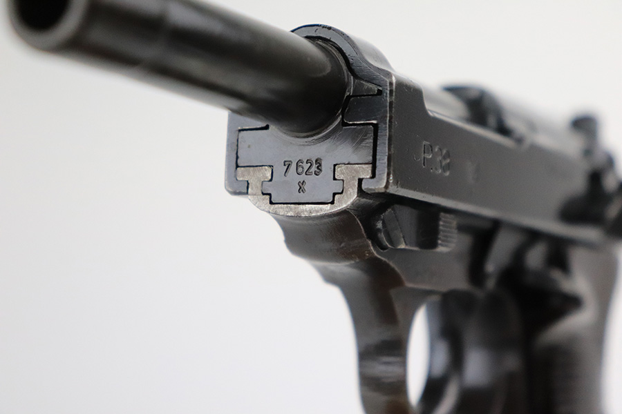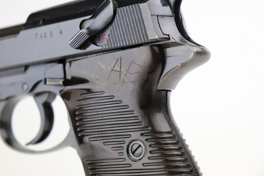 6/8/22 – This is a very nice example of a BYF 44 Mauser P.38 issued to the Nazi military in 1944. It is all matching and has the proper “Waffen 135” military acceptance proofs throughout. It has retained about 90% of its original finish. The majority of the finish loss is on the front strap, but there is also very minor wear on the front edges of the slide and around the muzzle. Some tiny dots of oxidation under the finish here and there. Comes with nice bakelite grips and a period-correct “jvd” magazine. The initials “AE” are lightly scratched into the left grip panel and the tube of the magazine. The bore has strong rifling with minor frosting in the grooves. De-cocker is functional.