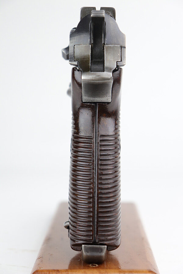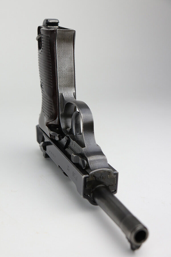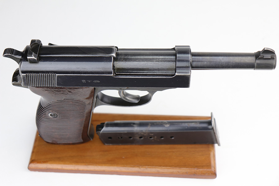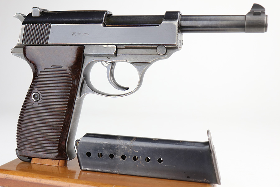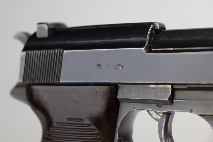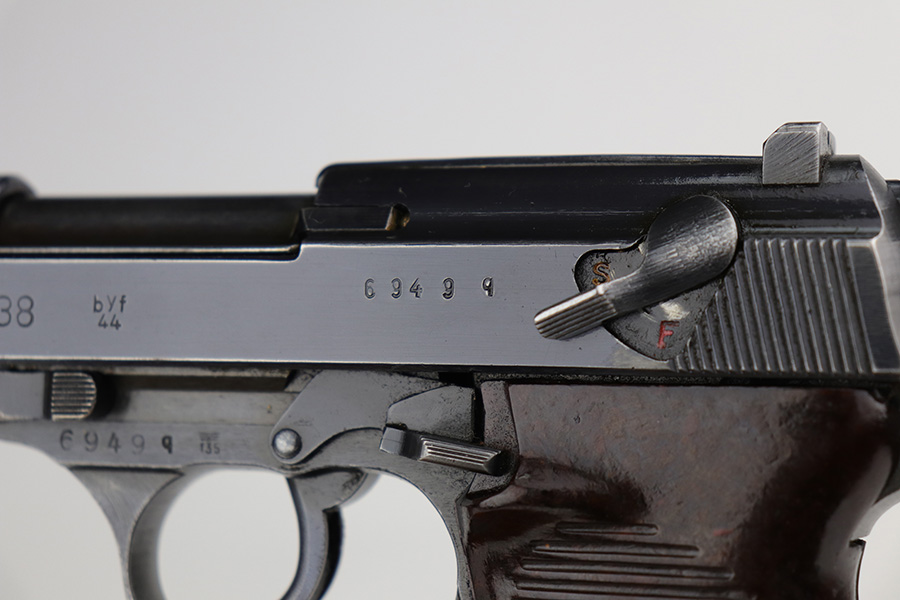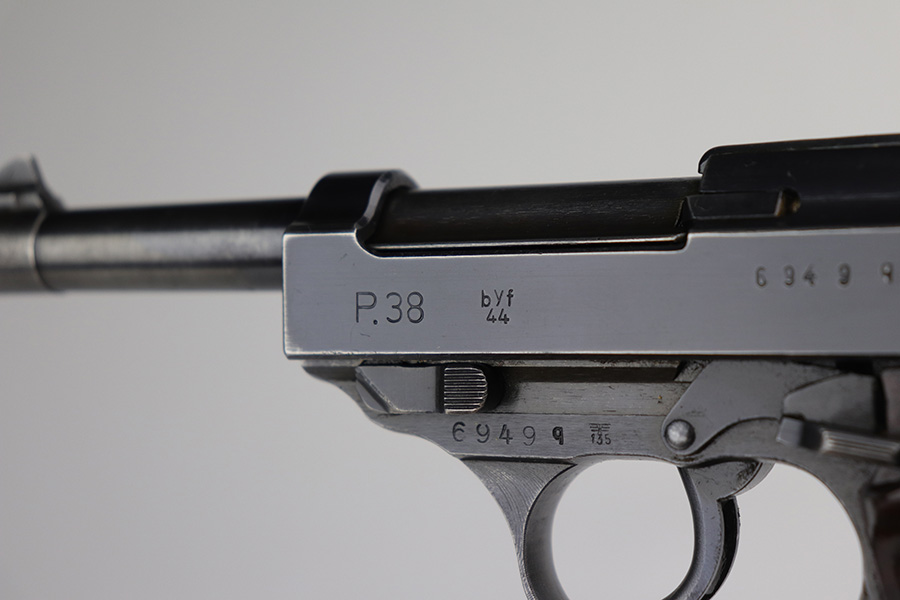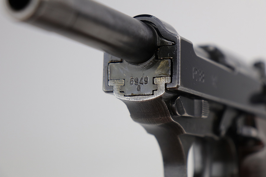 9/10/21 – This is a very nice example of a scarce Mauser P.38 issued to the Nazi military in 1944. It is all matching and has mixed Nazi military proofs on the right side of the slide “Eagle 135” and “Waffen Eagle 135”. It is in the correct “q” serial block for this variation. It has retained about 92% of its original finish. Most of the wear is on the front strap, but there is also minor thinning on the barrel and very minor wear on the high edges of the slide and around the muzzle. Comes with excellent reddish grips and a period-correct Mauser magazine. Excellent shiny bore with strong rifling and areas of very minor freckling here and there. De-cocker is functional.