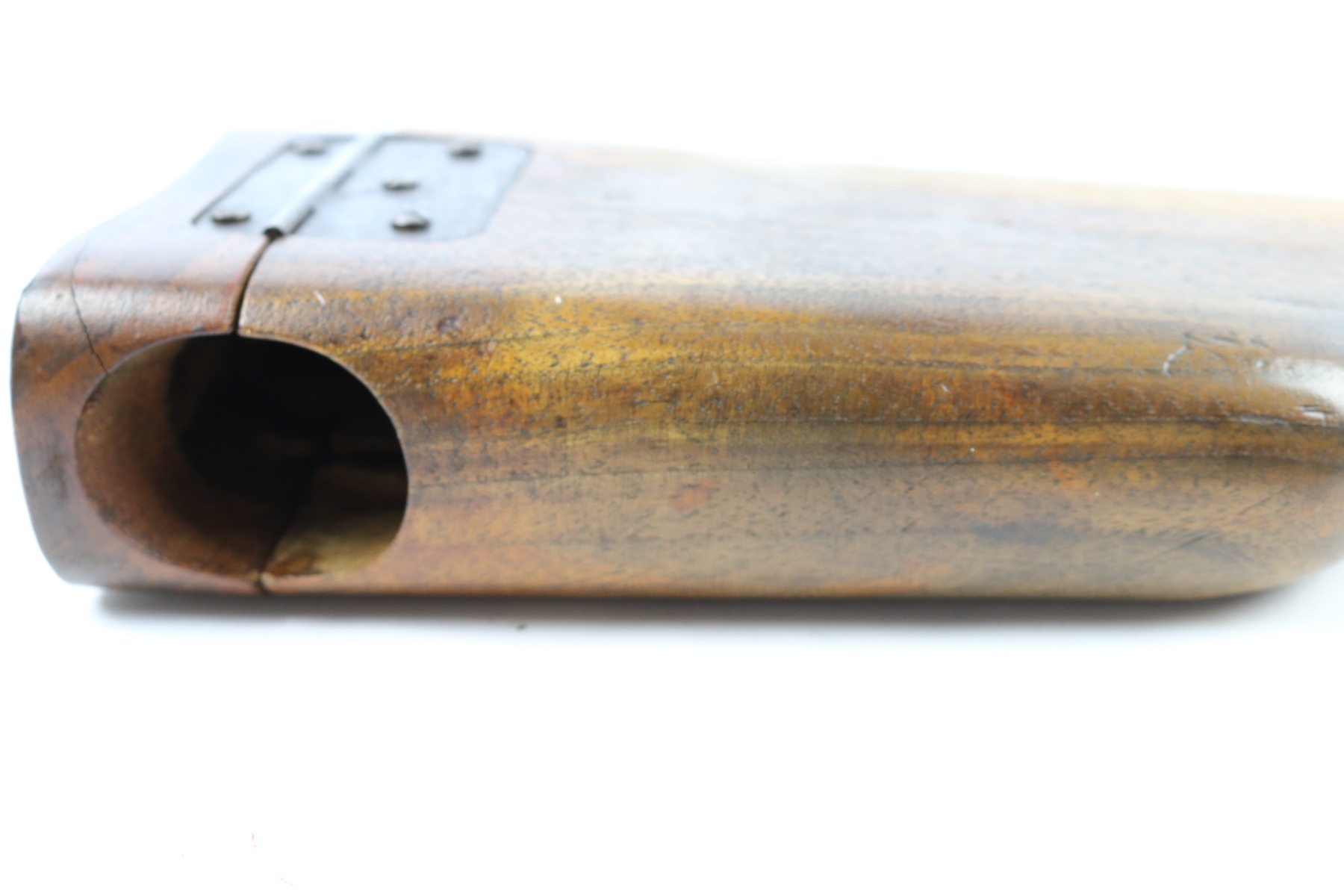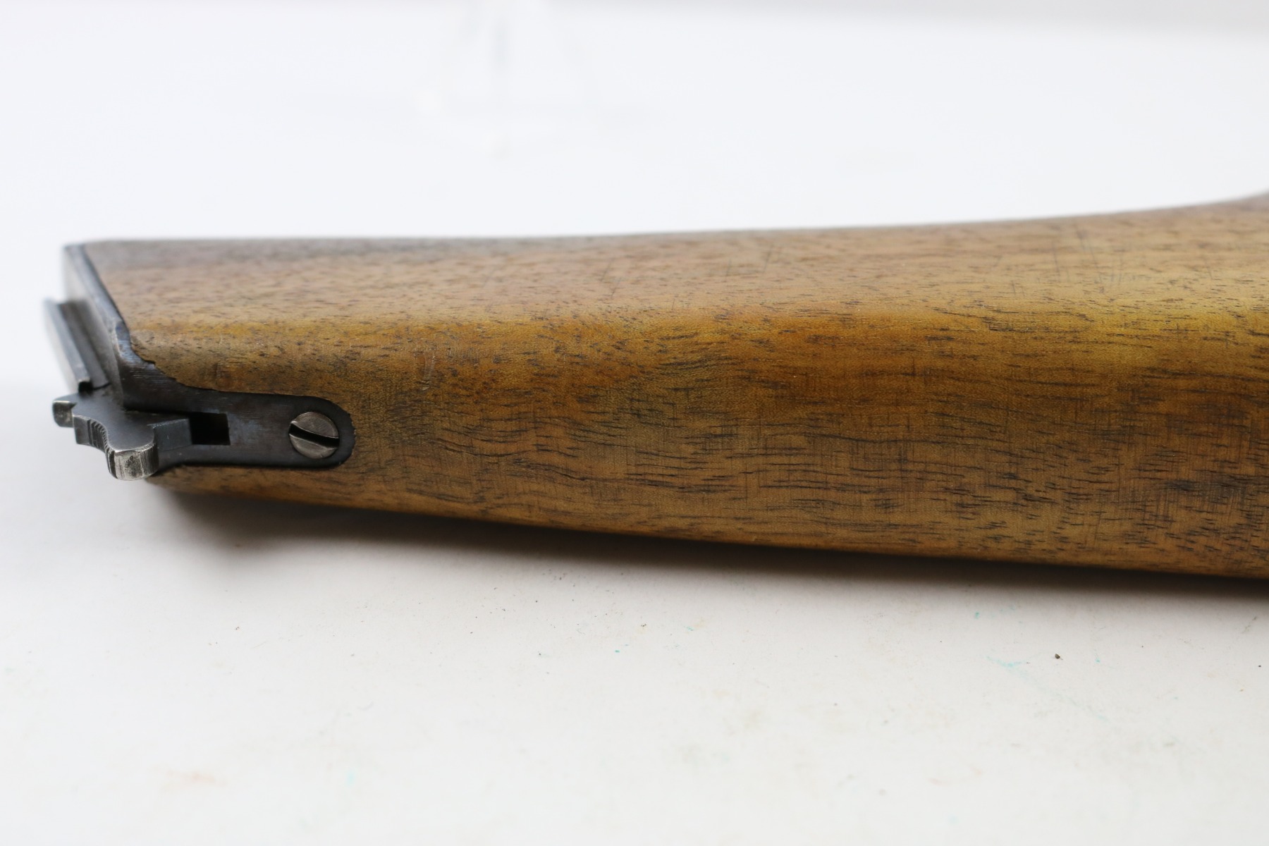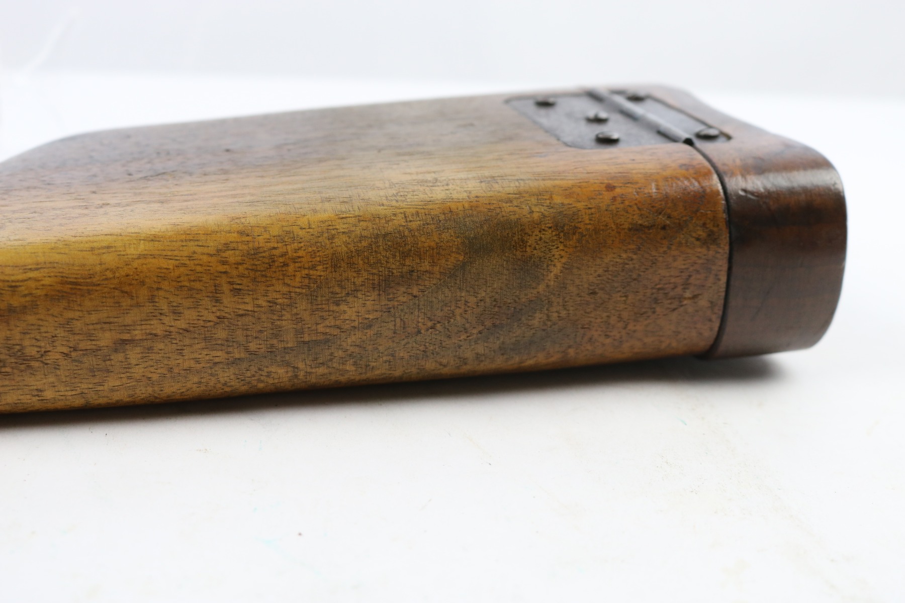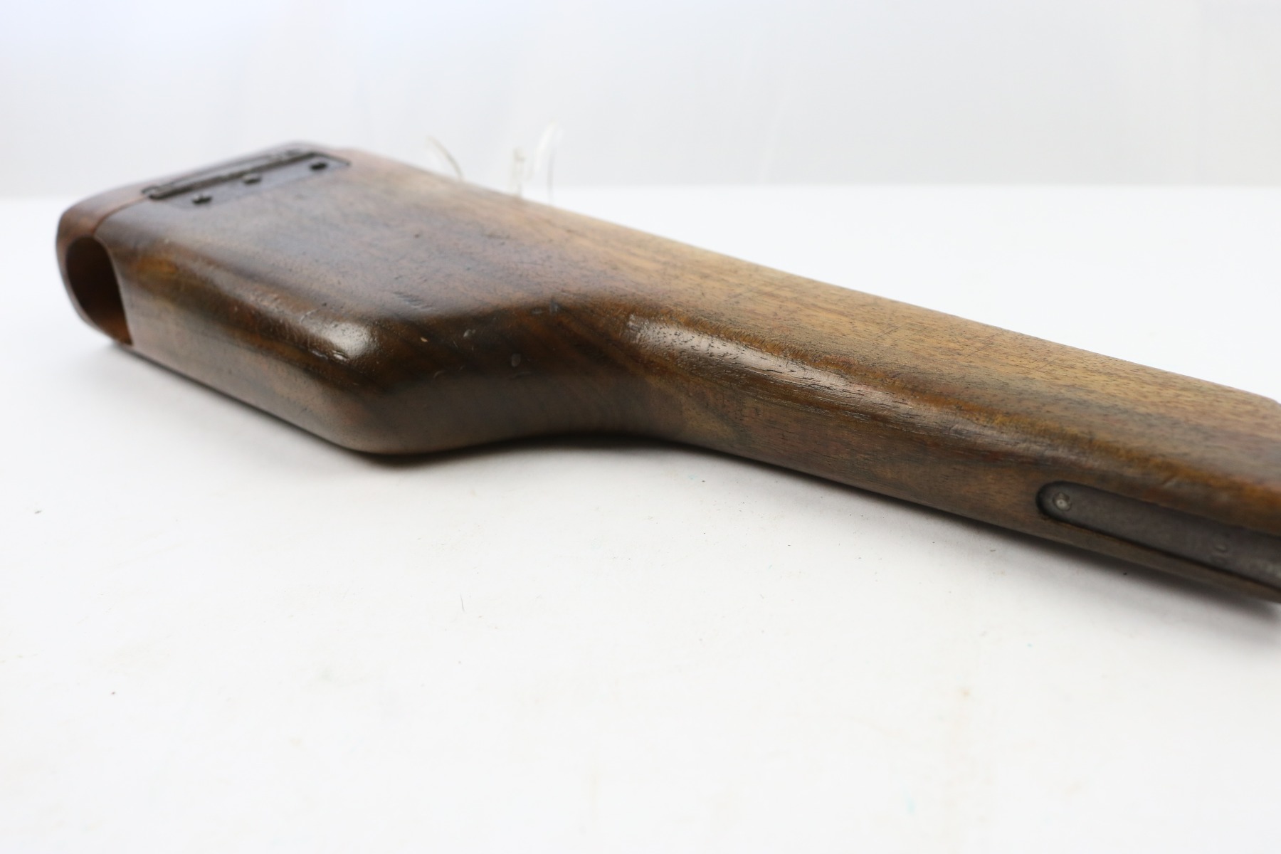 6/1/18 – This is an original Mauser Broomhandle shoulder stock / pistol holster. The wood is imperial proof stamped on one side. The metal has wear throughout. Mostly rust and discoloration. The metal is still functional and opens/shuts with ease as well as easily attaches / detaches to a C96. The wood is in great shape as well with only a few cracks in the lid / body (see photos). The metal is numbered “100” (lucky). Guaranteed original.