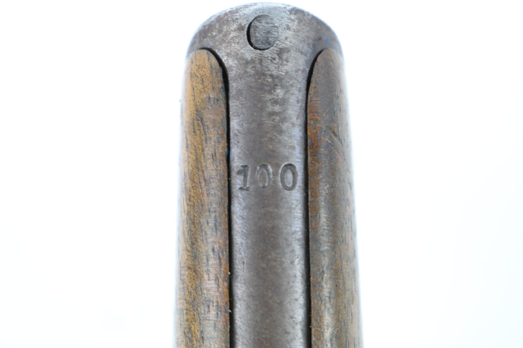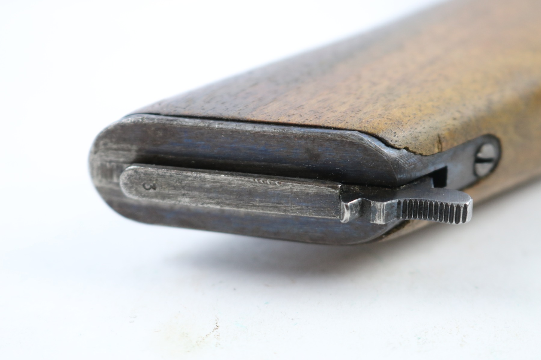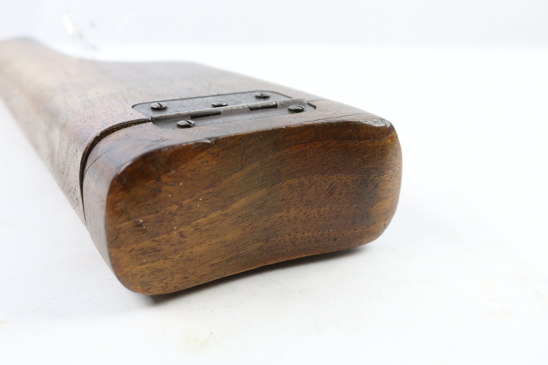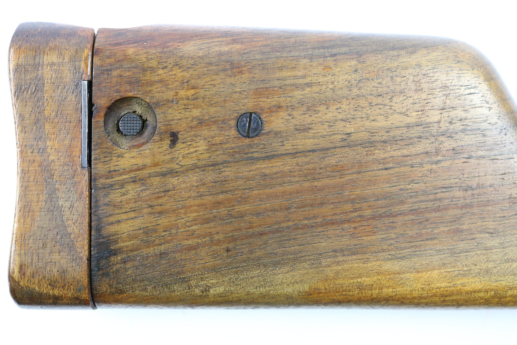 6/1/18 – This is an original Mauser Broomhandle shoulder stock / pistol holster. The wood is imperial proof stamped on one side. The metal has wear throughout. Mostly rust and discoloration. The metal is still functional and opens/shuts with ease as well as easily attaches / detaches to a C96. The wood is in great shape as well with only a few cracks in the lid / body (see photos). The metal is numbered “100” (lucky). Guaranteed original.