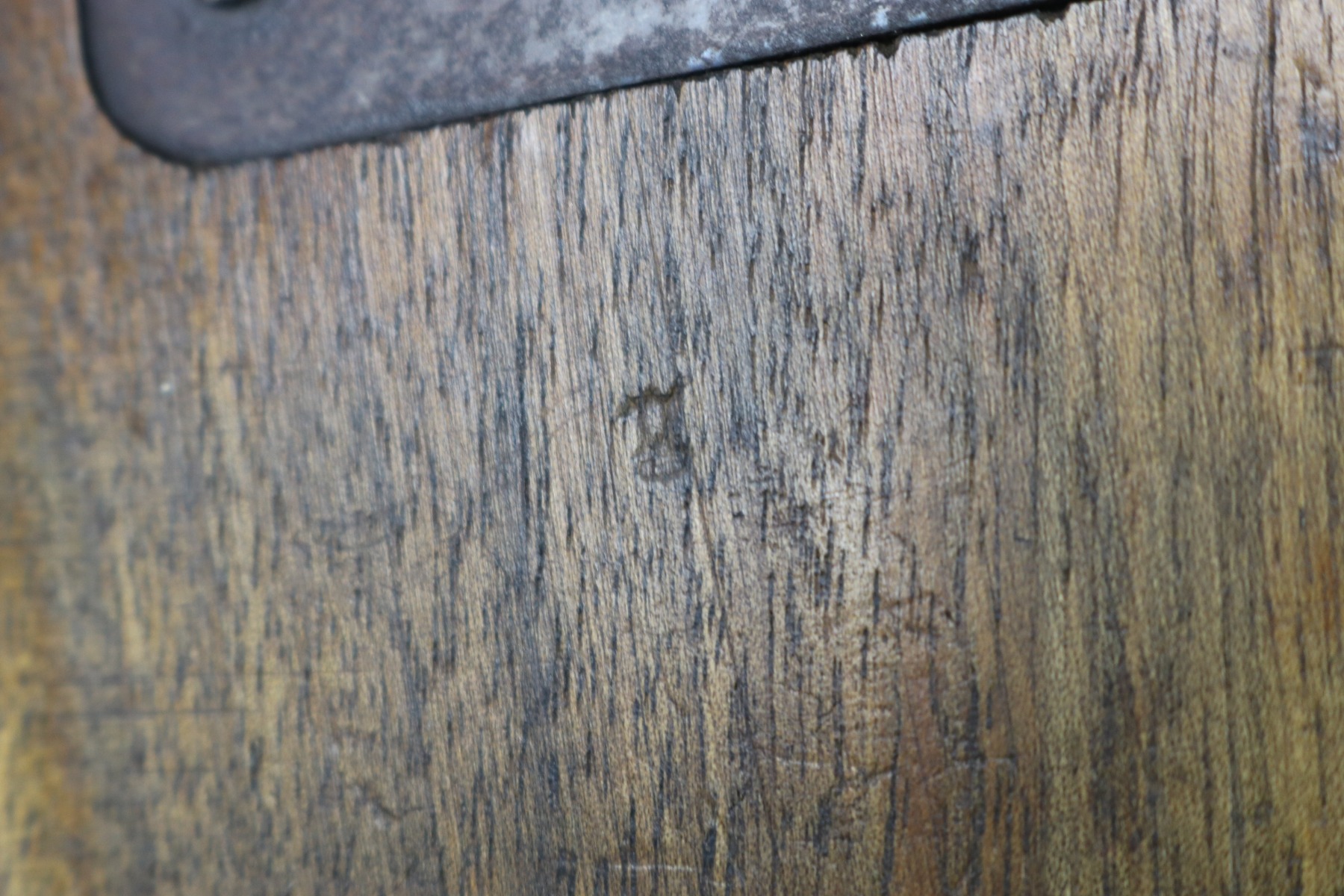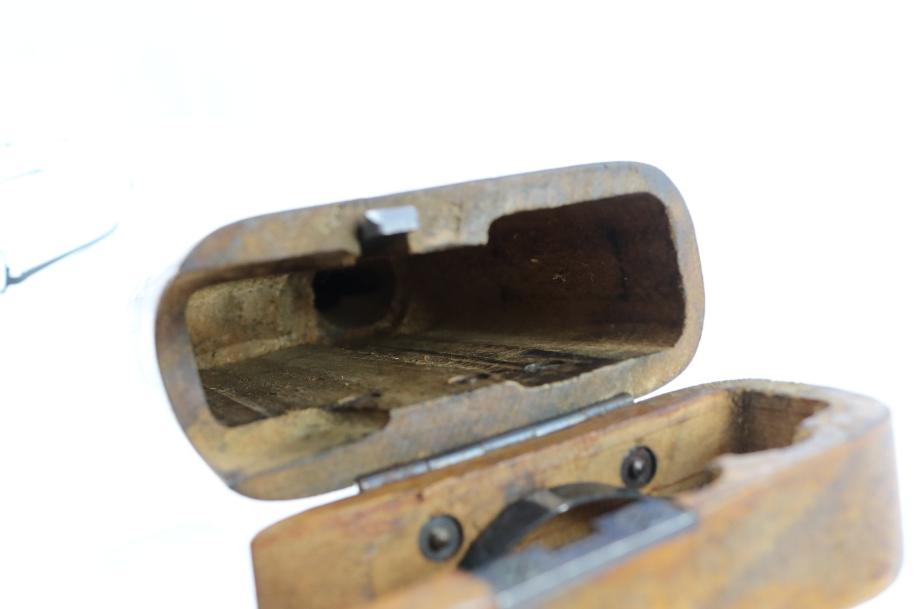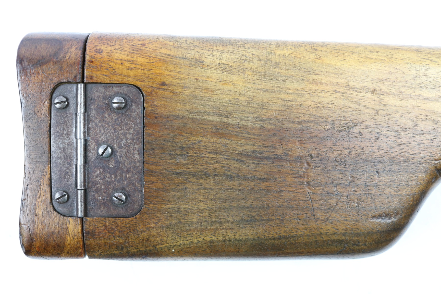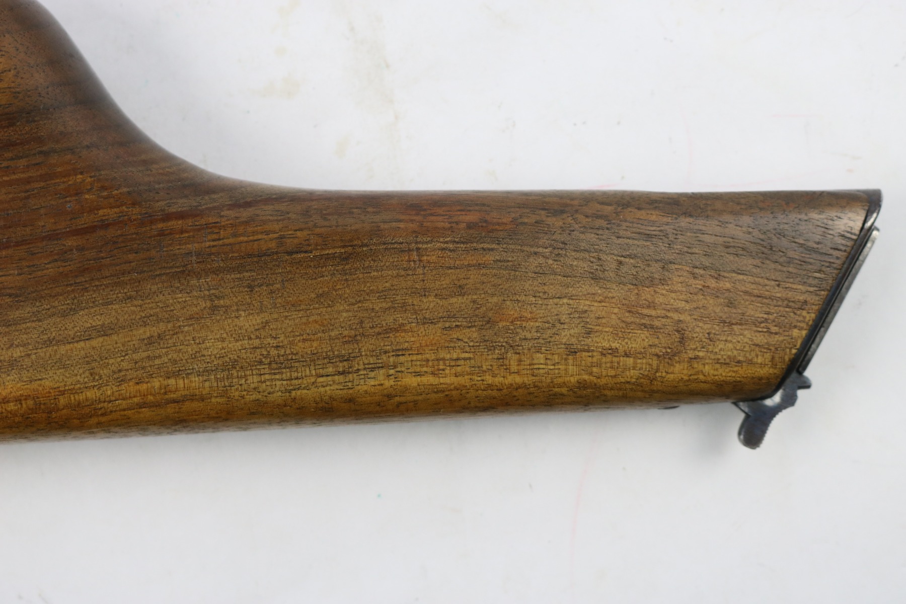 6/1/18 – This is an original Mauser Broomhandle shoulder stock / pistol holster. The wood is imperial proof stamped on one side. The metal has wear throughout. Mostly rust and discoloration. The metal is still functional and opens/shuts with ease as well as easily attaches / detaches to a C96. The wood is in great shape as well with only a few cracks in the lid / body (see photos). The metal is numbered “100” (lucky). Guaranteed original.