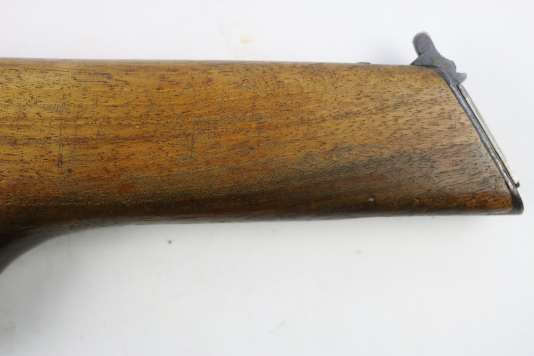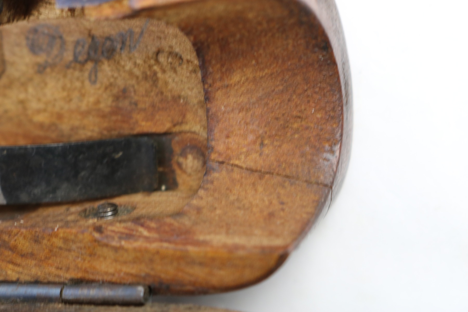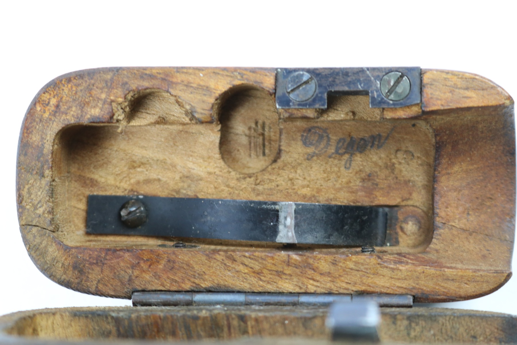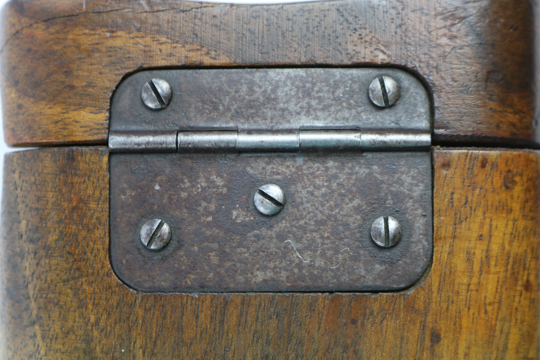 6/1/18 – This is an original Mauser Broomhandle shoulder stock / pistol holster. The wood is imperial proof stamped on one side. The metal has wear throughout. Mostly rust and discoloration. The metal is still functional and opens/shuts with ease as well as easily attaches / detaches to a C96. The wood is in great shape as well with only a few cracks in the lid / body (see photos). The metal is numbered “100” (lucky). Guaranteed original.