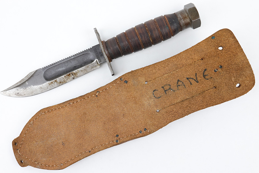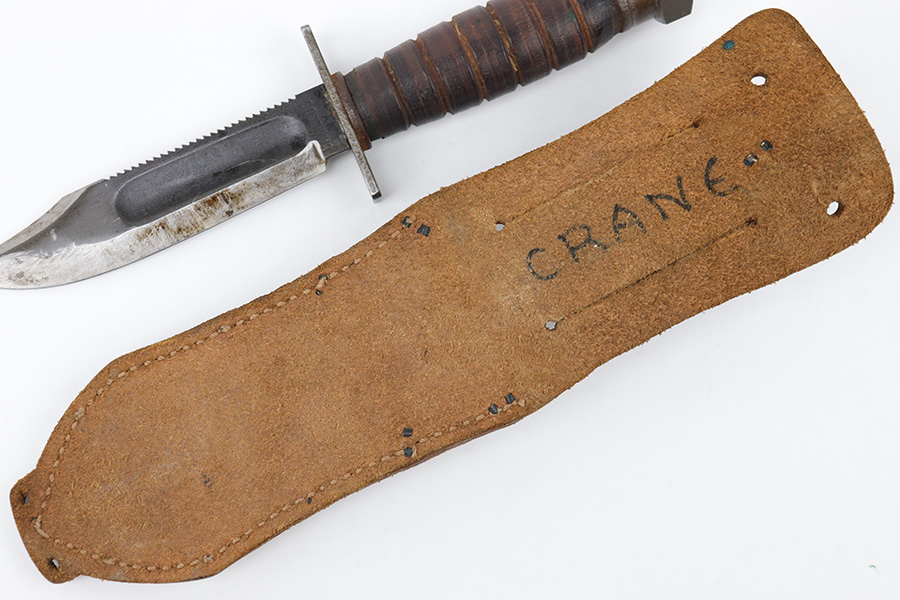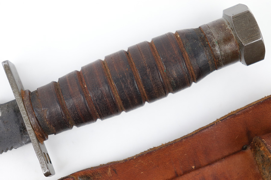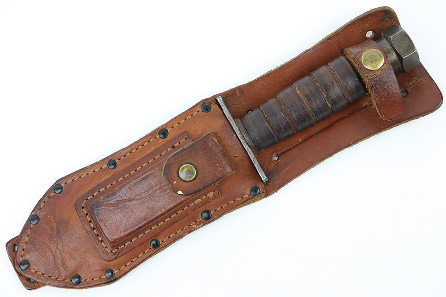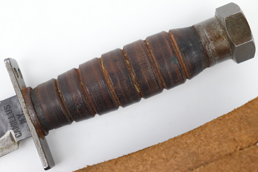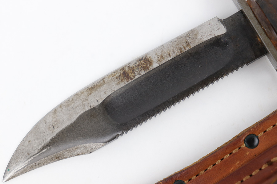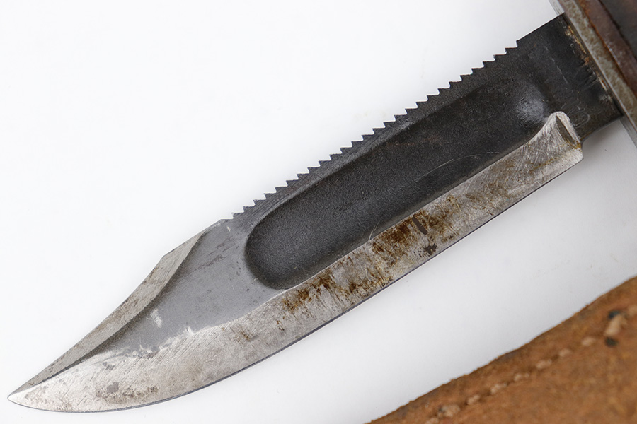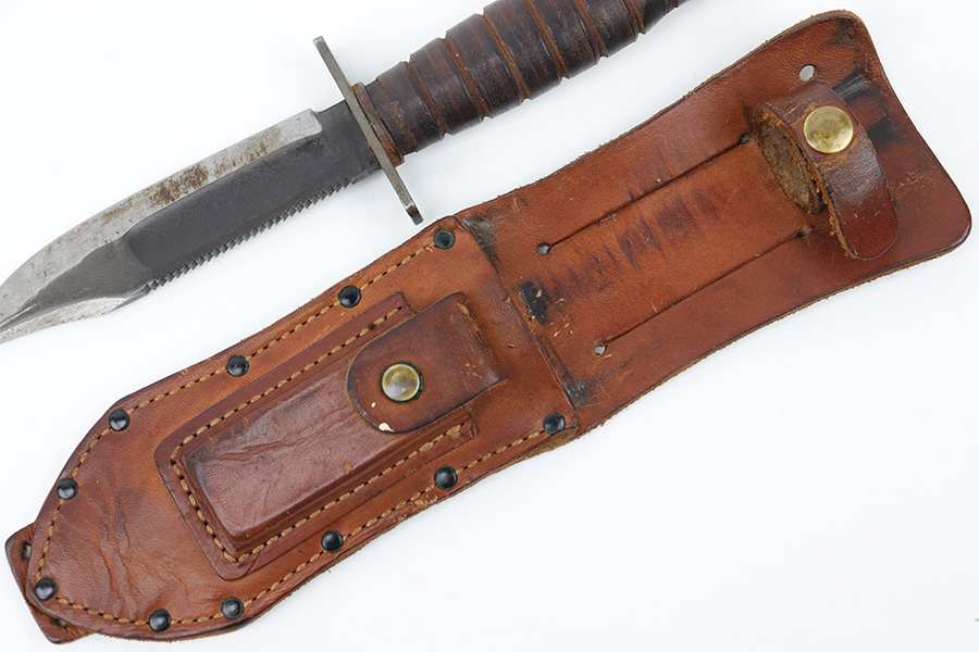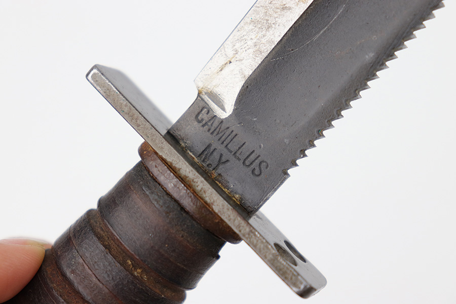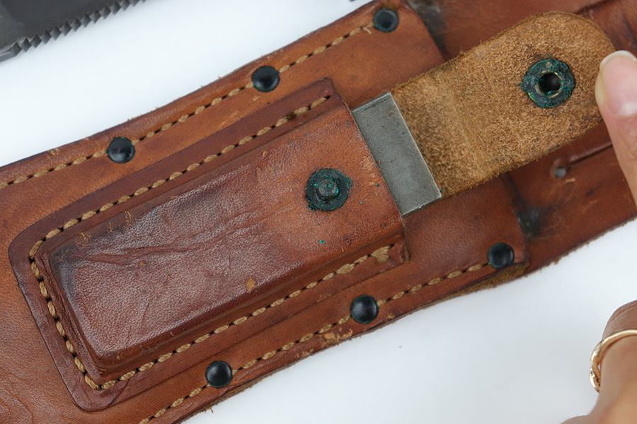 4/5/23 – This is an original Camillus Survival Knife with leather sheath and sharpening stone. This was an early Vietnam era utility knife used by US Pilots. Often referred to as a Pilot Survival knife. This example is in great overall condition with some honest wear and signs of use throughout the blade. The edge has been sharpened but is clean with no nicks or notable dings. Most of the wear is shown on the blade surface, and there’s no rust or pitting. The handle is in great condition. The metal hand guard and pommel show typical surface patina, but no excessive wear.
